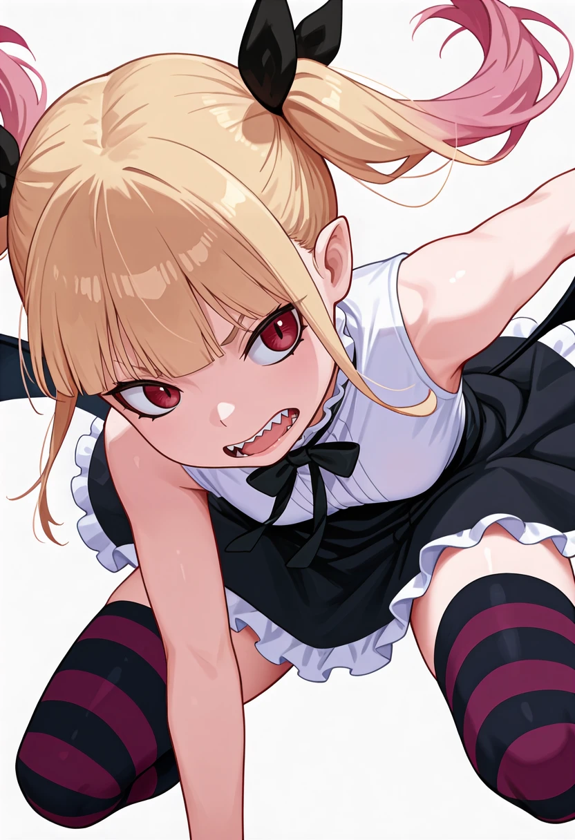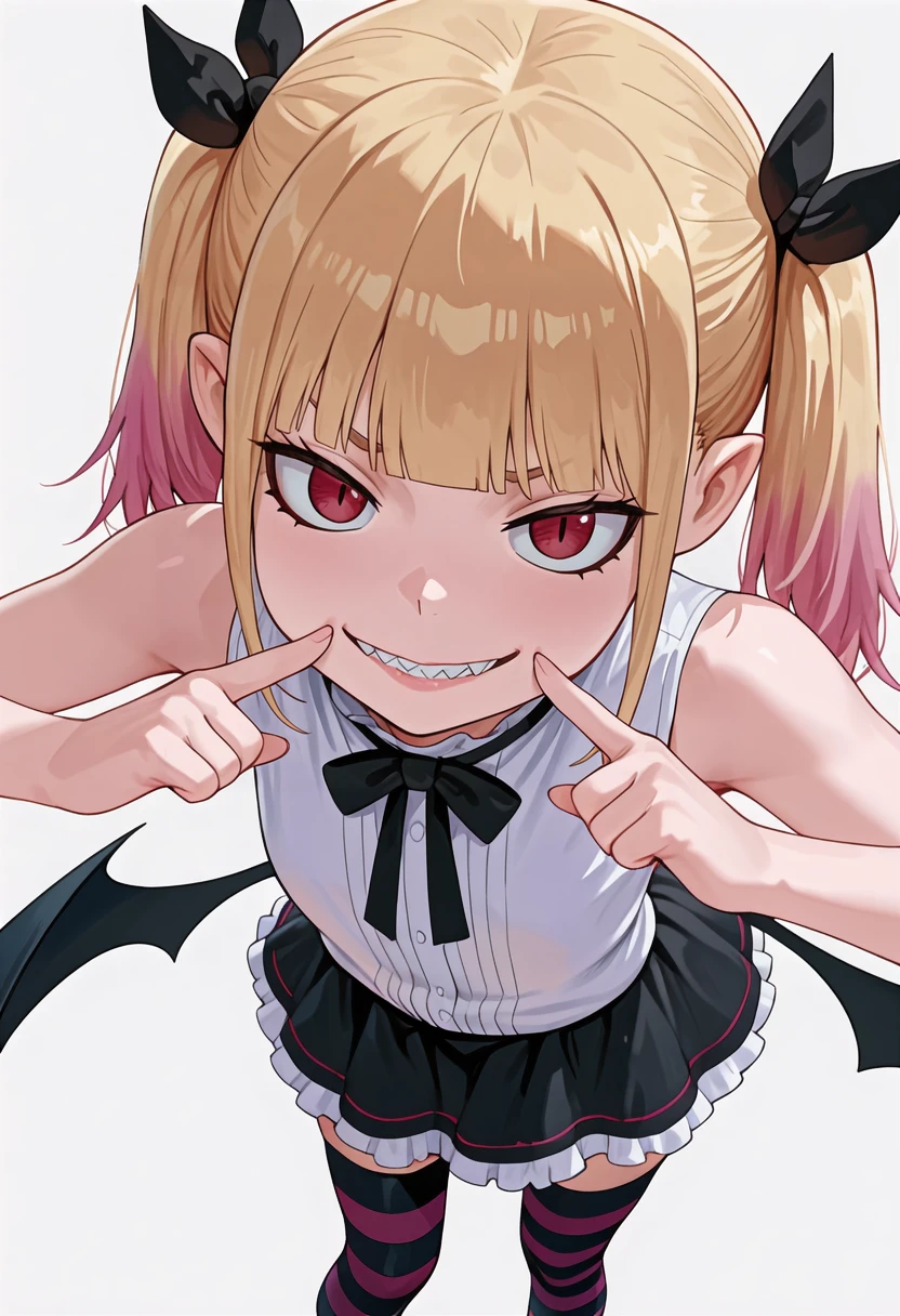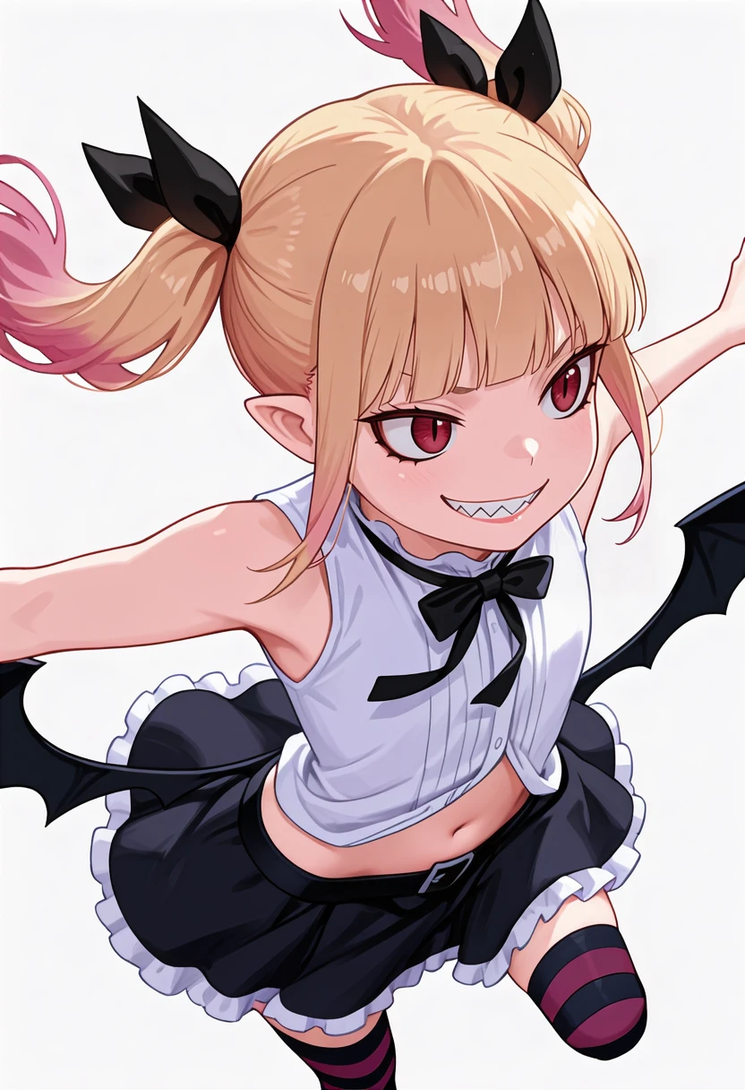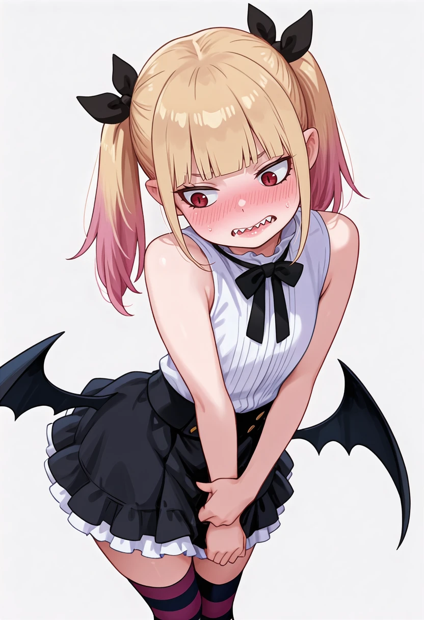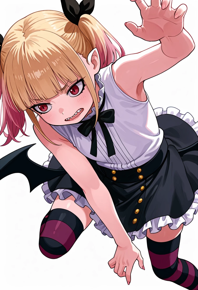 peschutz_cnr, 1girl,blonde hair, twintails, multicolored hair, red eyes, pink hair, blunt bangs, sharp teeth, vampire, low wings, sidelocks, fangs, slit pupils,hair ribbon,