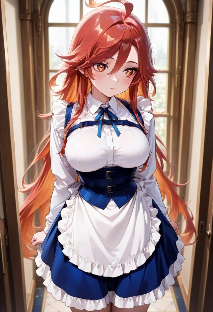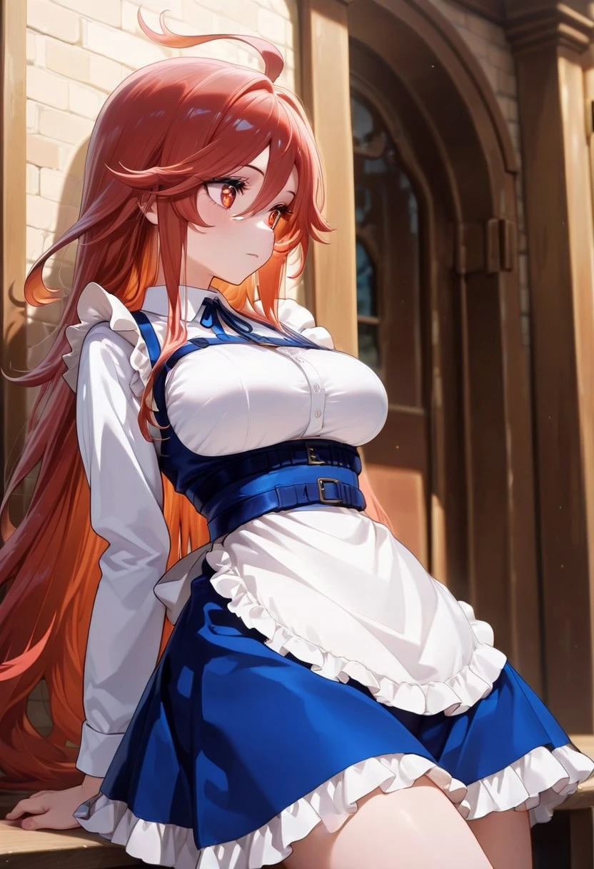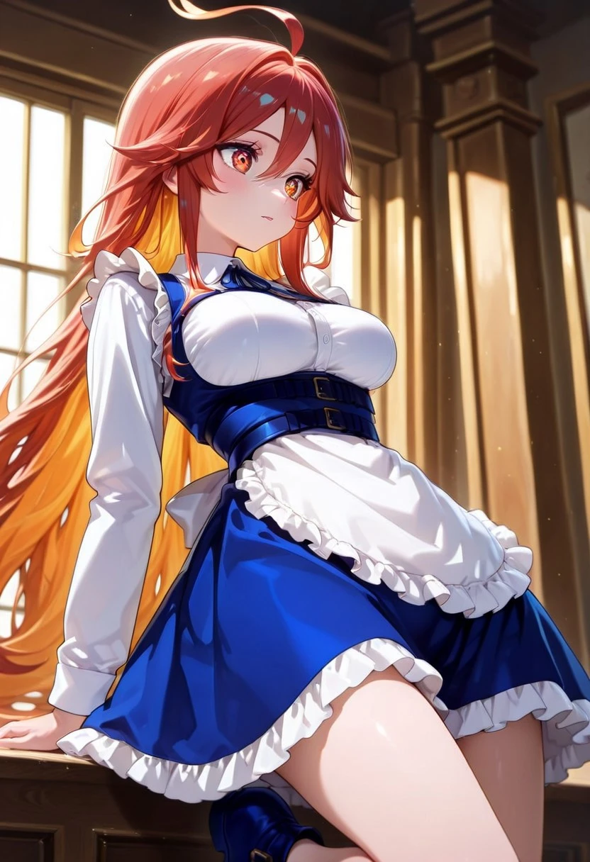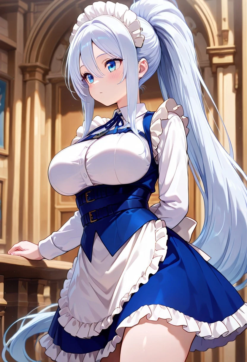 slphlnglsclstyl, frilled dress,blue dress, long dress,white shirt,collared shirt,neck ribbon,blue ribbon,long sleeves,blue corset,belt,maid apron,waist apron,frilled apron,white apron,frilled skirt,blue footwear