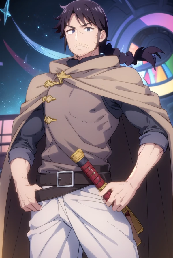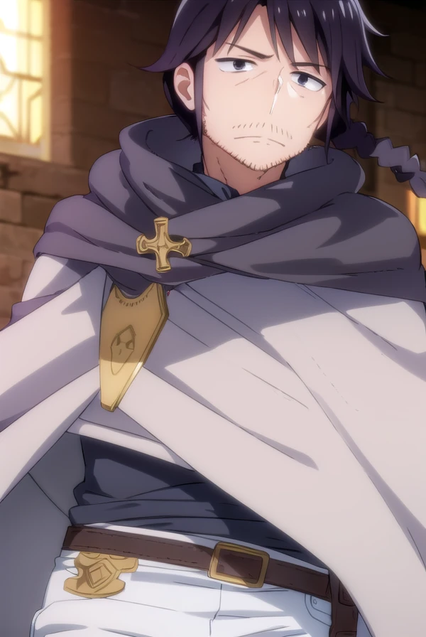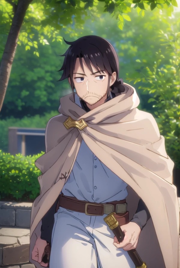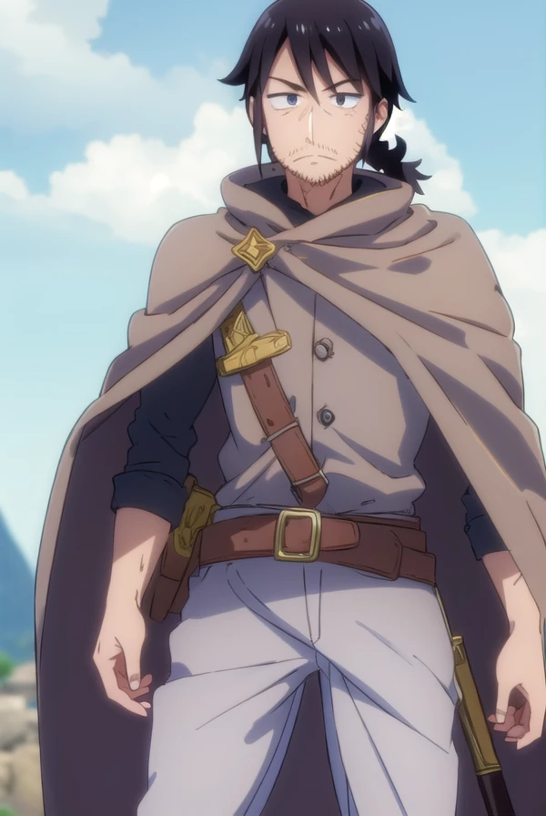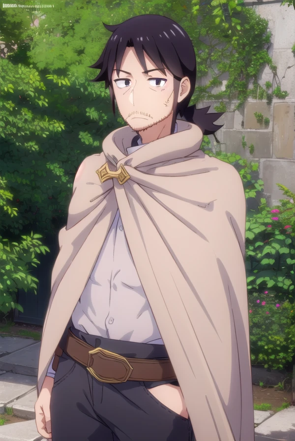 stunk, black hair, male focus, facial hair, beard, stubble, (black eyes:1.5),