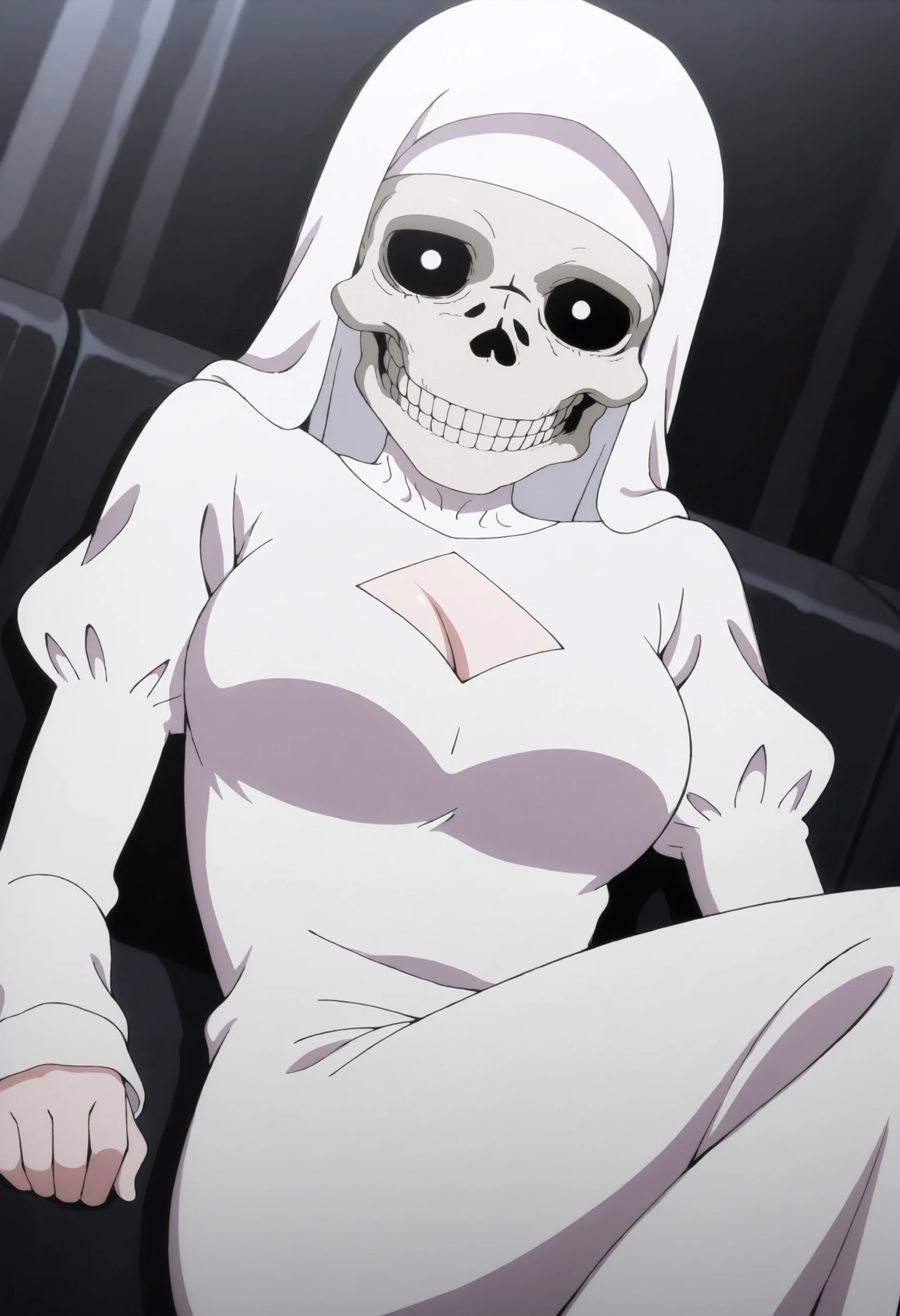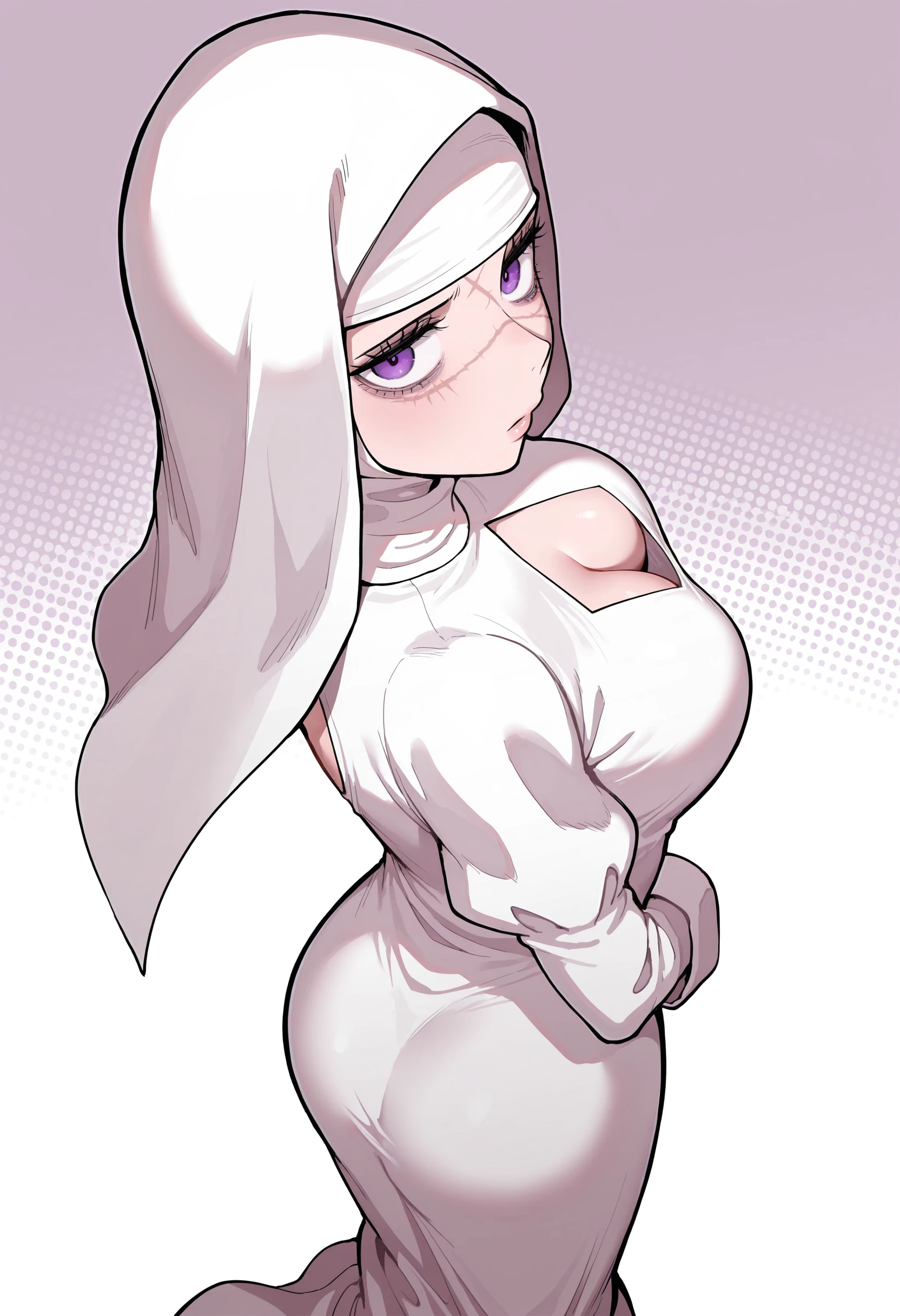 Trigger words: Dalethwaifu, purple eyes, scar, long sleeves, puffy sleeves, white long dress, cleavage cutout, habit, nun