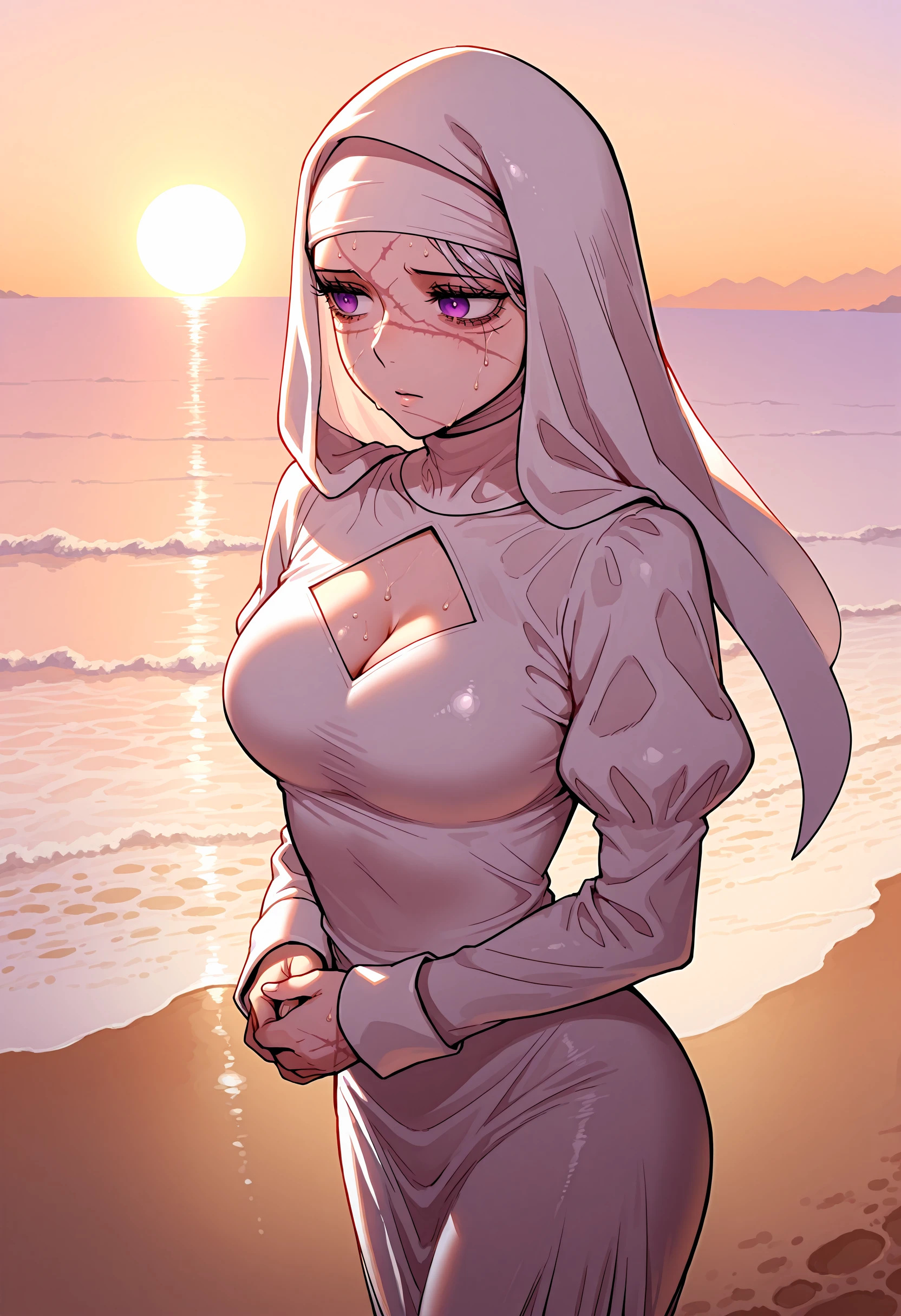 Dalethwaifu, purple eyes, scar, long sleeves, puffy sleeves, white long dress, cleavage cutout, habit, nun