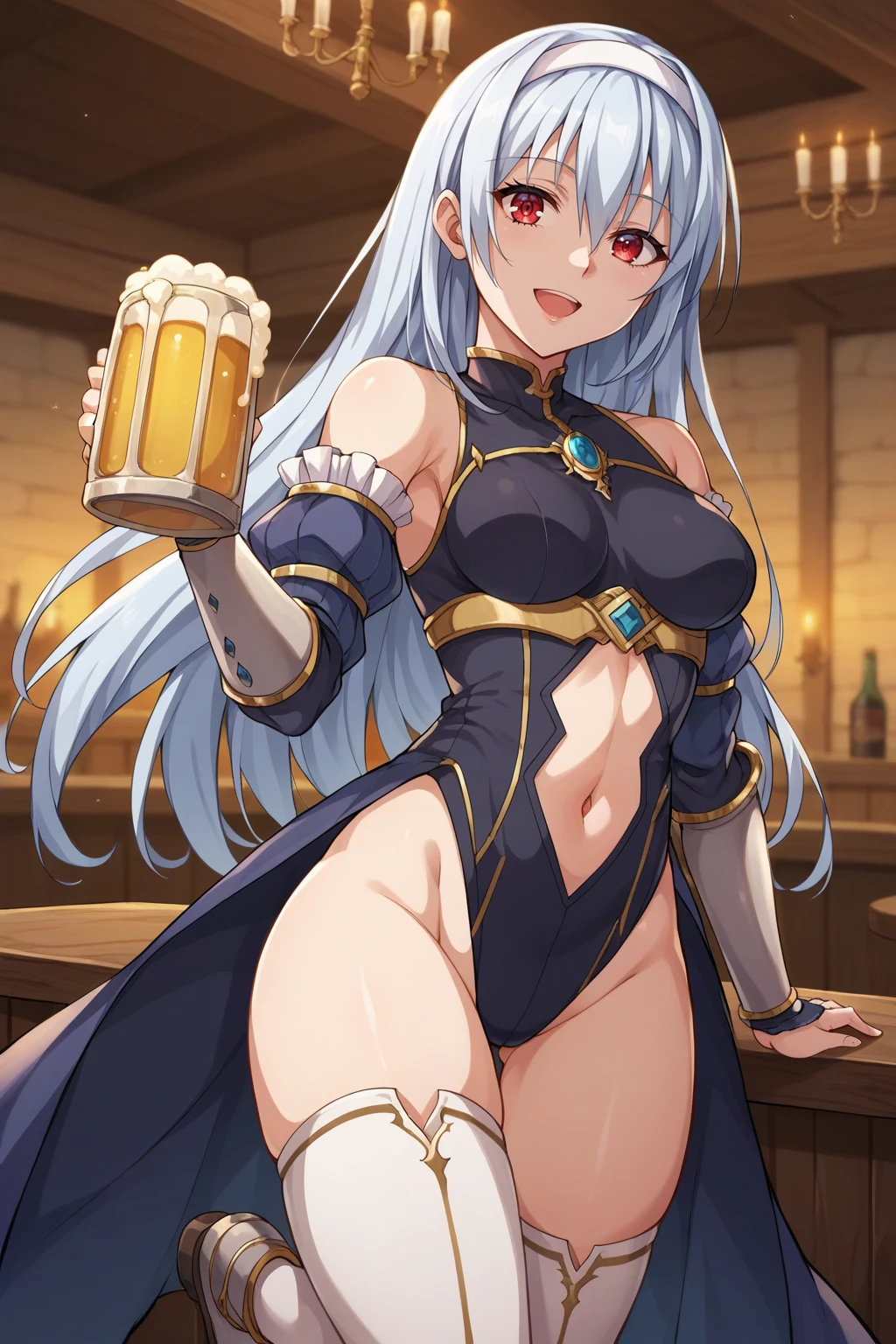 KJOliora, white hair, red eyes, long hair, hair between eyes, hairband,