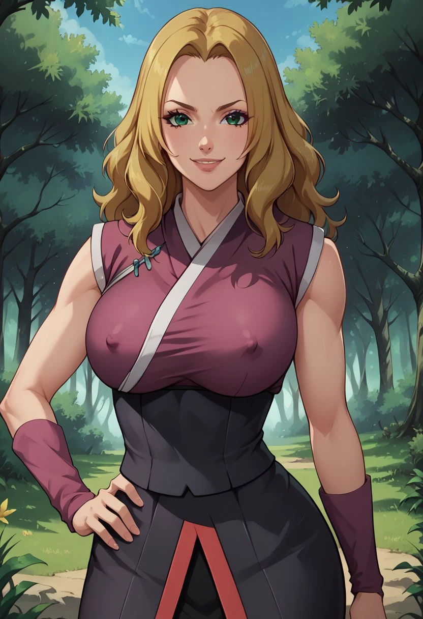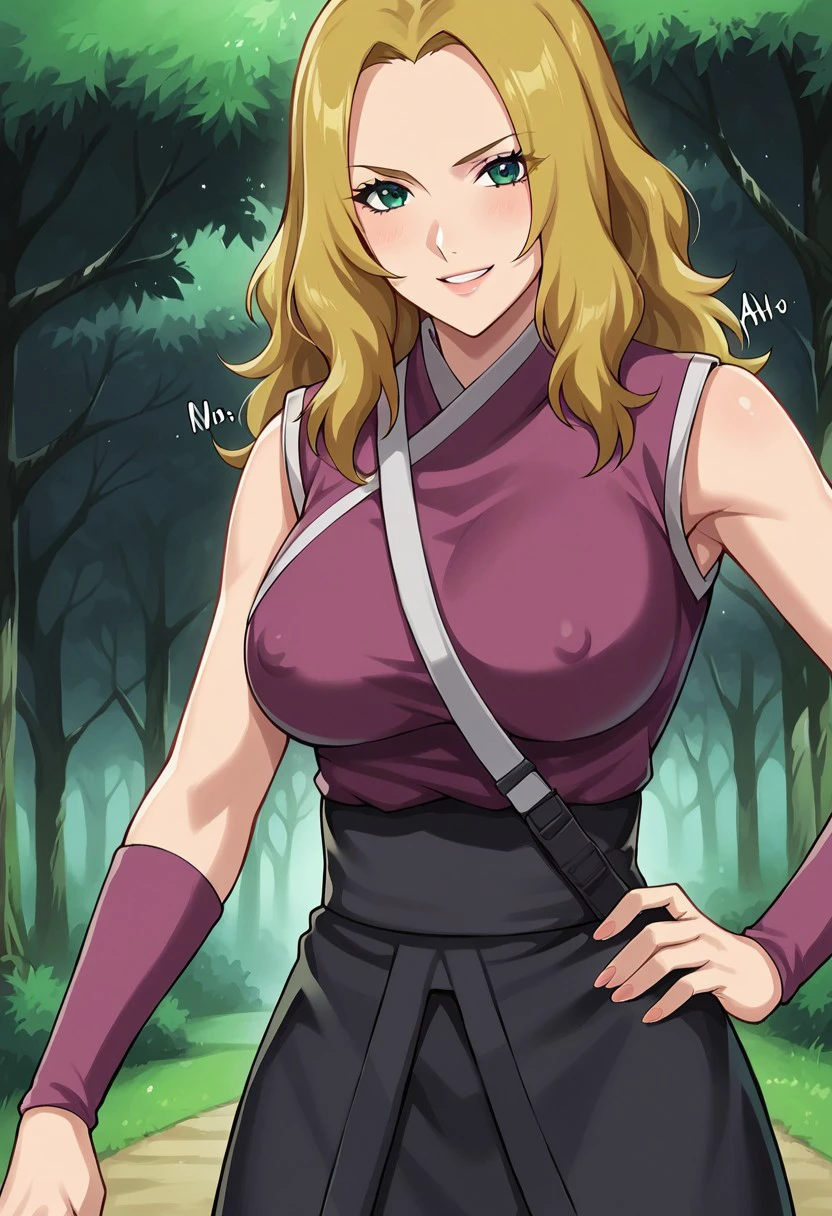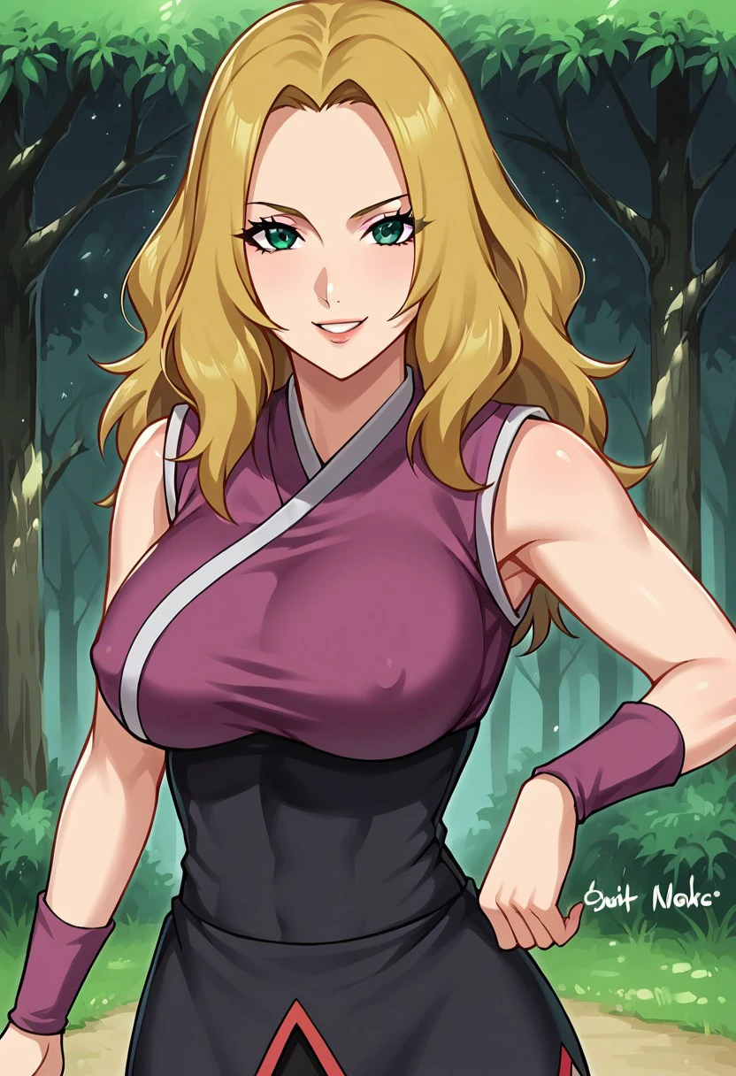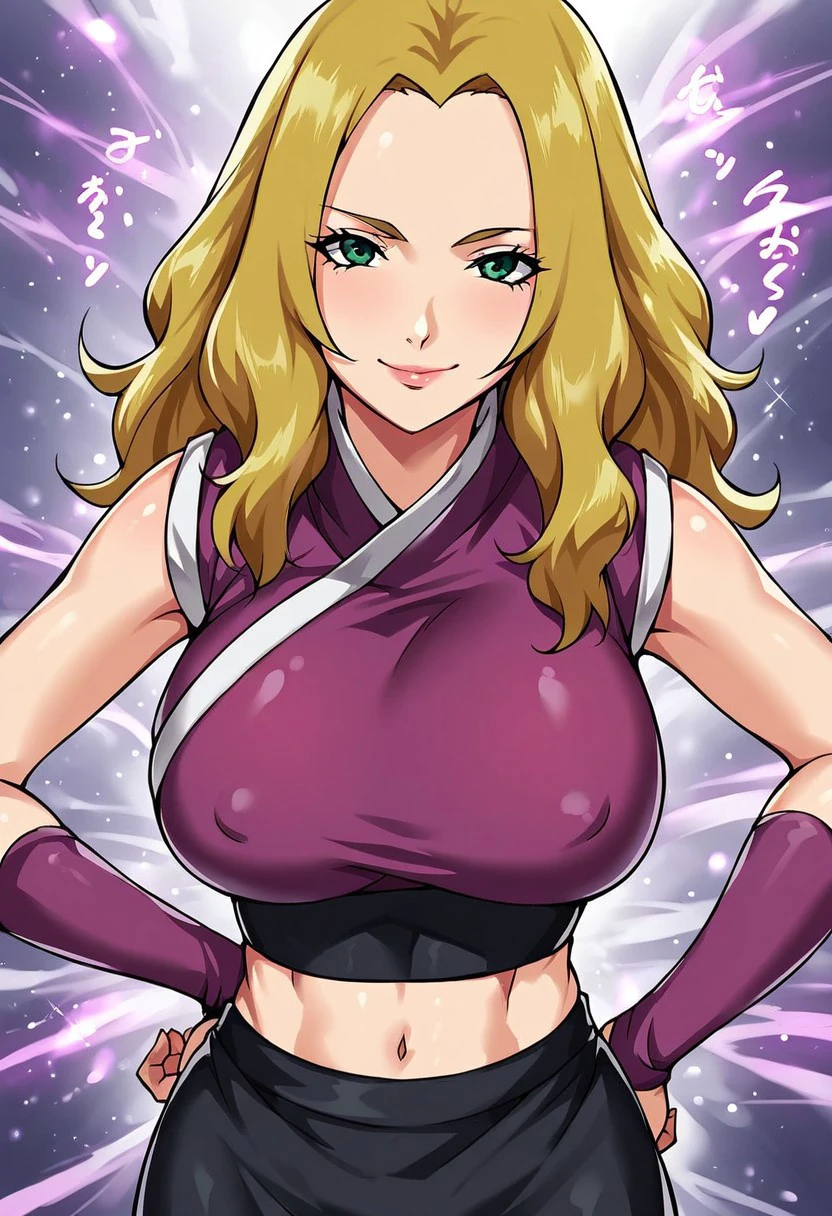 HotaruNS, 1girl, solo, fair skin, long hair, blonde hair, dark-green eyes, wavy hair, widow's peak, hair reaching her back, lips, large breast, violet-coloured kimono, top with white trimmings, black obi, black shorts, shuriken holster, slit black skirt, skirt with red trimmings, violet arm warmers, black shinobi boots, sleeveless, japanese clothes, bandages on leg, toeless footwear, armband,