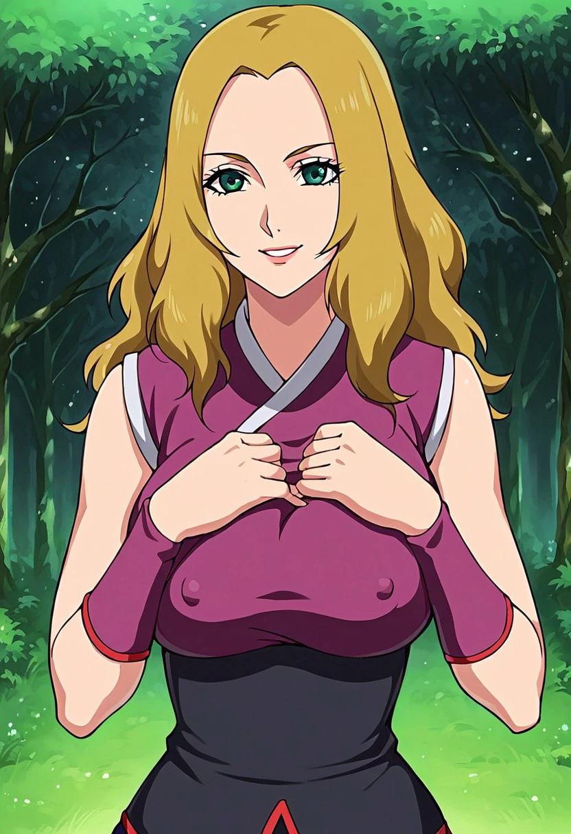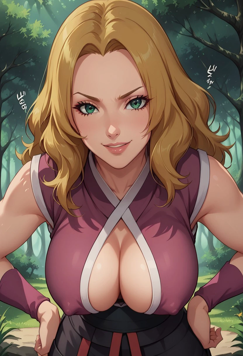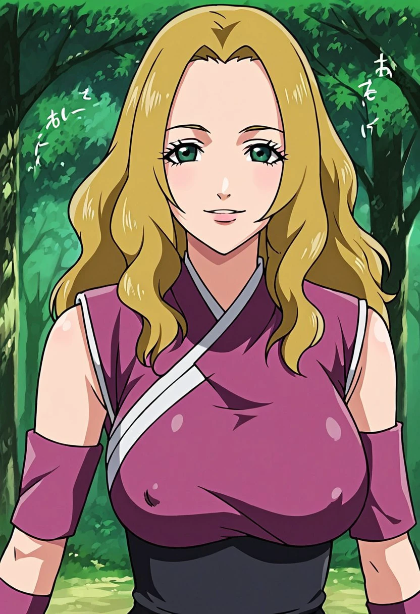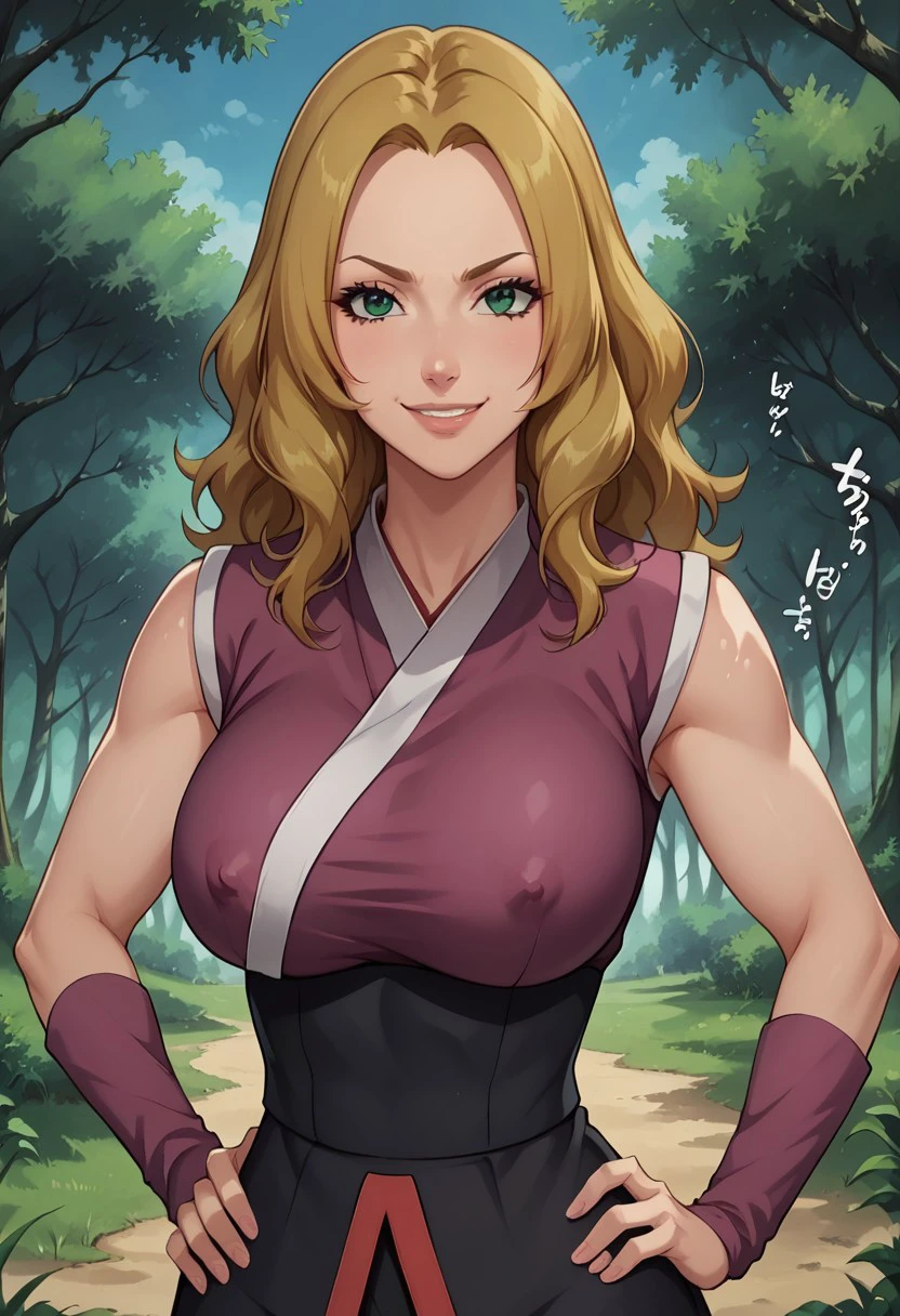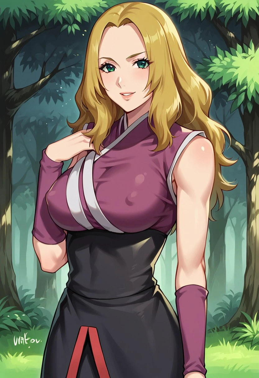 HotaruNS, 1girl, solo, fair skin, long hair, blonde hair, dark-green eyes, wavy hair, widow's peak, hair reaching her back, lips, large breast, violet-coloured kimono, top with white trimmings, black obi, black shorts, shuriken holster, slit black skirt, skirt with red trimmings, violet arm warmers, black shinobi boots, sleeveless, japanese clothes, bandages on leg, toeless footwear, armband,
