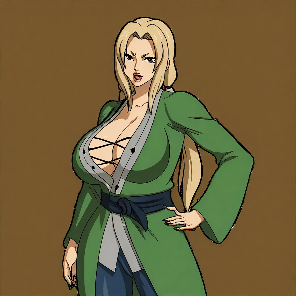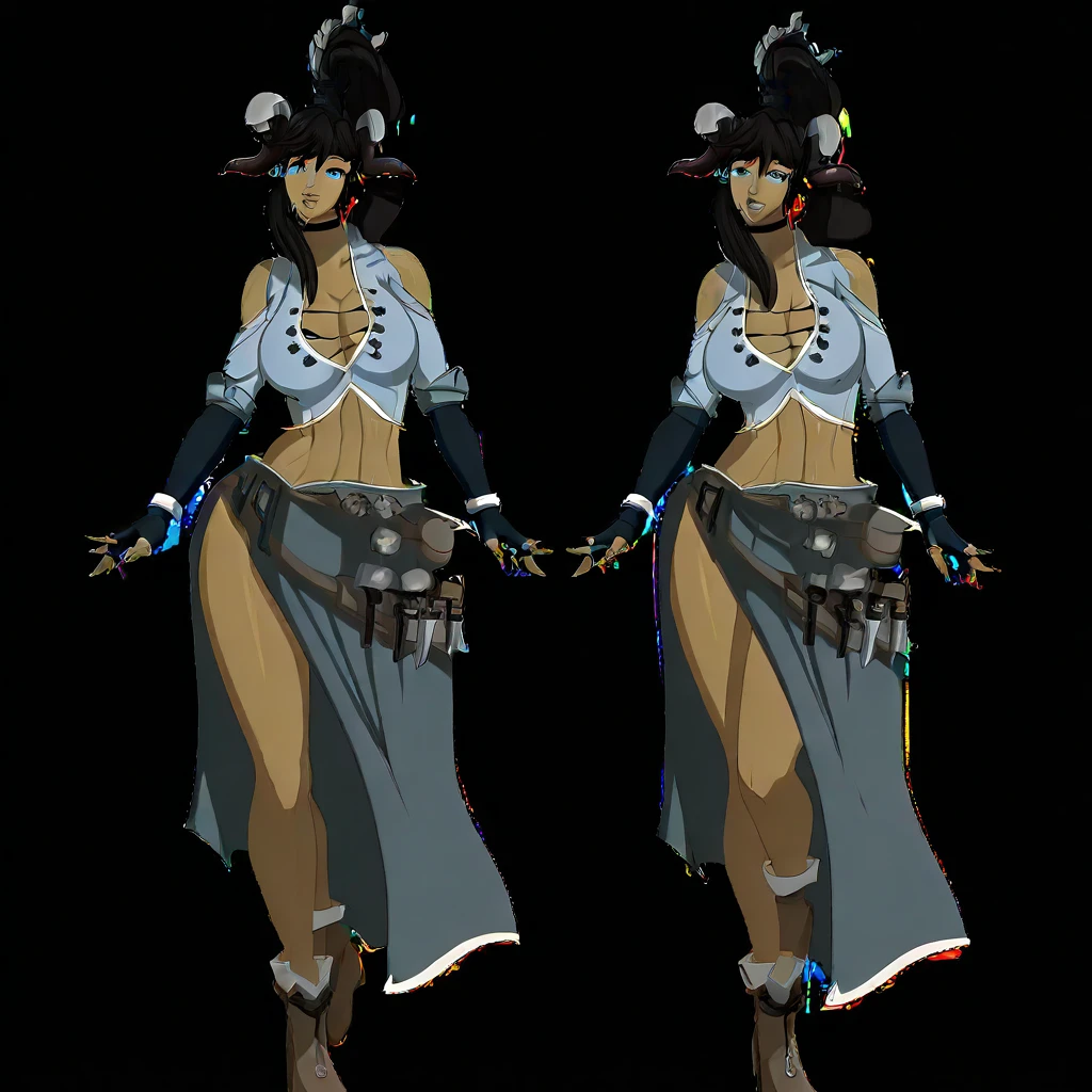 1girl, sara, dark skin, cleavage, black hair, gloves, midriff, fingerless gloves, blue eyes, navel, ponytail, outfit, skirt