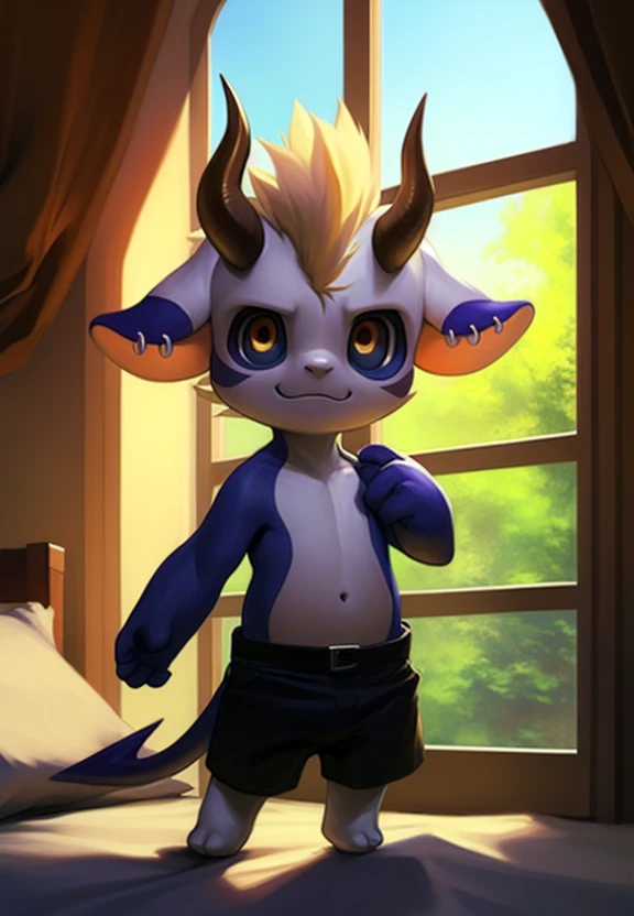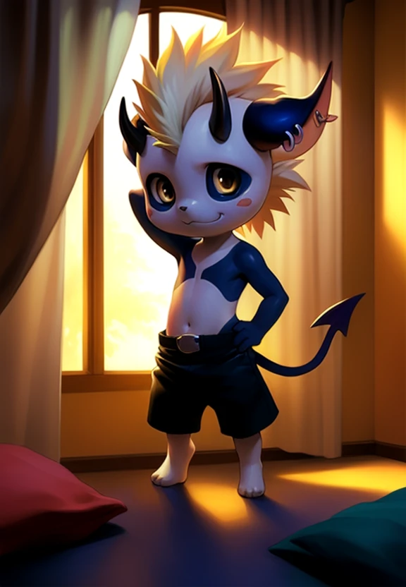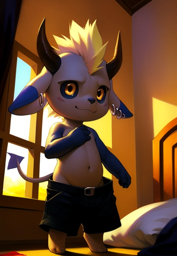DemoniumShadoFlameFlufYif, Black shorts, earrings, pointed tail, naked torso, yellow clair, red-black pupils, horns, broken horn, mohawk, blue ear tips, (( child, baby, chibi, small body,))