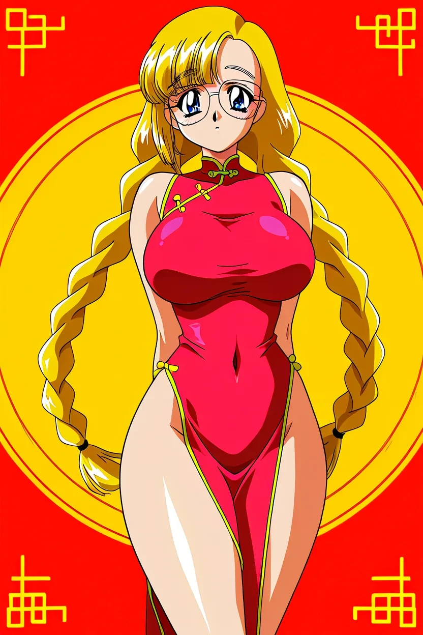 1girl, Karin (Viper V16), blue_eyes, glasses, blonde_hair, very_long_hair, braided_hair, twin_braid, huge_breasts, curvy, extremely sexy, wide_hips, thick_thighs, , fully_, , , anime_coloring, anime_source, 1990s_art_style, HD, Hi-res, superb quality No-Flaws