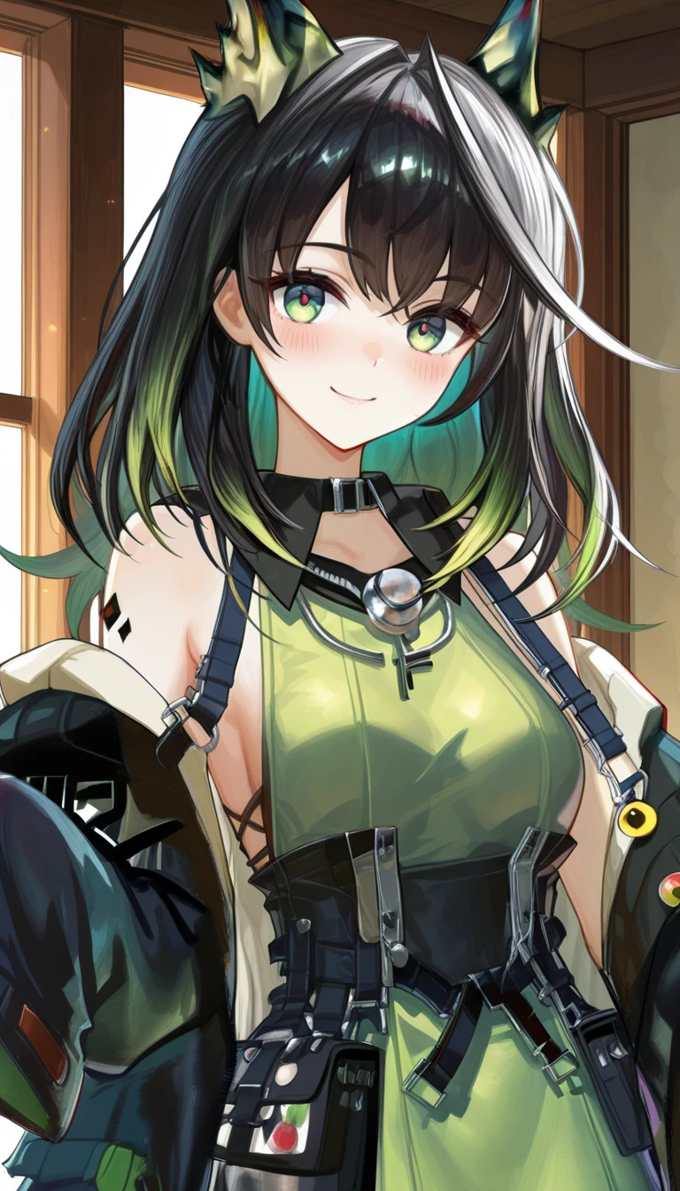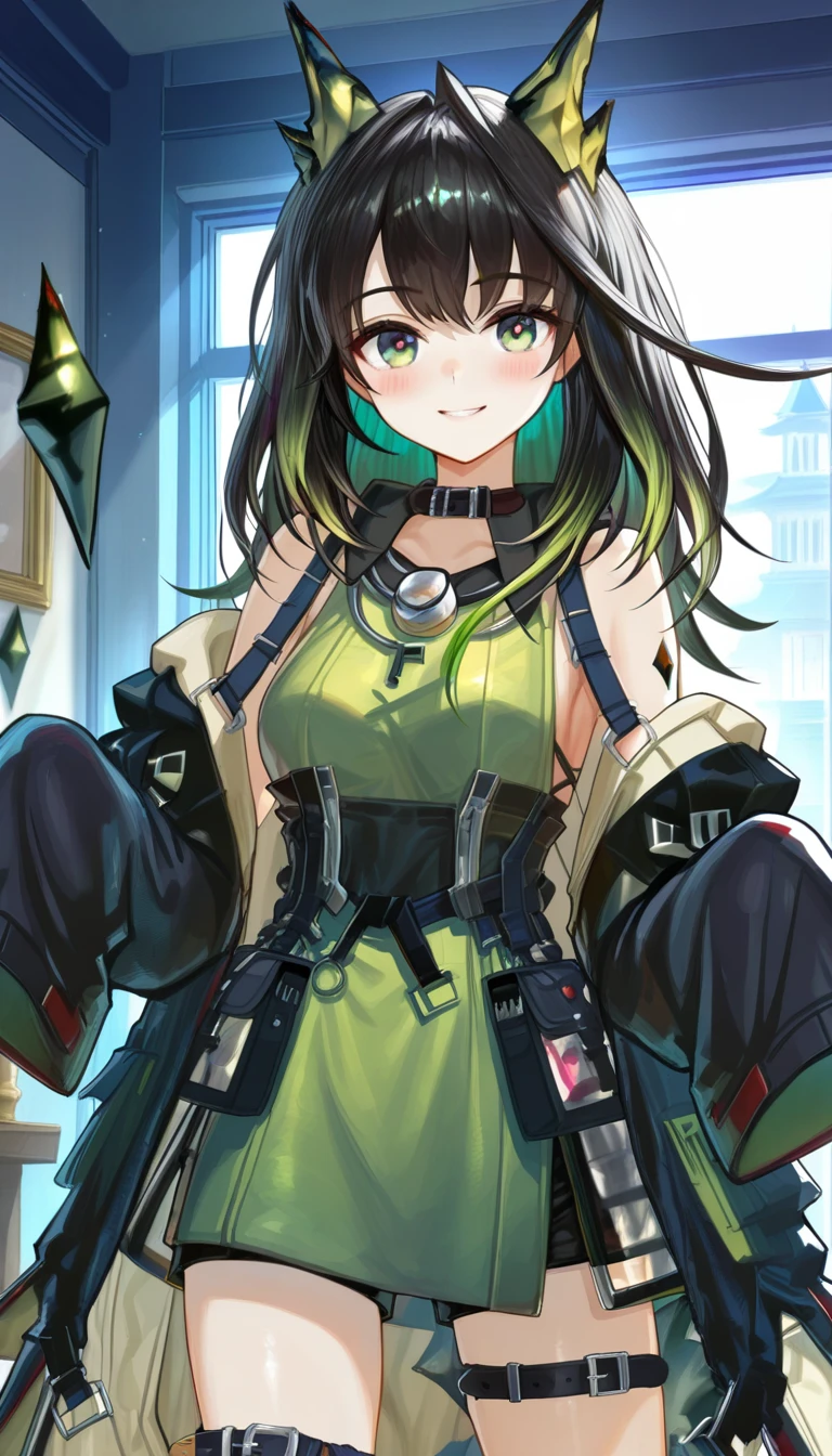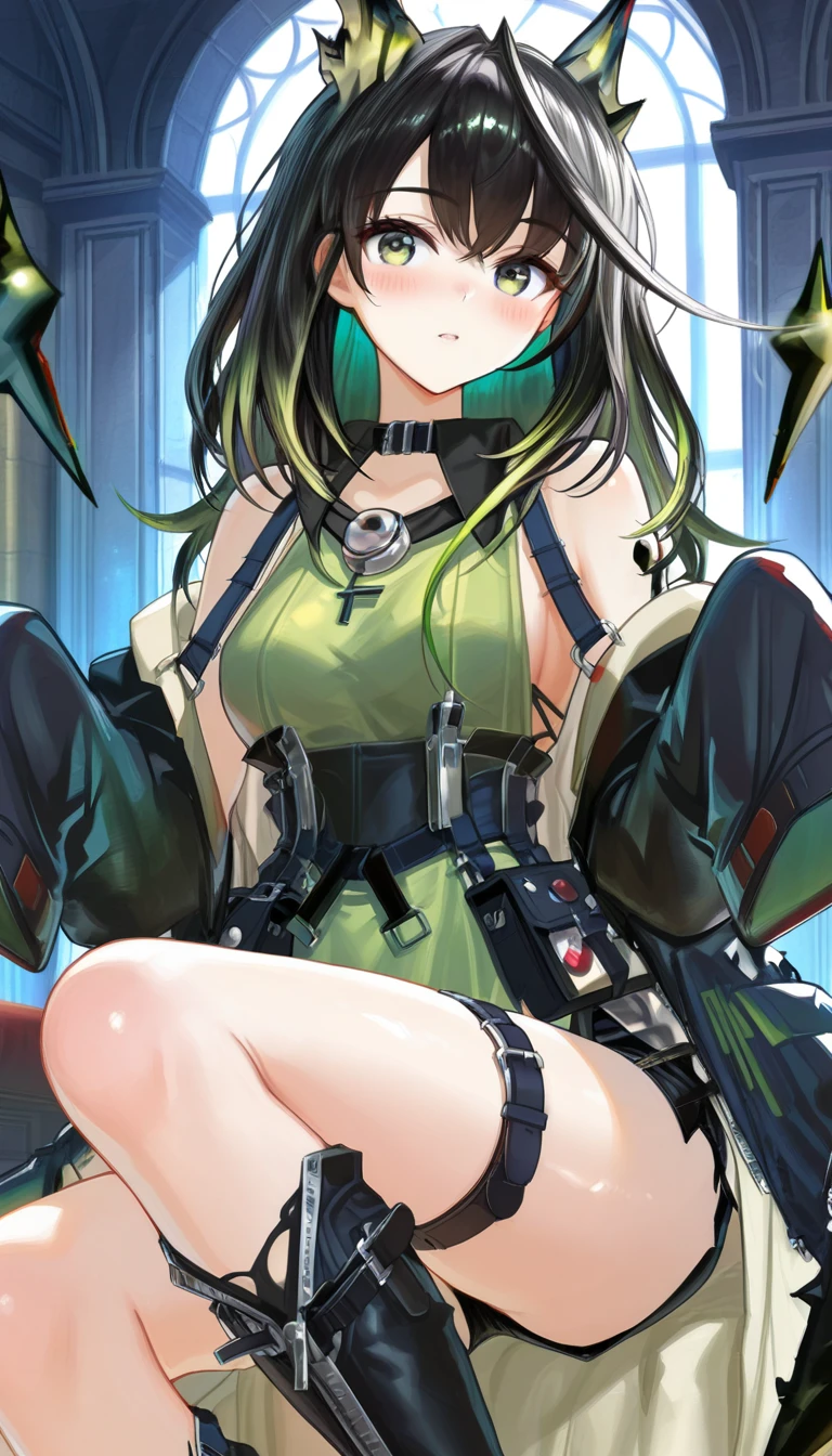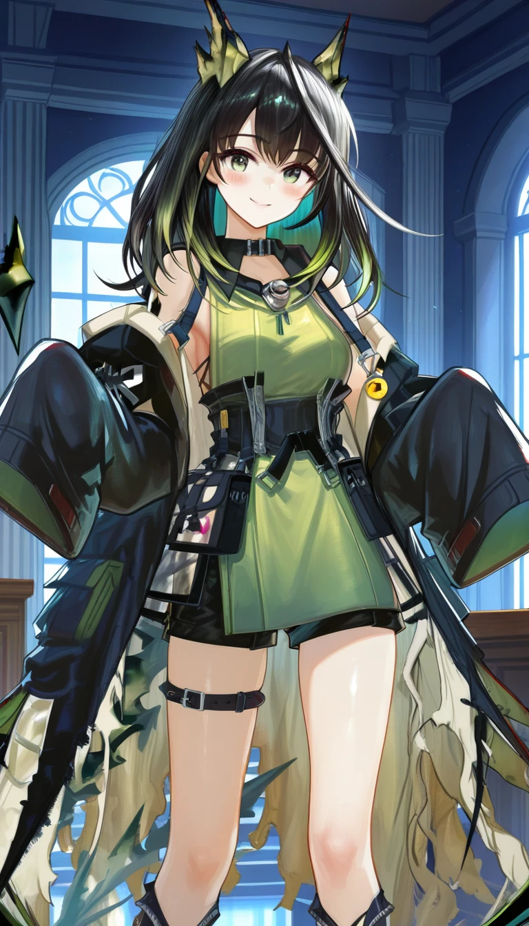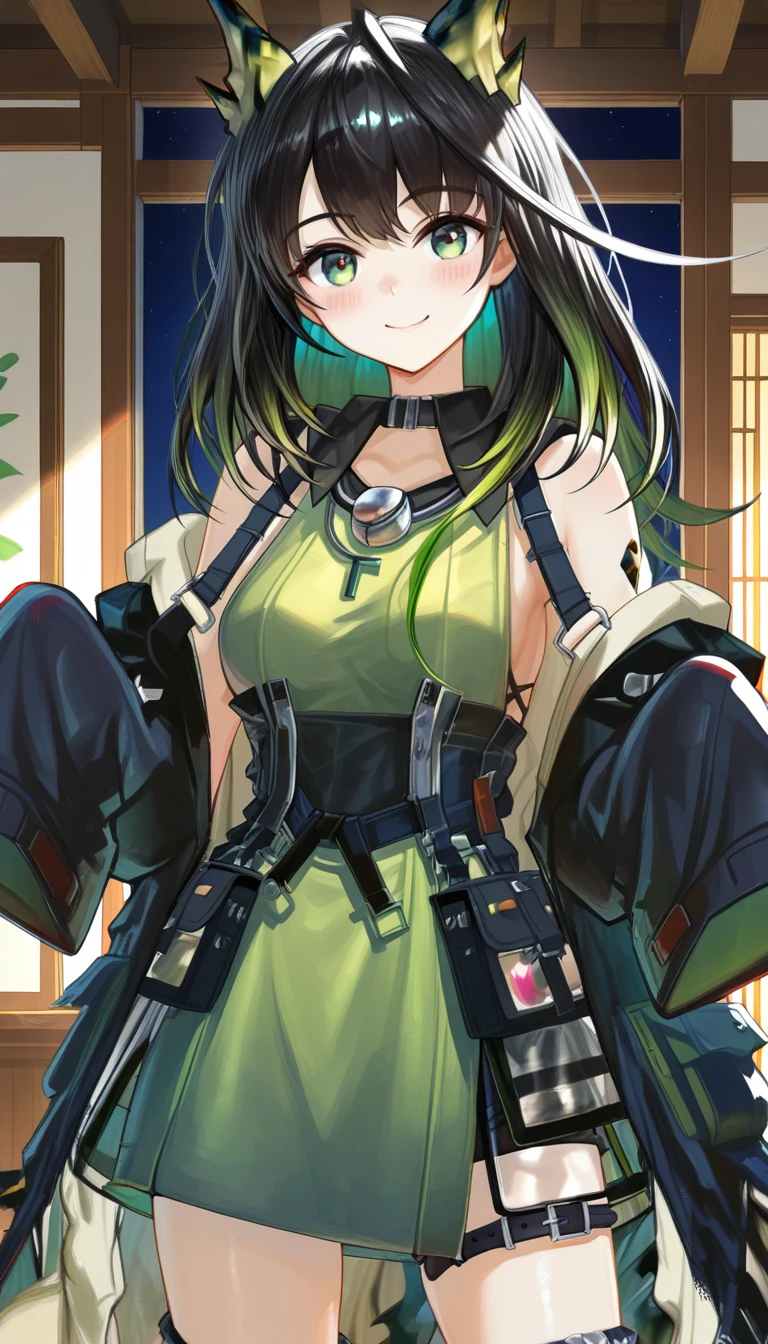 collar,bare shoulders,off shoulder,black collar,black coat,open coat,green dress,sleeveless dress,side slit dress,long sleeves,sleeves past fingers,medium breasts,black tunic,black shorts,thigh strap,knee boots,black footwear