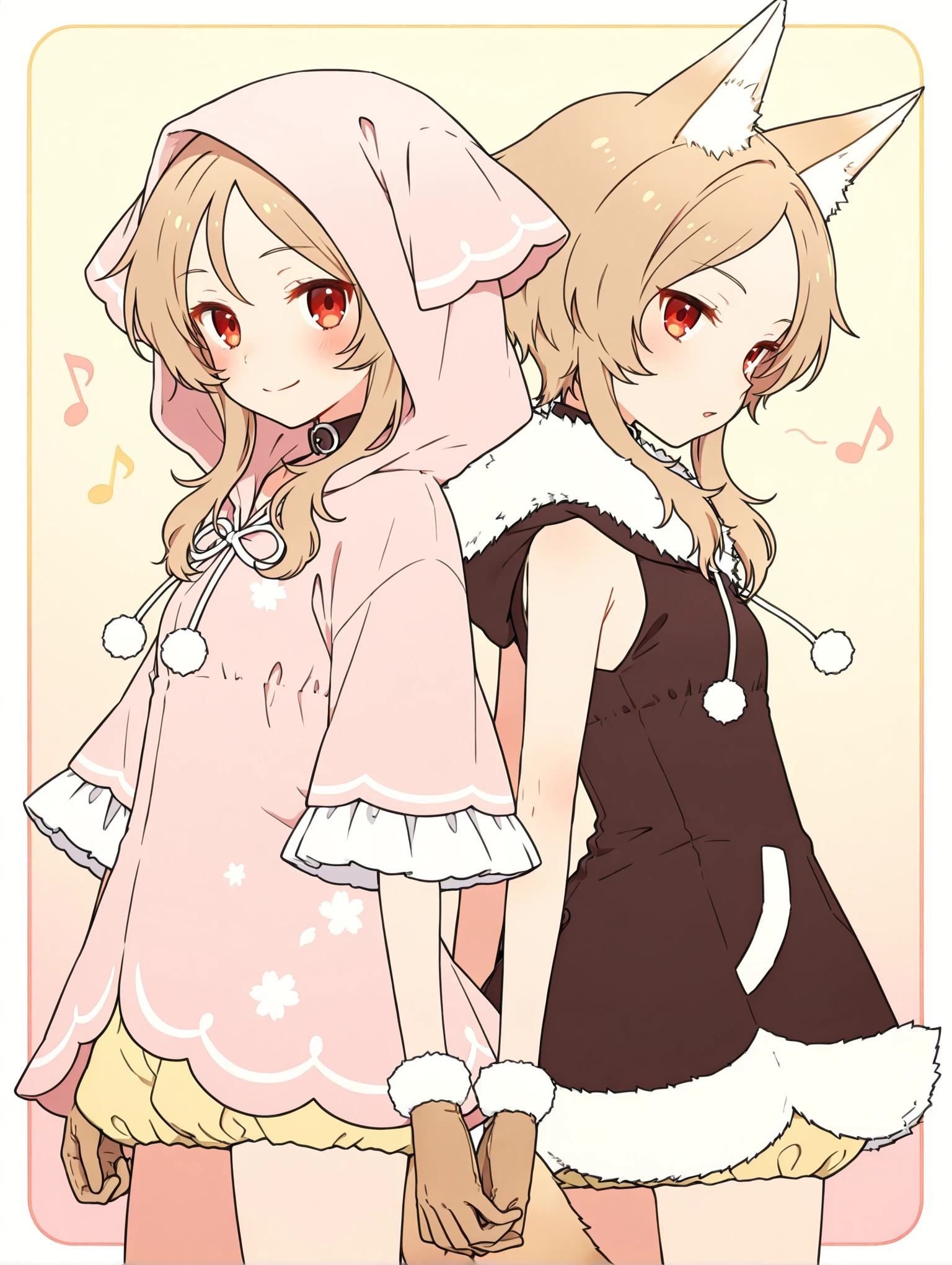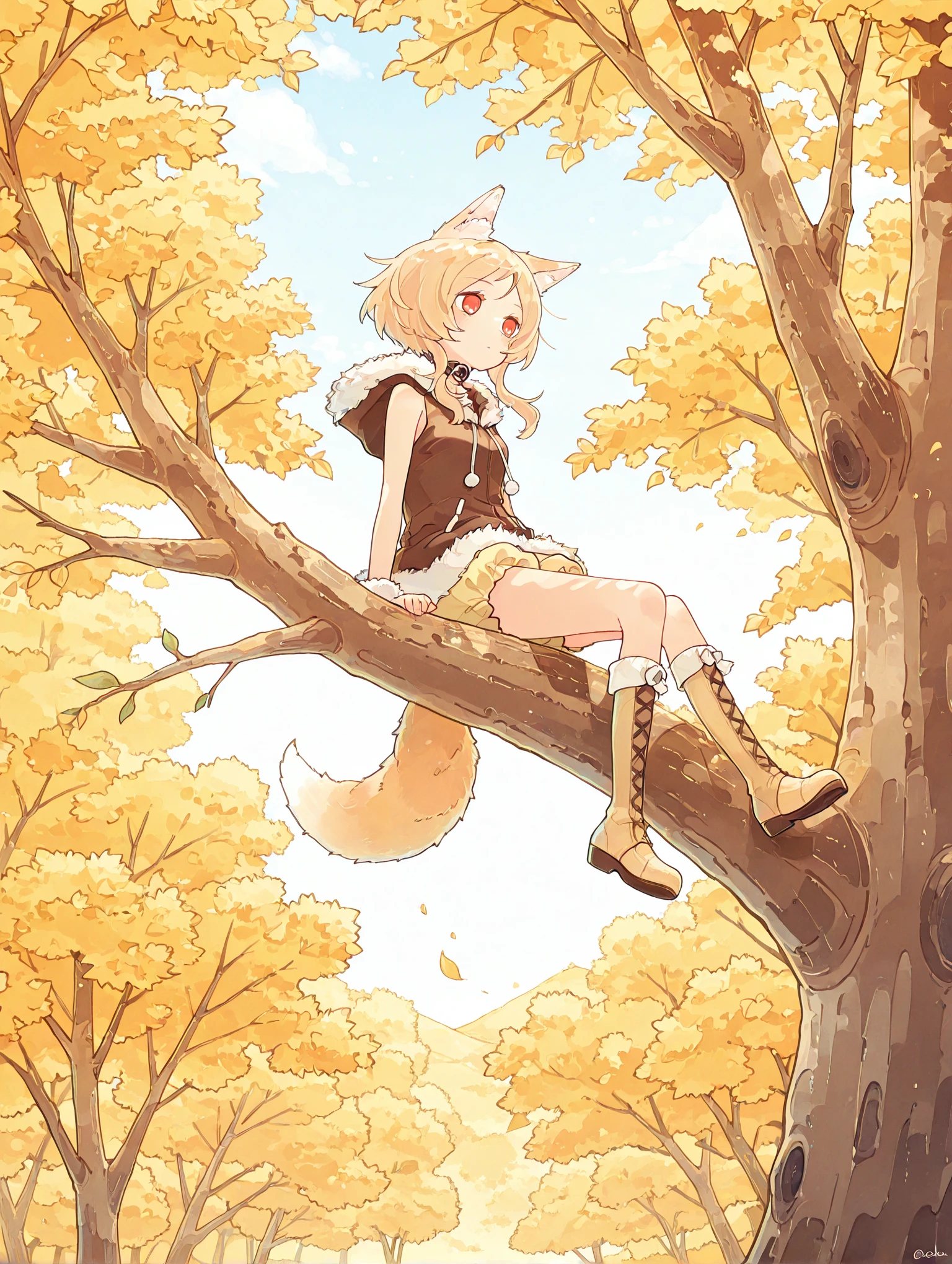 brown sleeveless hoodie, hood down, fur trim, yellow puffy shorts, belt collar, knee boots, glovesPlease share your wonderful generations!