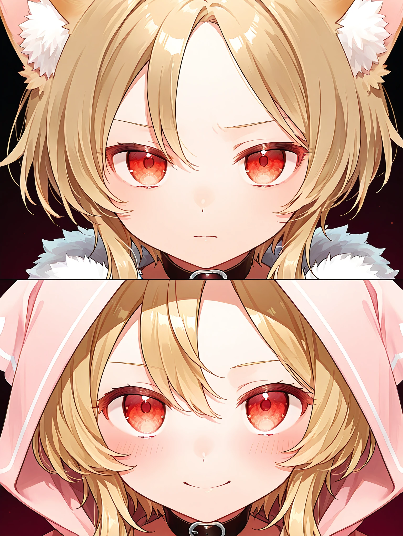 pink outfit, hood up, yellow puffy shorts, belt collar, black thighhighs, red footwear, gloves2nd Form