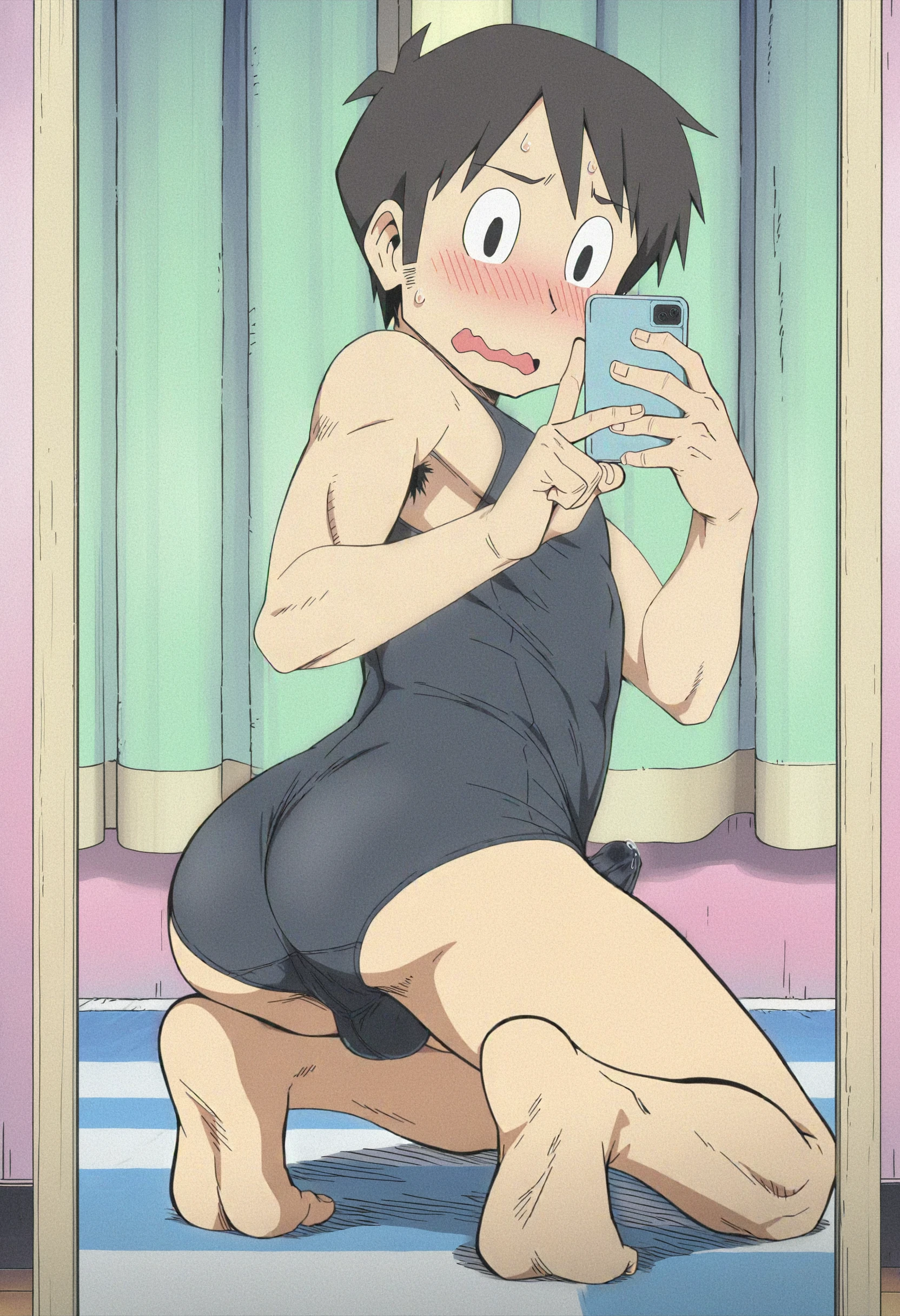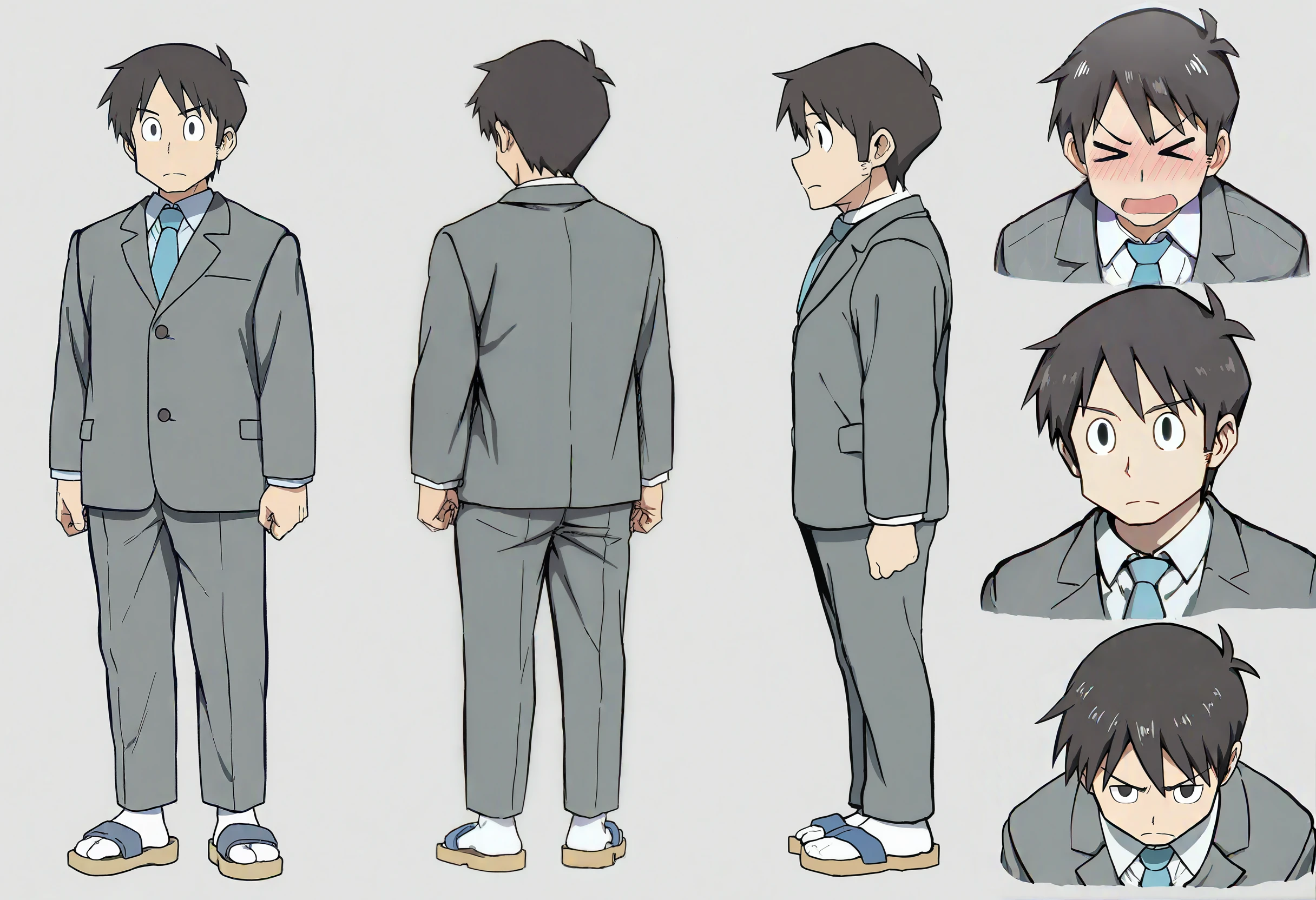 collared shirt, sleeves rolled up, grey pants, wristwatch, white socks, sandalsThis is not a Pony model, and should not use Pony quality tags. Prefix with