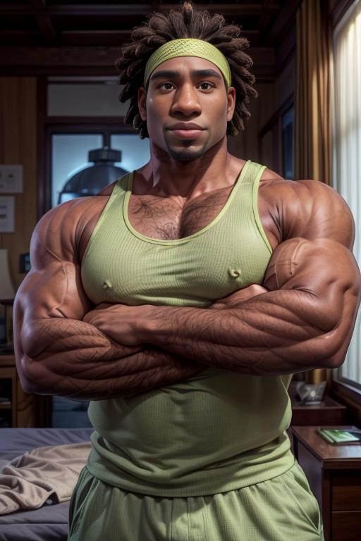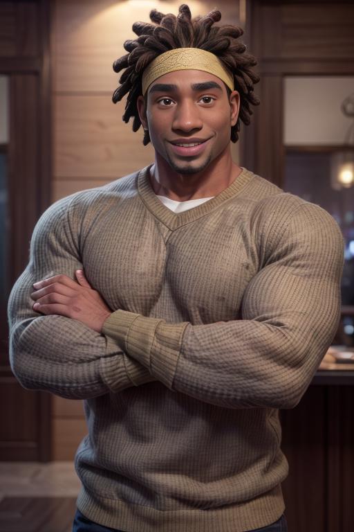 Include in the prompt: "dark skin, dreadlocks, headband, muscles, goatee" for better results.