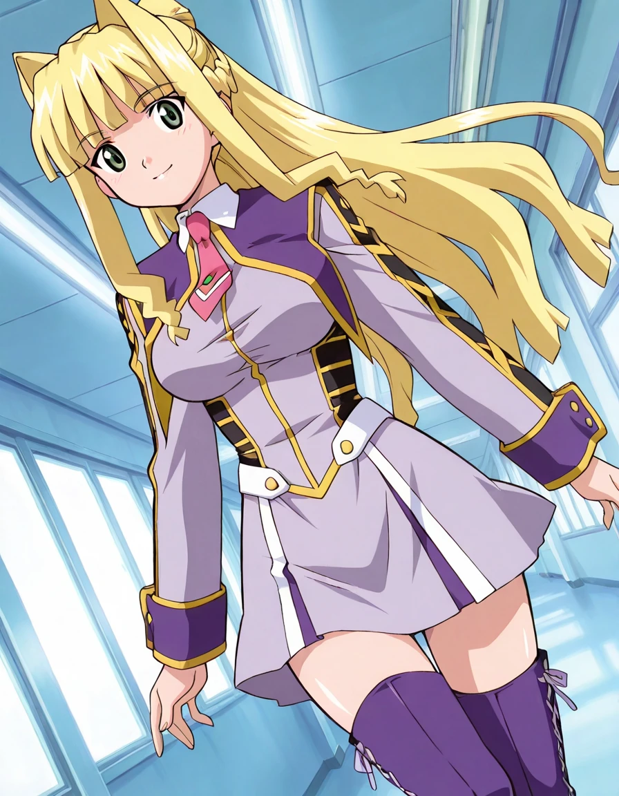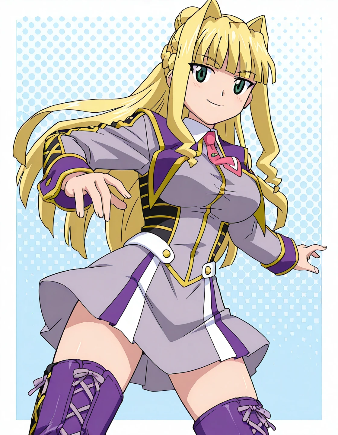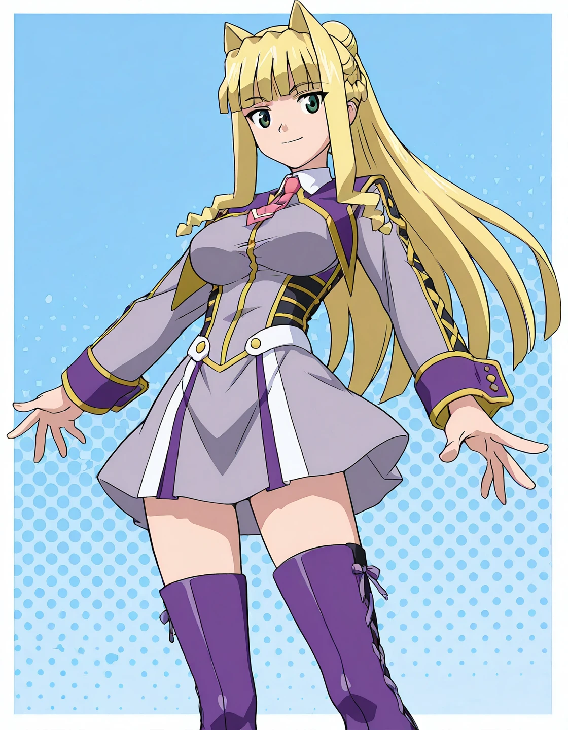 School Uniform: fitted white and lavender military-style jacket with gold trim and structured shoulders, pink tie, black side hip panels adorned with crisscrossing gold stripes, long sleeves featuring matching black sections with intersecting gold band details, short pleated lavender skirt with white panel inserts, thigh-high glossy purple lace-up boots with side lacing — her signature battle-ready uniform combining discipline, nobility, and dramatic flair.