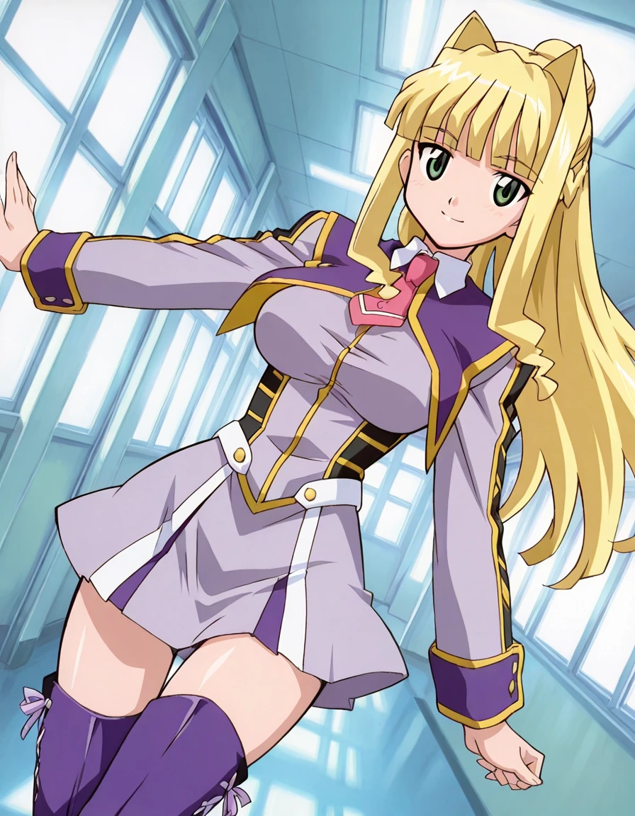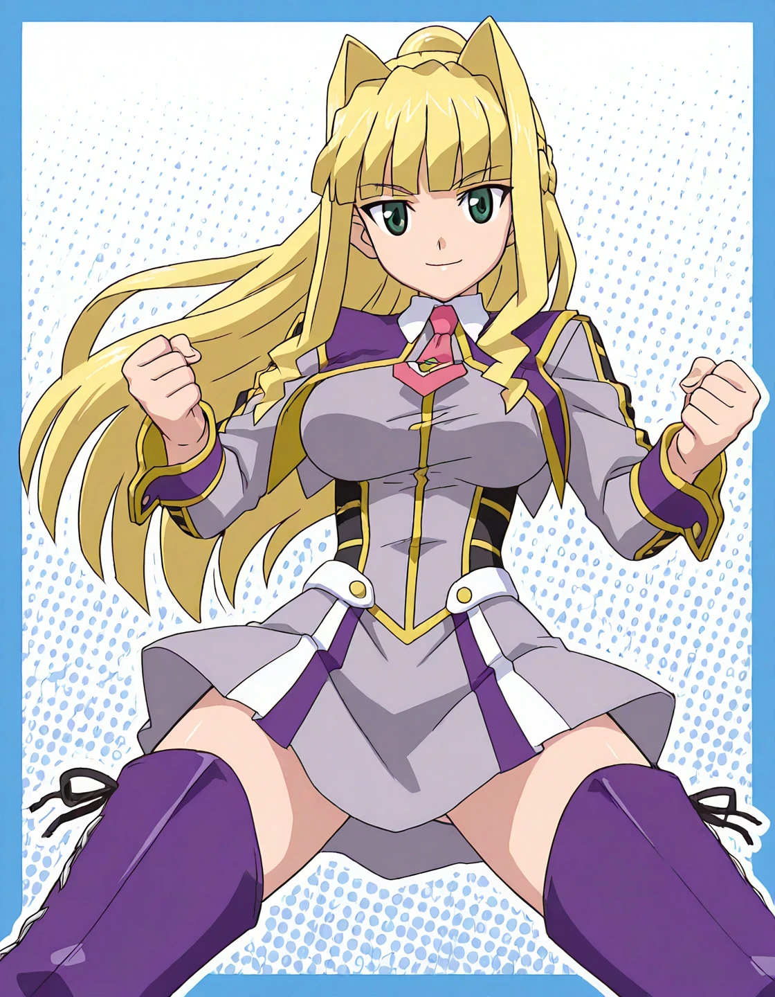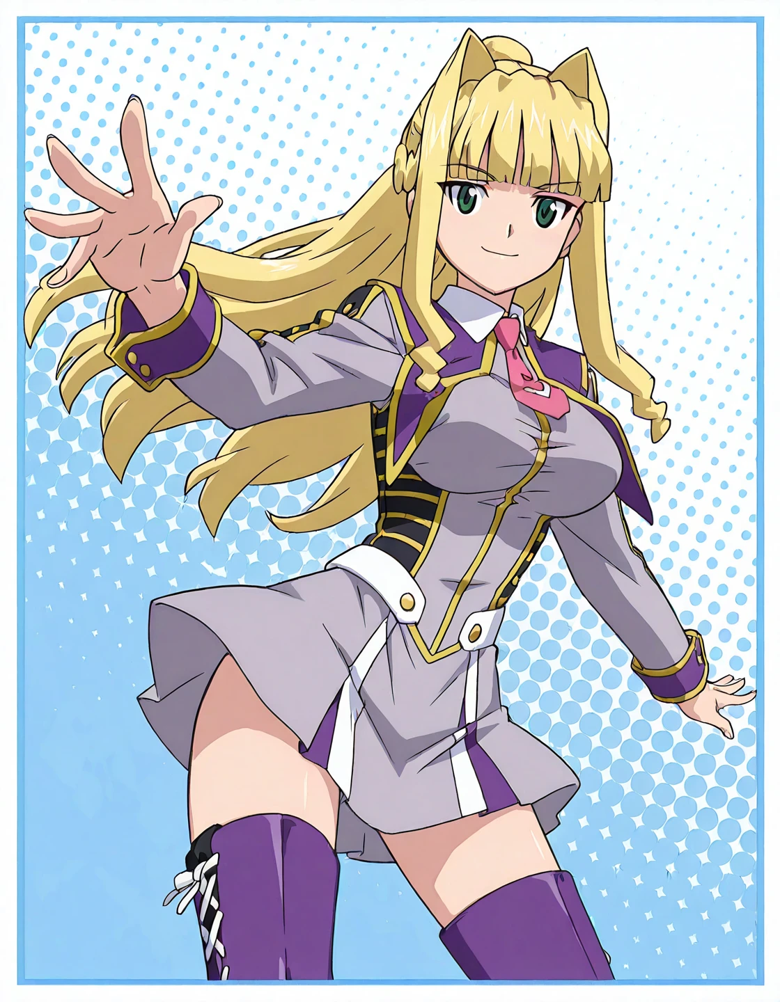 School Uniform: fitted white and lavender military-style jacket with gold trim and structured shoulders, pink tie, black side hip panels adorned with crisscrossing gold stripes, long sleeves featuring matching black sections with intersecting gold band details, short pleated lavender skirt with white panel inserts, thigh-high glossy purple lace-up boots with side lacing — her signature battle-ready uniform combining discipline, nobility, and dramatic flair.
