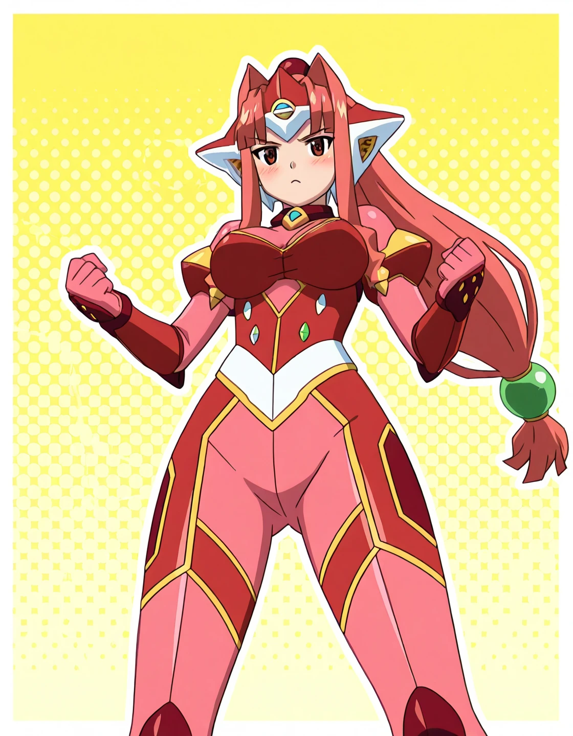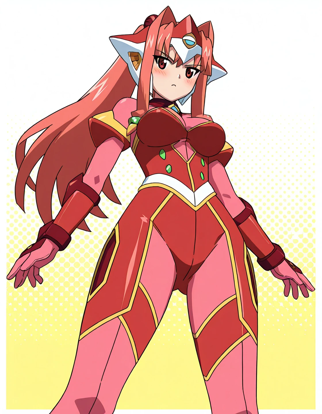 Kyonyu Heroine Form (Transformed State): very long straight pink hair tied in a high ponytail with a large green orb hair accessory, red eyes, red and white mecha crown helmet with a central blue gem and sharp angular design, red and pink armored bodysuit with gold trim and chest gem details, long pink gloves with red armored cuffs, white waist armor piece with yellow accent, form-fitting red leggings integrated into the bodysuit, red boots with gold trim — her fully powered giant-heroine configuration inspired by classic tokusatsu aesthetics.