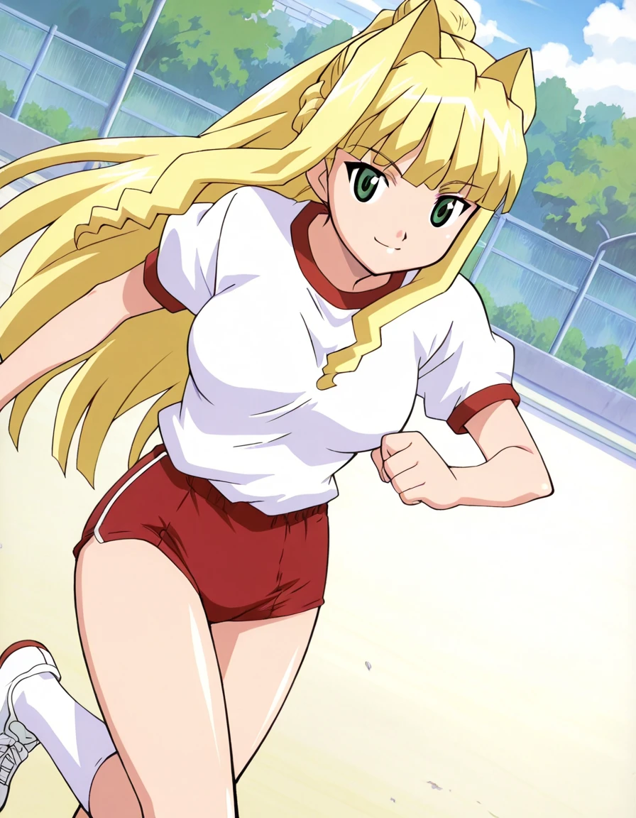 Athletic Gym Uniform: white athletic t-shirt with red trim, tight red gym bloomers, thigh-high white athletic socks — reflecting school athletic events and comedic training moments.