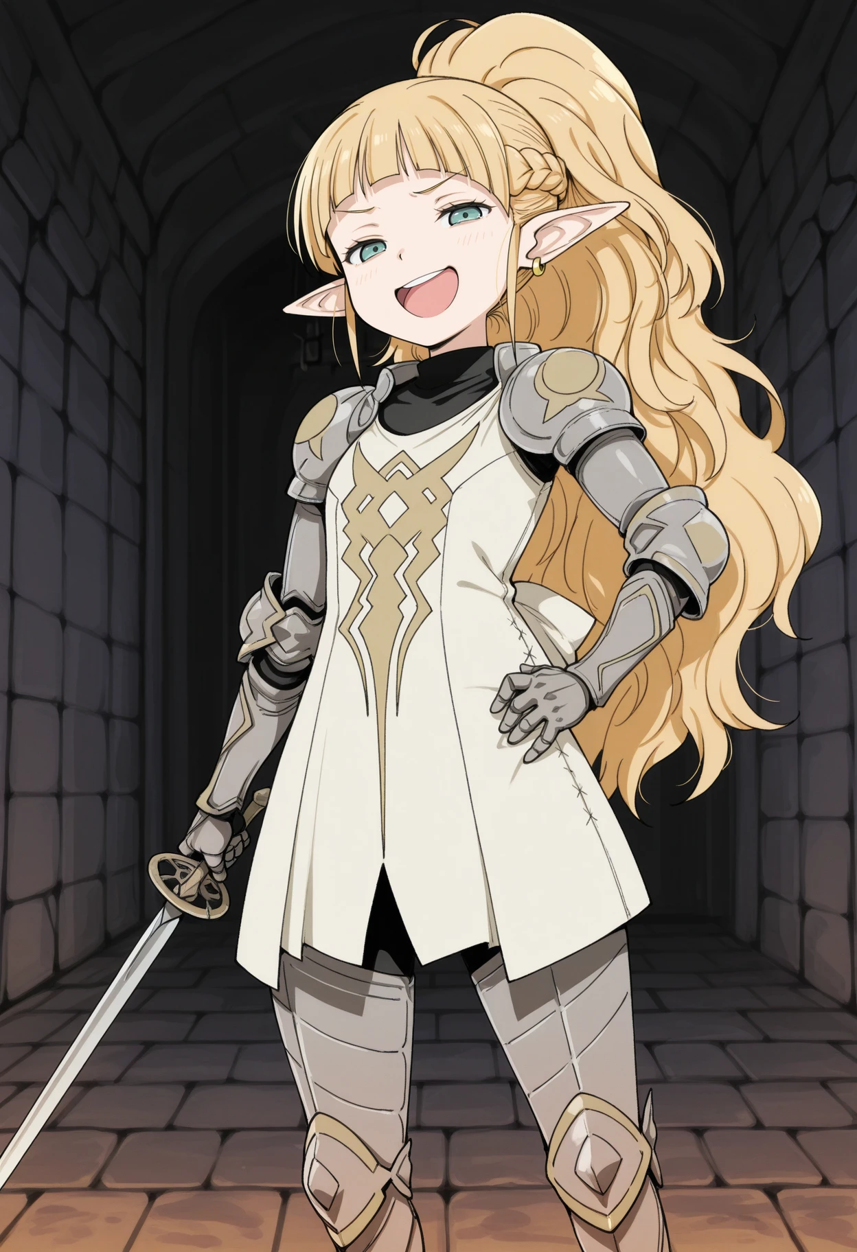 Notable tags: blonde hair, very long hair, ponytail, braid, pointy ears, single earring, full armor, gauntlets