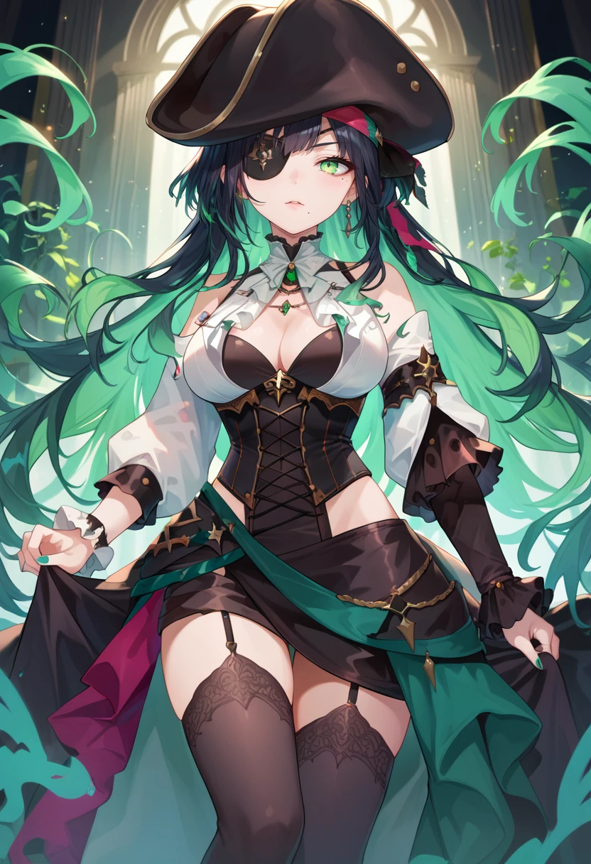 cerseasoulstorm, black eyepatch, green eyes, mole under eye, mole under mouth, hat, jewelry, corset, black thighhighs
