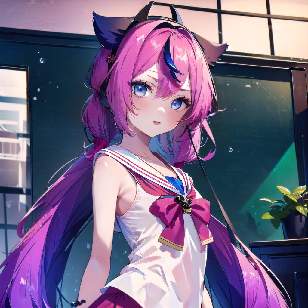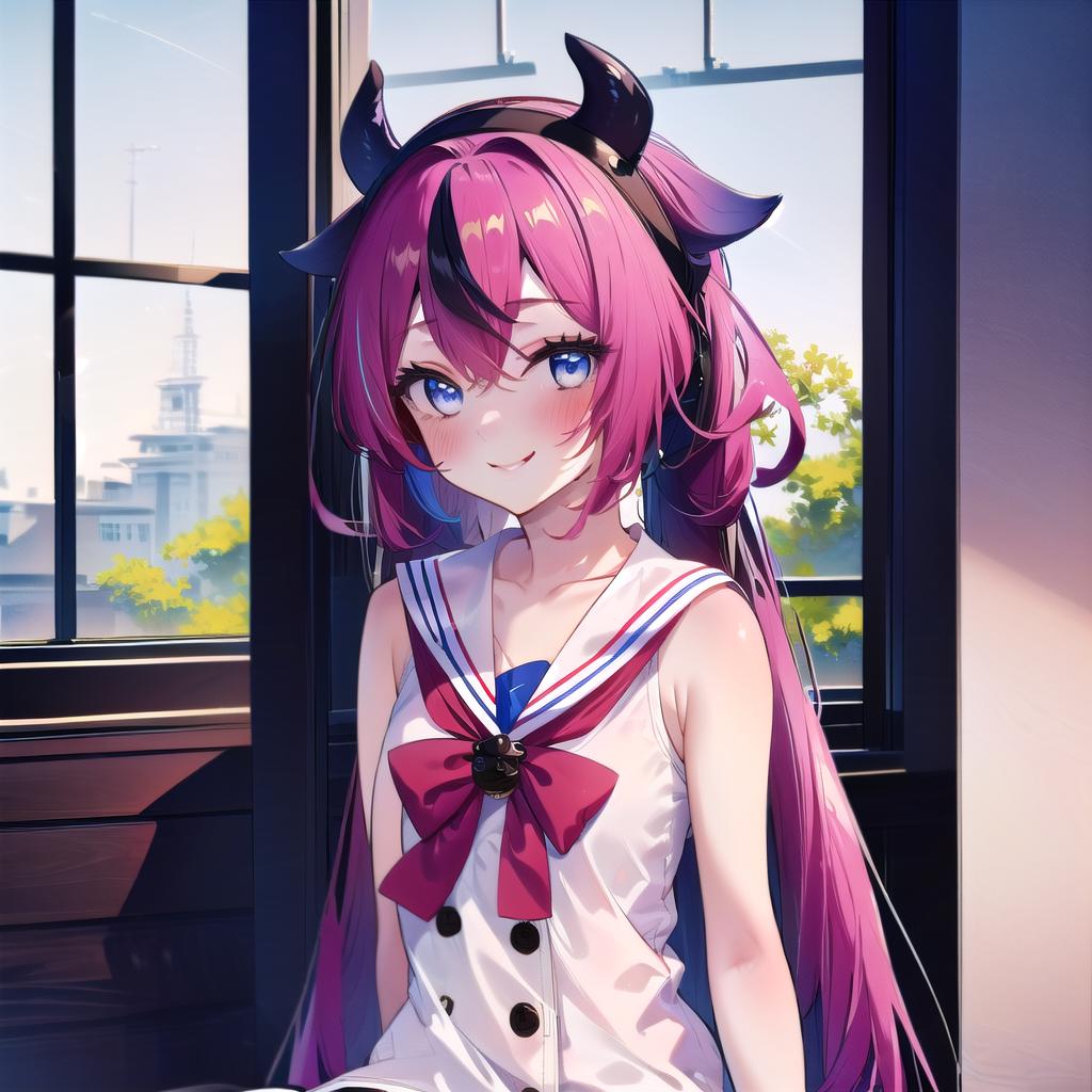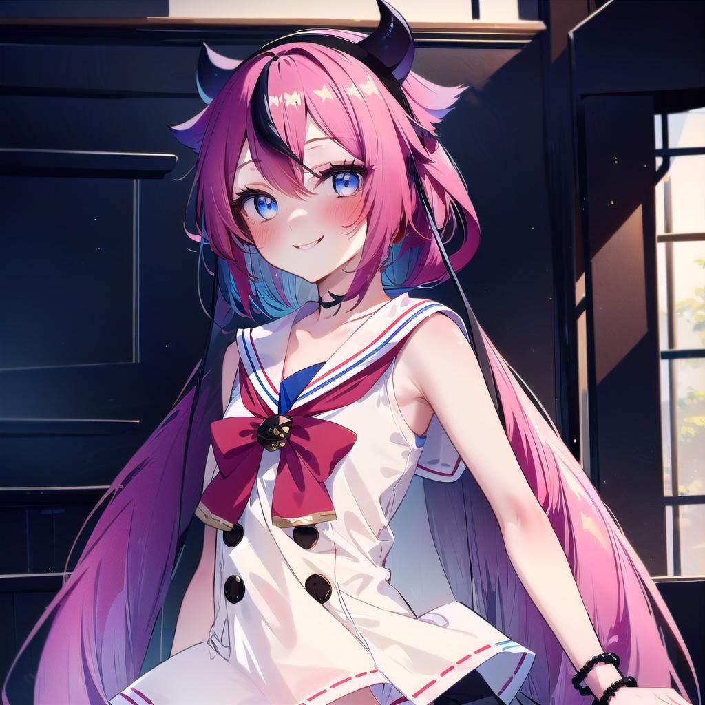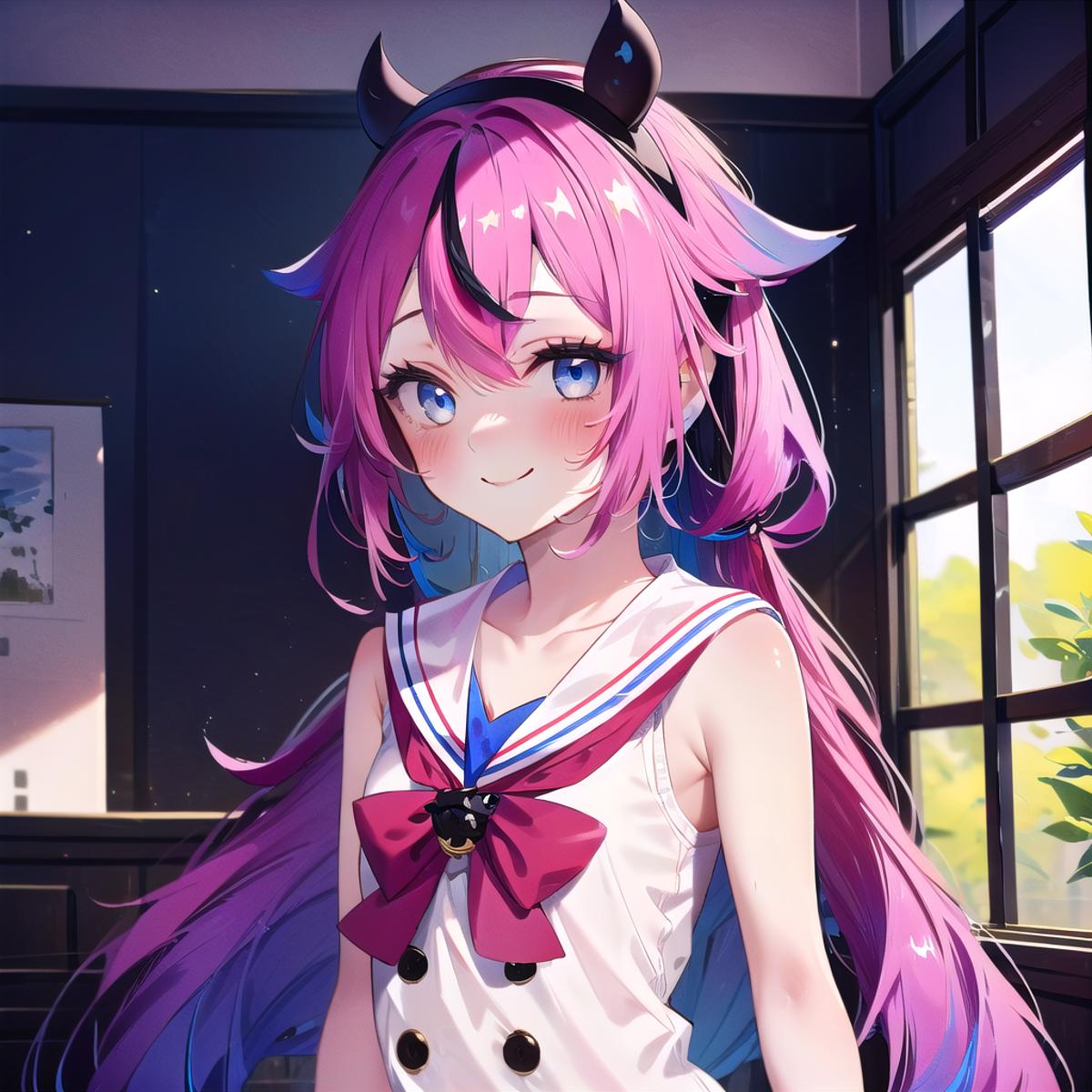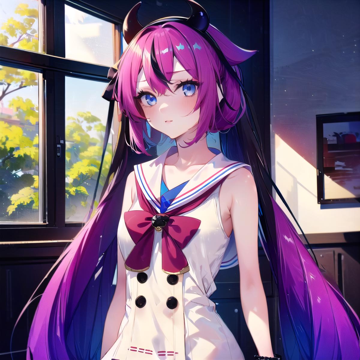 meikahime, blue eyes, twintails, pink blue multicolored very long gradient hair, hair flaps, black horn hairband, bracelet, white sailor collar, white sleeveless shirt, black buttons, red bowtie, red hakama miniskirt, bare shoulders,Description
