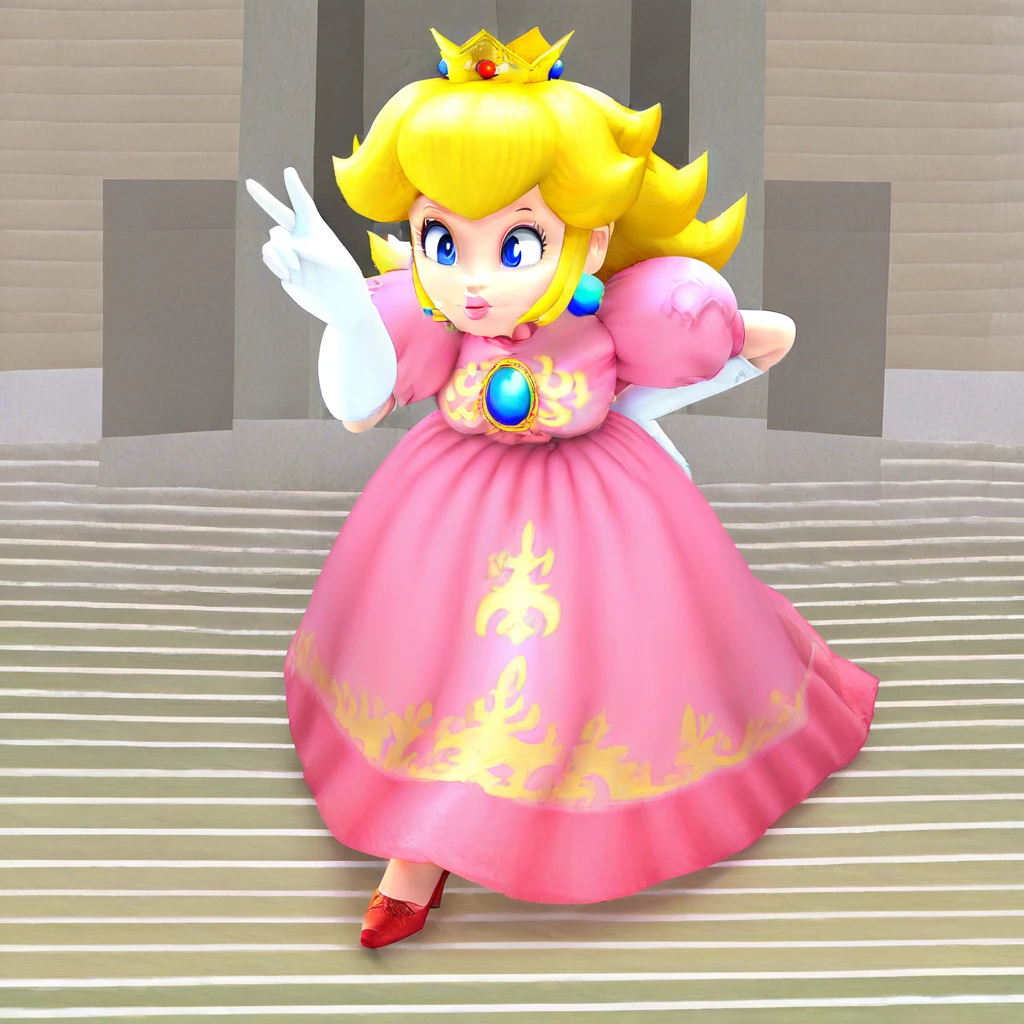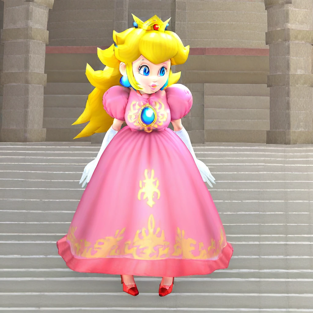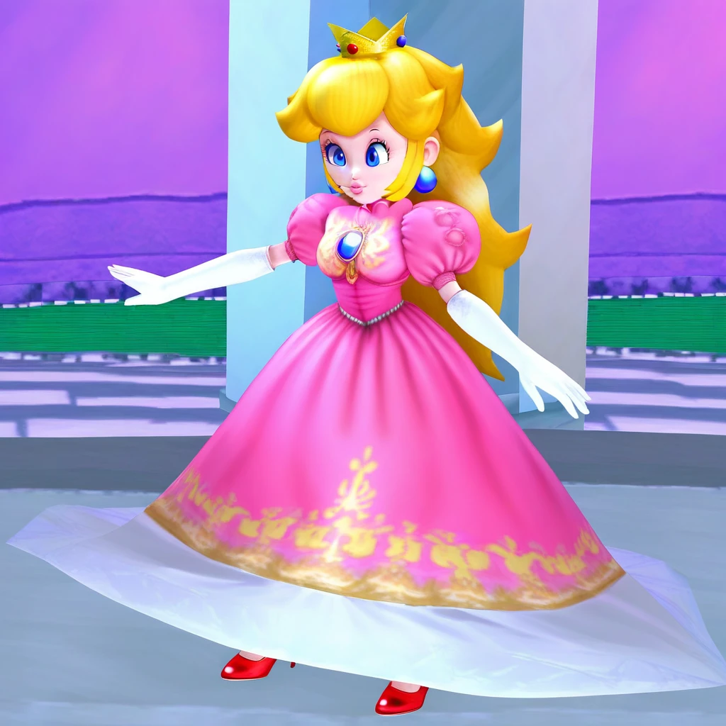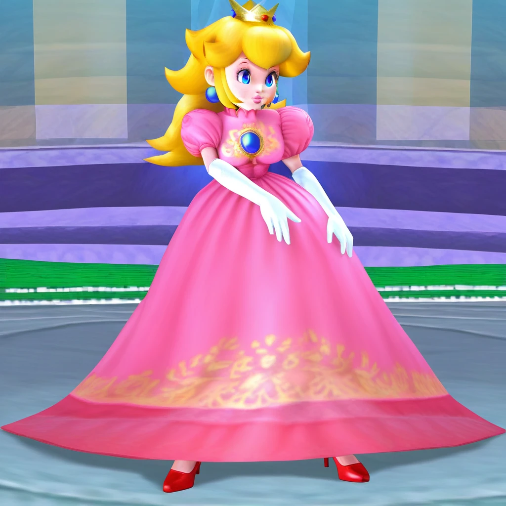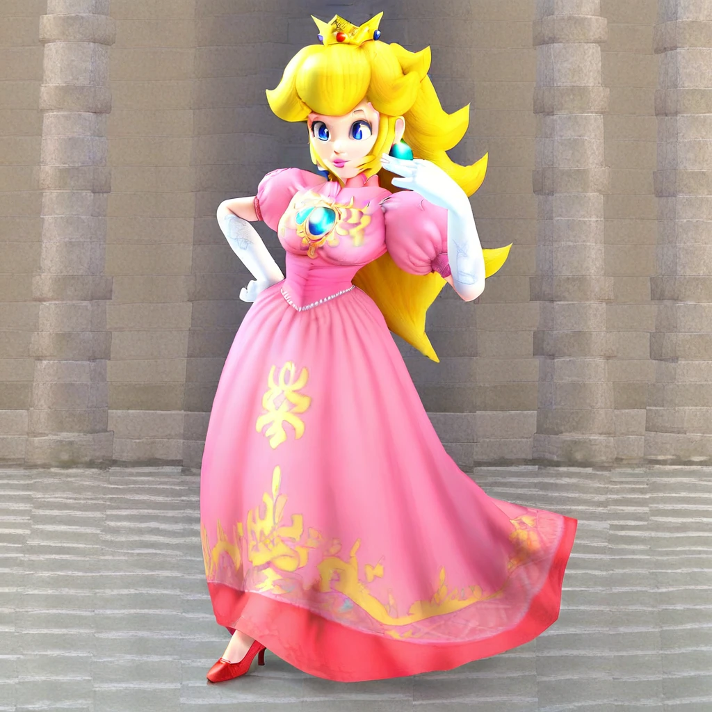 Princess Peach, long Blonde hair, crown, blue eyes, blue earrings, pink dress, puffy short sleeves, long white gloves