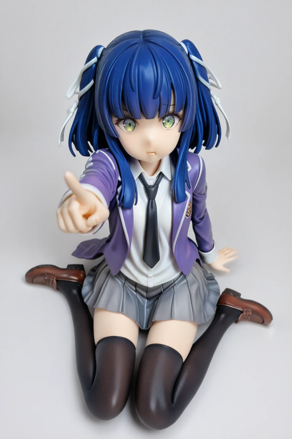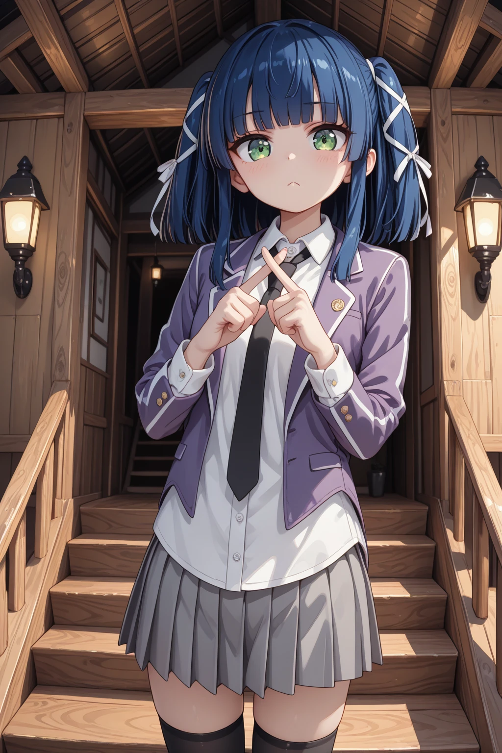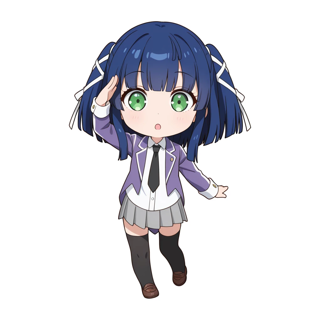 Trigger word: Haduki, blue hair, medium hair, two side up, white ribbon, hair ribbon, blunt bangs, green eyes, school uniform, white shirt, collared shirt, black necktie, purple jacket, long sleeves, open jacket, grey skirt, pleated skirt, zettai ryouiki, black thighhighsAddition: shoes, brown footwear, loafersDescription