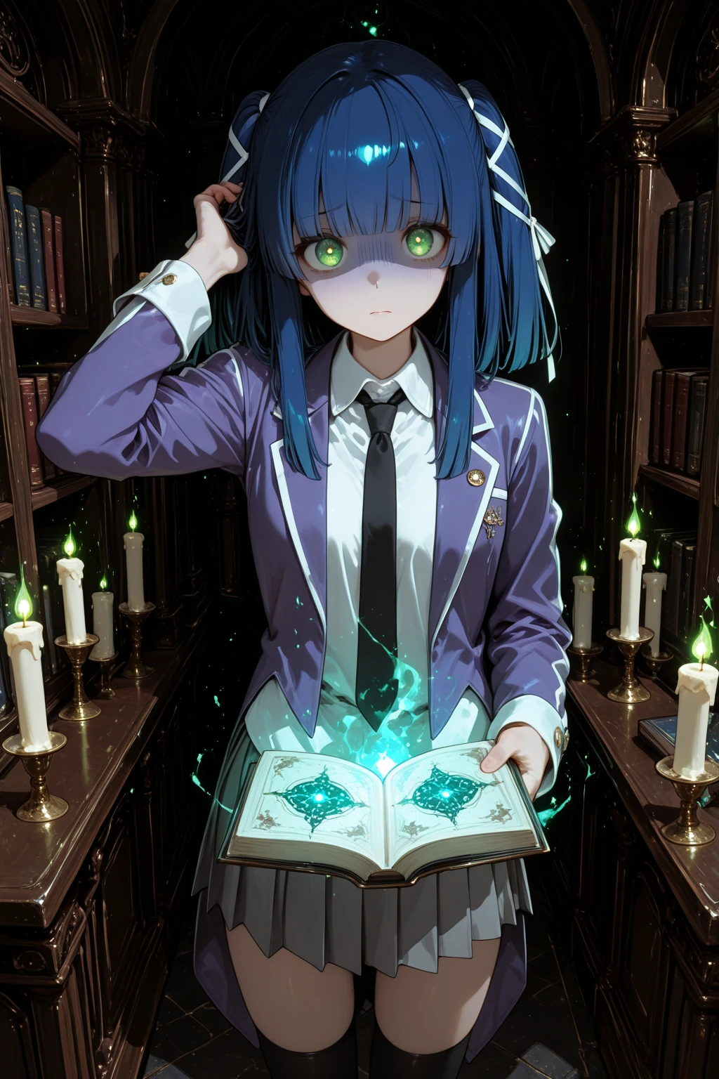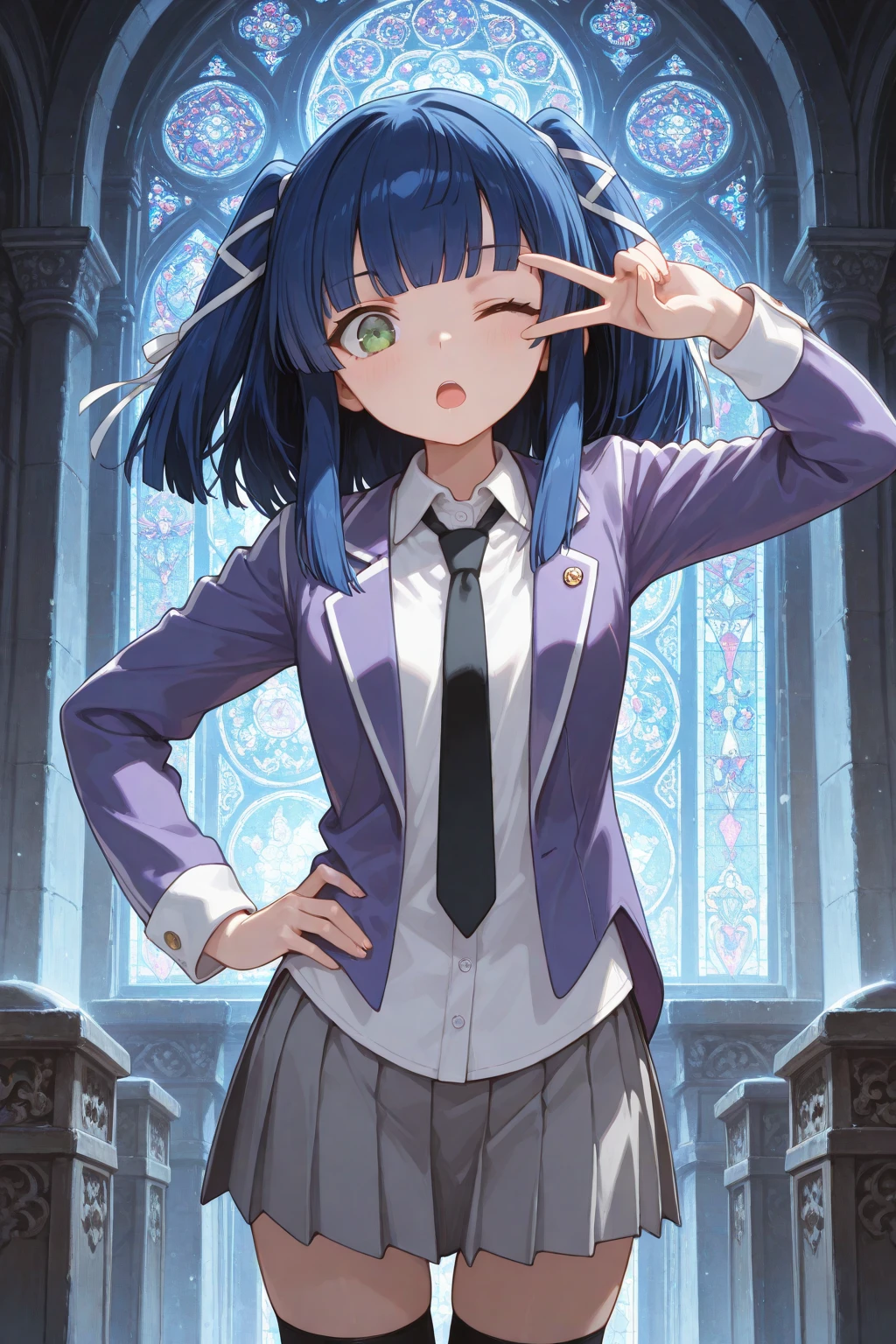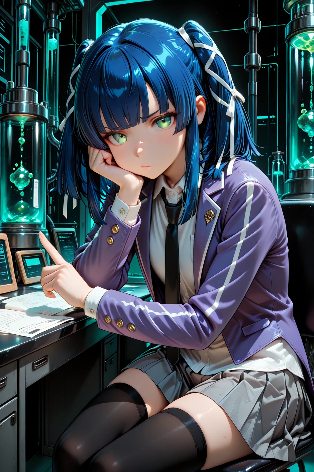 Haduki, blue hair, medium hair, two side up, white ribbon, hair ribbon, blunt bangs, green eyes, school uniform, white shirt, collared shirt, black necktie, purple jacket, long sleeves, , grey skirt, pleated skirt, zettai ryouiki, black thighhighs