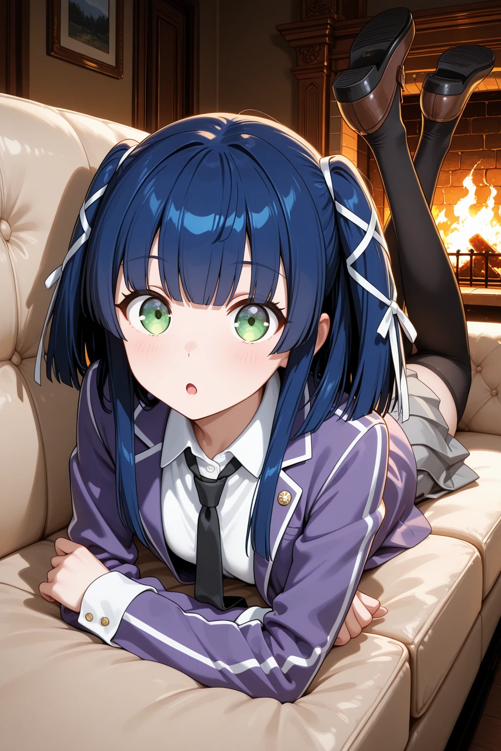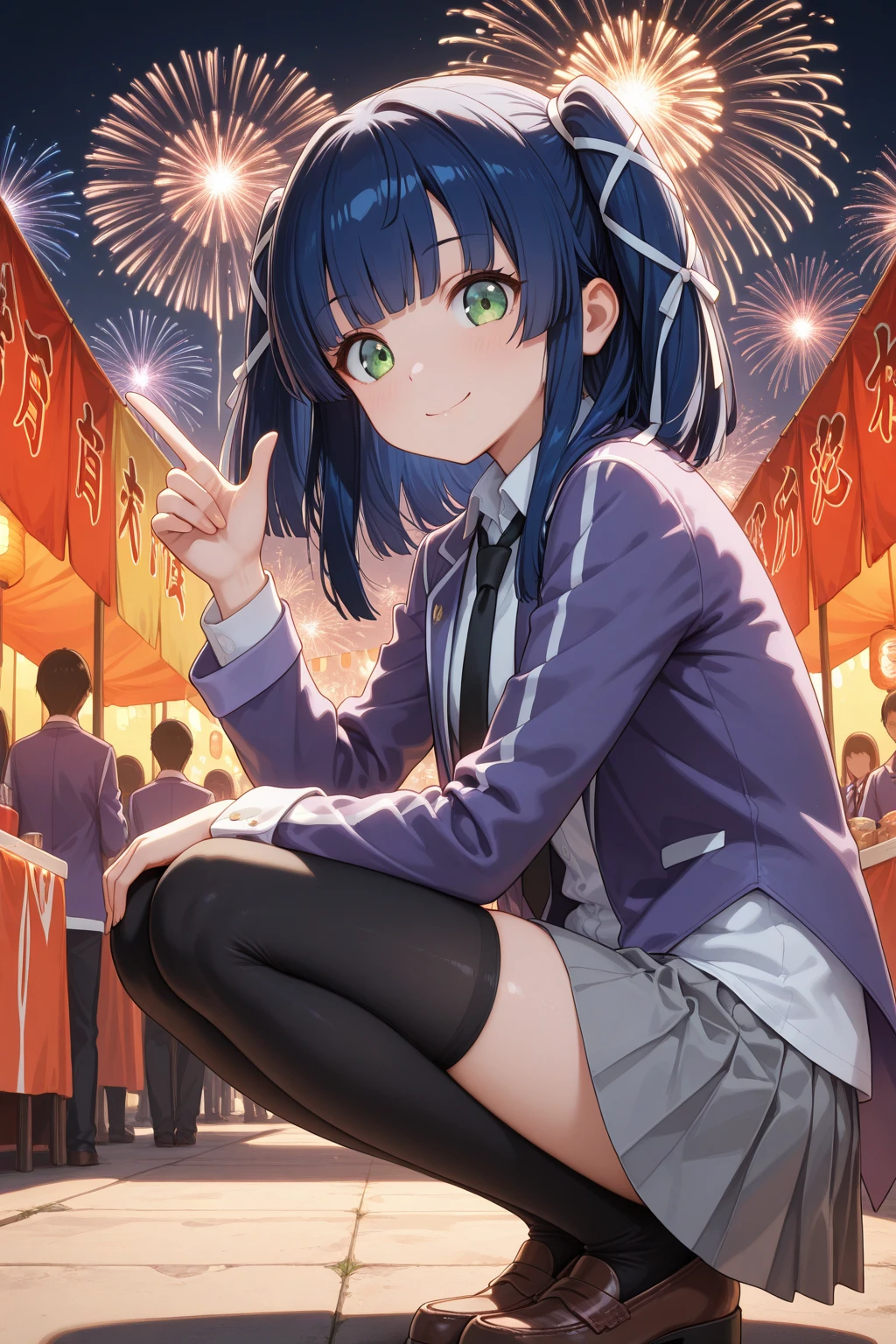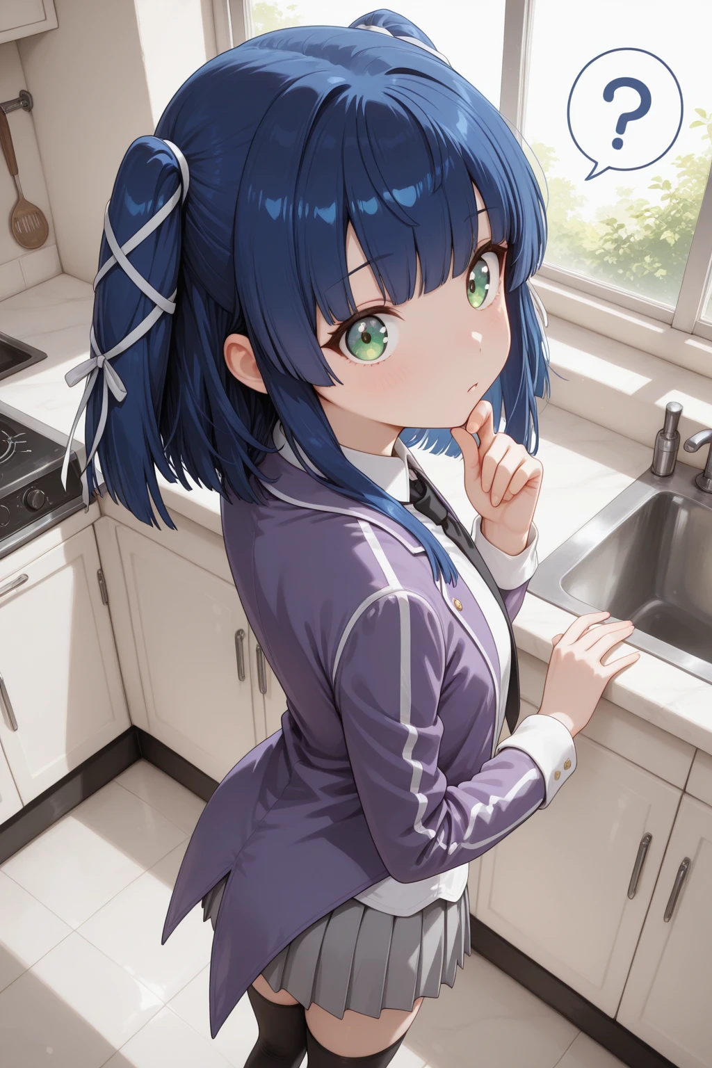 Haduki, blue hair, medium hair, two side up, white ribbon, hair ribbon, blunt bangs, green eyes, school uniform, white shirt, collared shirt, black necktie, purple jacket, long sleeves, , grey skirt, pleated skirt, zettai ryouiki, black thighhighs