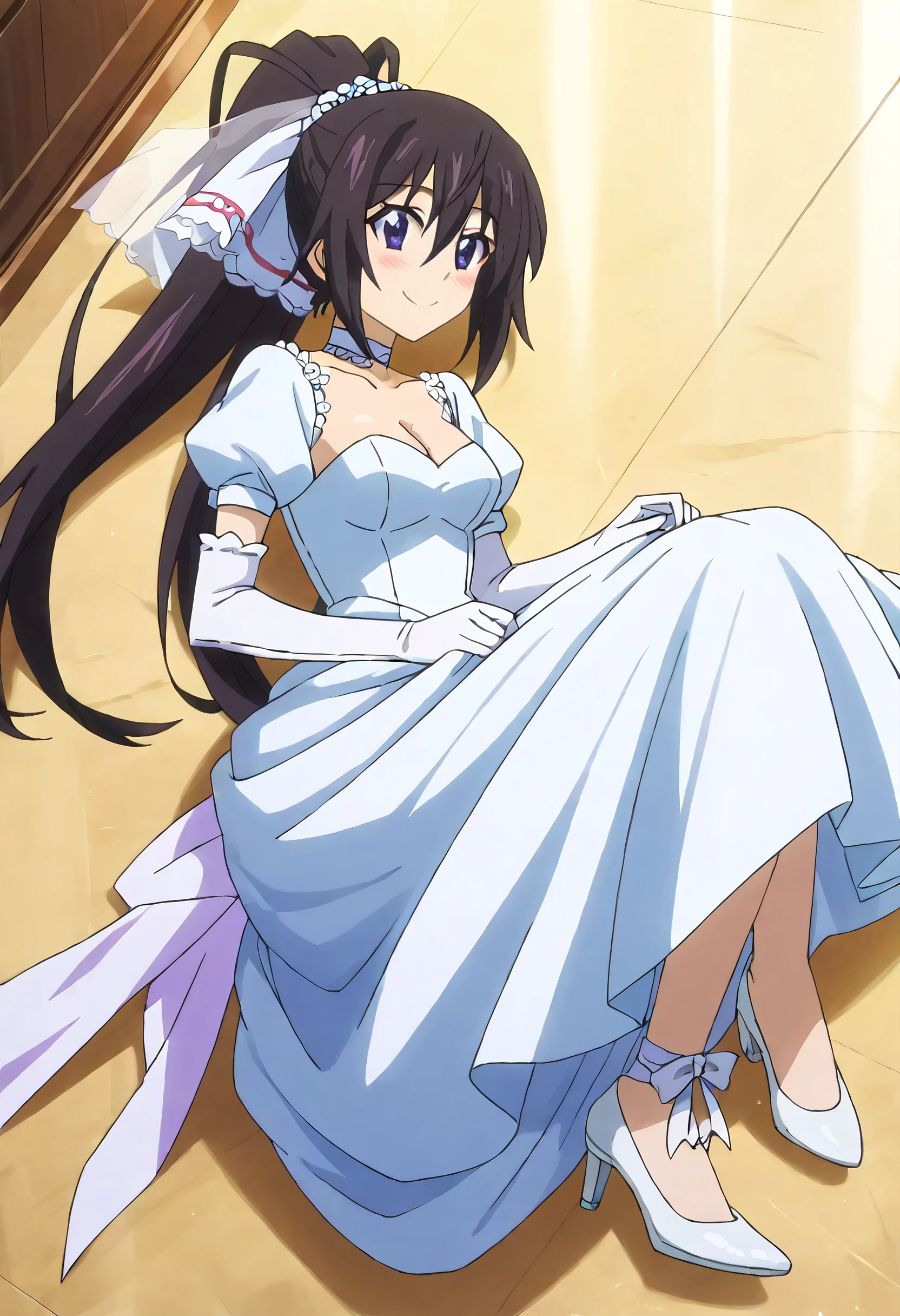 HoukiDressA, dress, ribbon, gloves, hair ribbon, puffy sleeves, white dress, choker, wedding dress, elbow gloves, cleavage, gown, white gloves, diadem, puffy short sleeves, bride, strapless dress, high heels, shoes, white choker, long dress, veil, bridal veil, white ribbon, ankle ribbon, short sleeves,