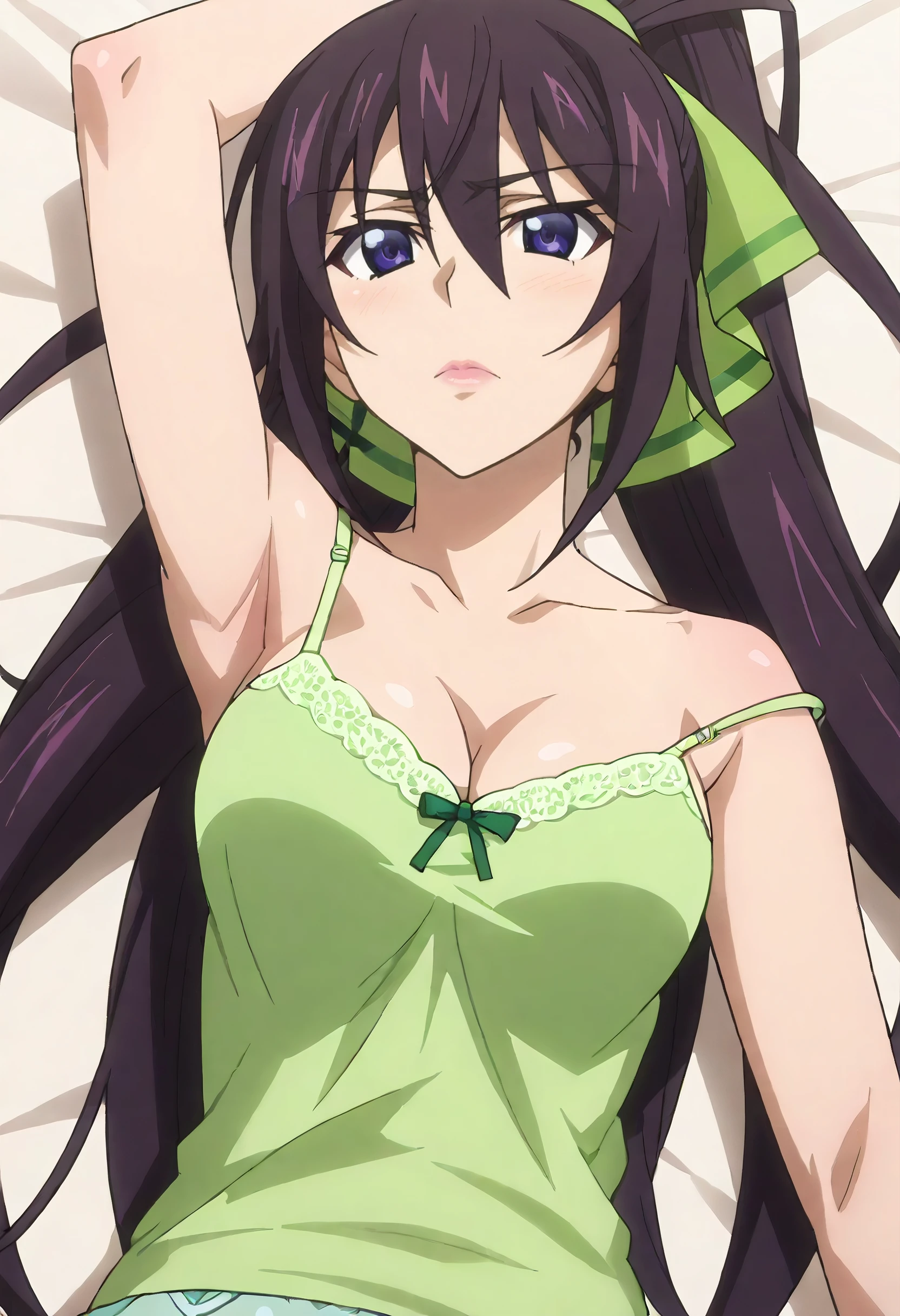 HoukiGreen, hair ribbon, ribbon, bare shoulders, cleavage, green bow, camisole, green ribbon, sleeveless, spaghetti strap, green camisole,