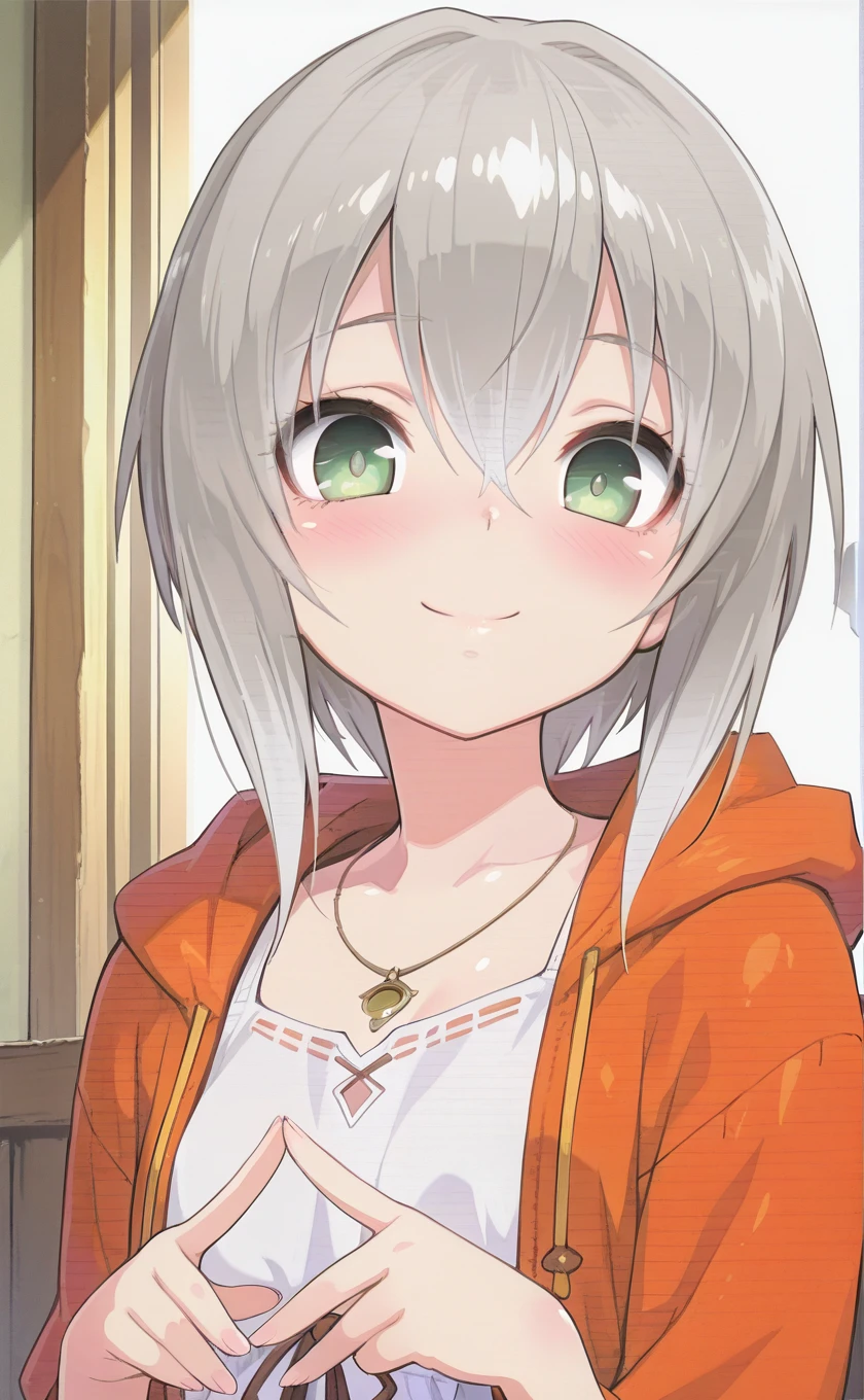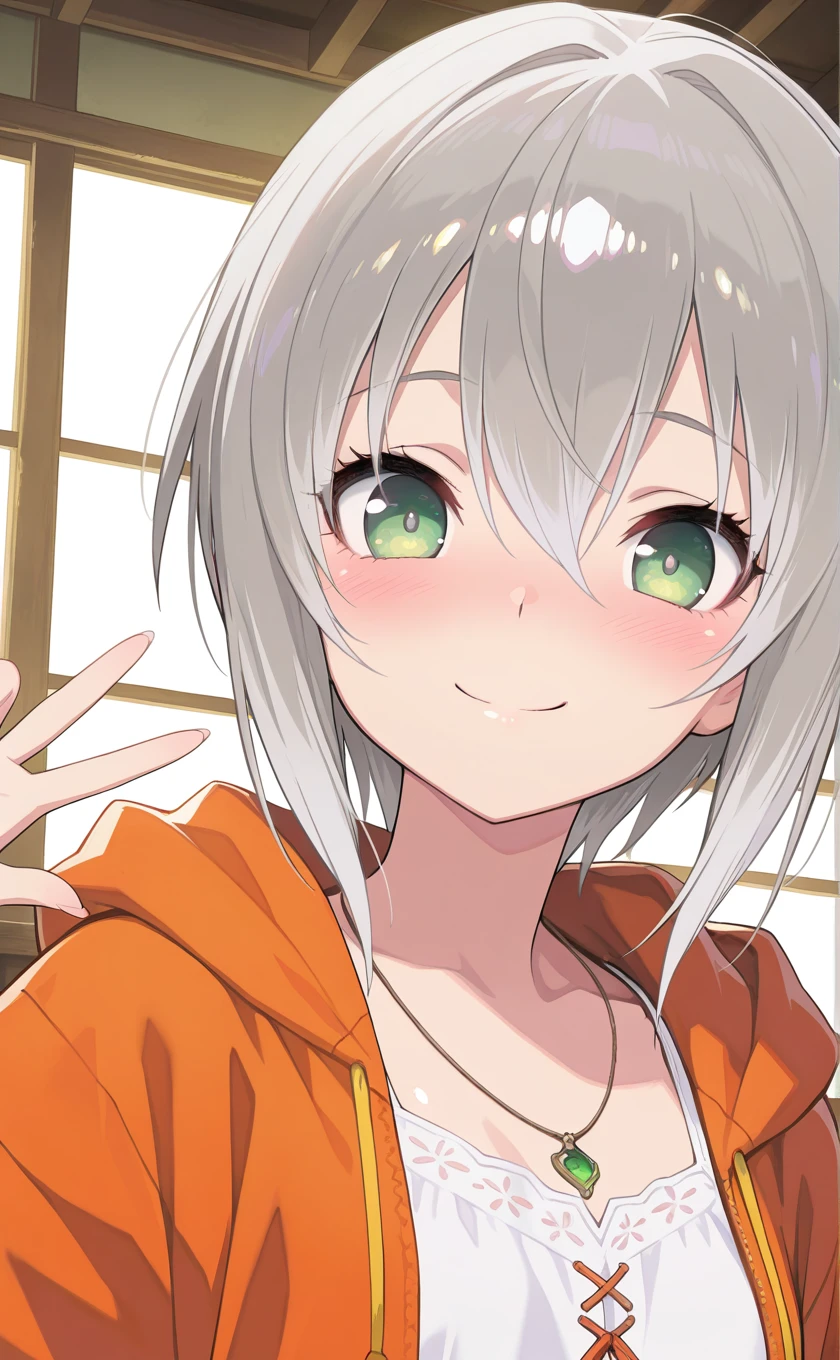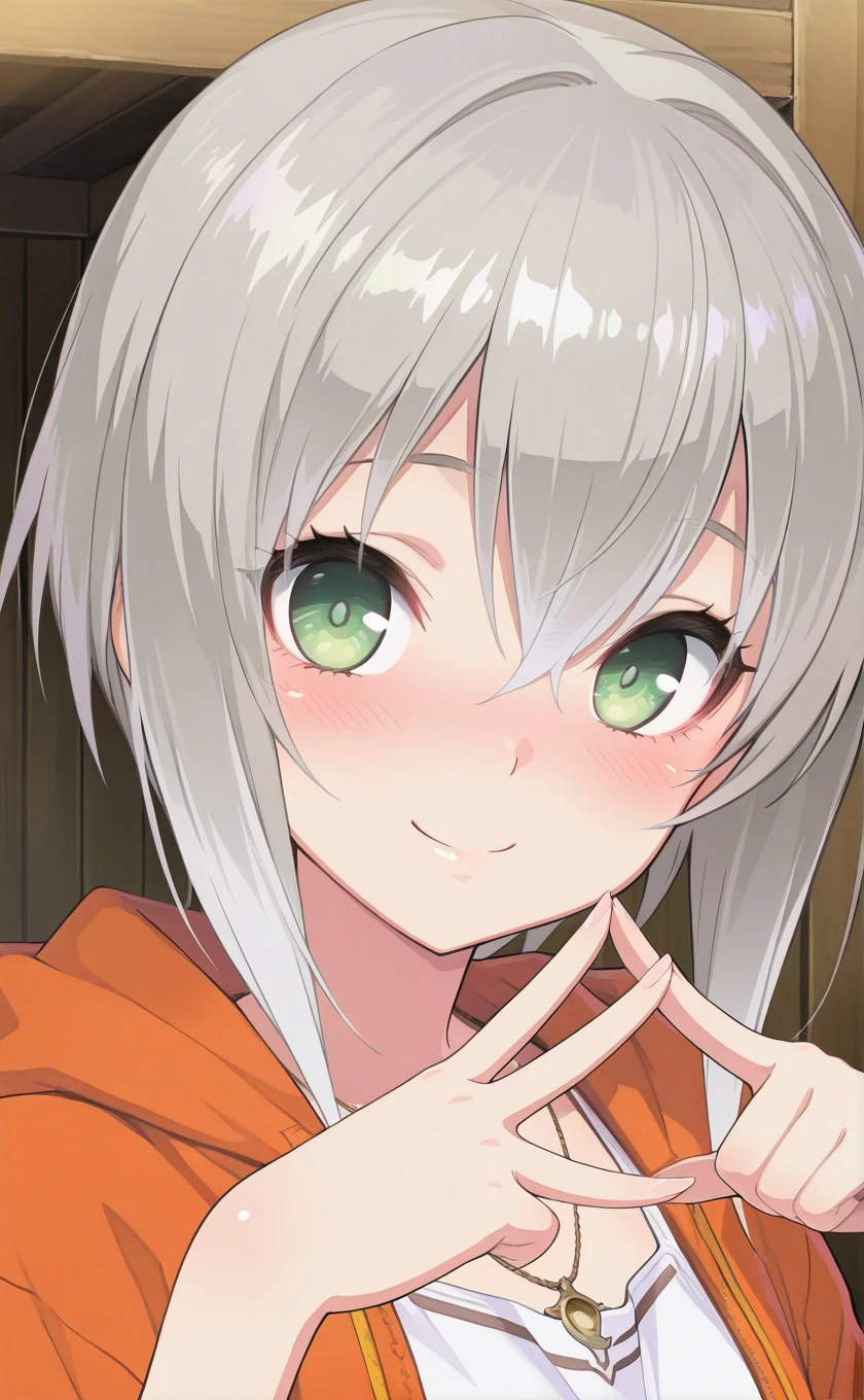 short hair,grey hair,gradient hair,white hair,hair between eyes,green eyes