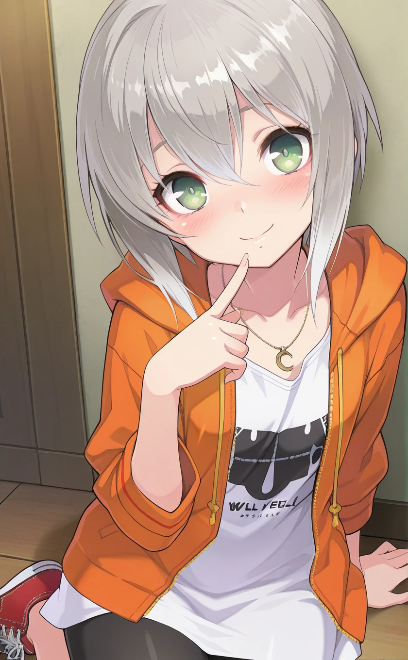 hooded jacket,orange jacket,necklace,white dress,black leggings,sneakers,red footwear
