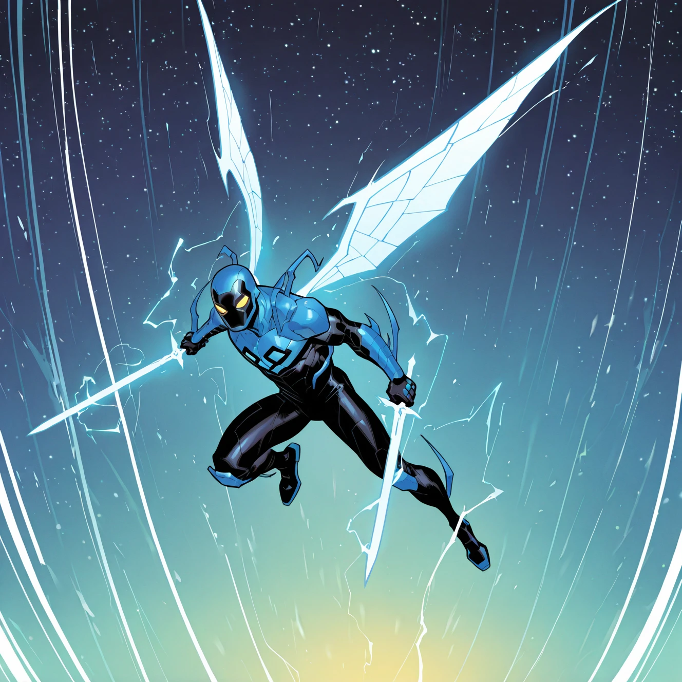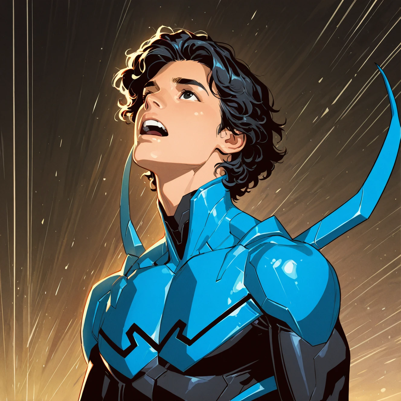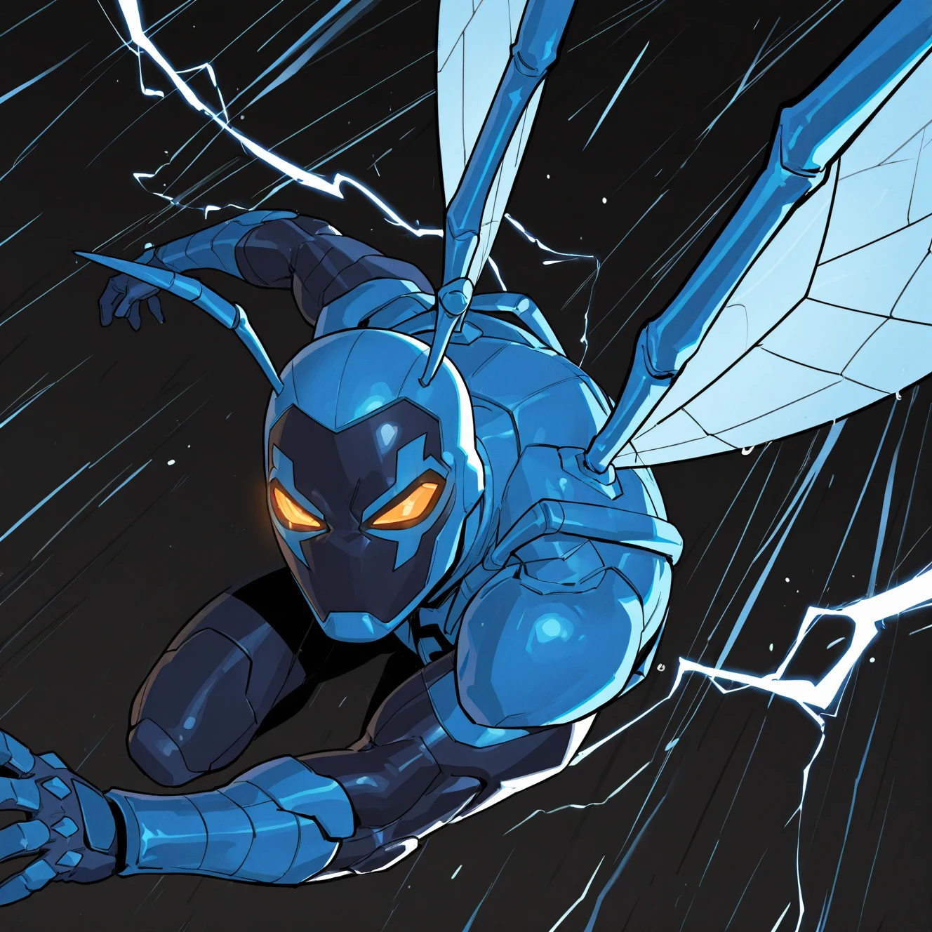 blue_b, solo, short hair, black hair, 1boy, male focus, teeth, wings, dark skin, hair over one eye, armor, torn clothes, muscular, blood, bodysuit, glowing, muscular male, pectorals, dark-skinned male, squatting, motion lines, clenched teeth, claws, blood on face, injury, black bodysuit, on one knee, glowing eye, insect wings, bruise, blue bodysuit, blue wings, blood from mouth, cuts, torn bodysuit, scratches, light trail, arm blade, two-tone bodysuit, grey bodysuit, eye trail, hand on ground, brown eyes, hornsDescription