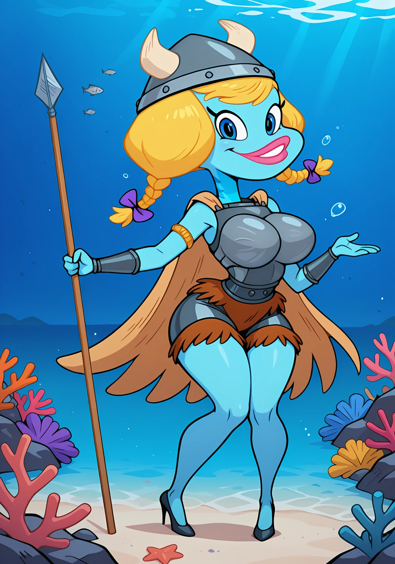 furry female, anthro fish, fish girl, blue skin, colored skin, blonde hair, twin braids, purple bow, pink lips, lipstick, blue eyes