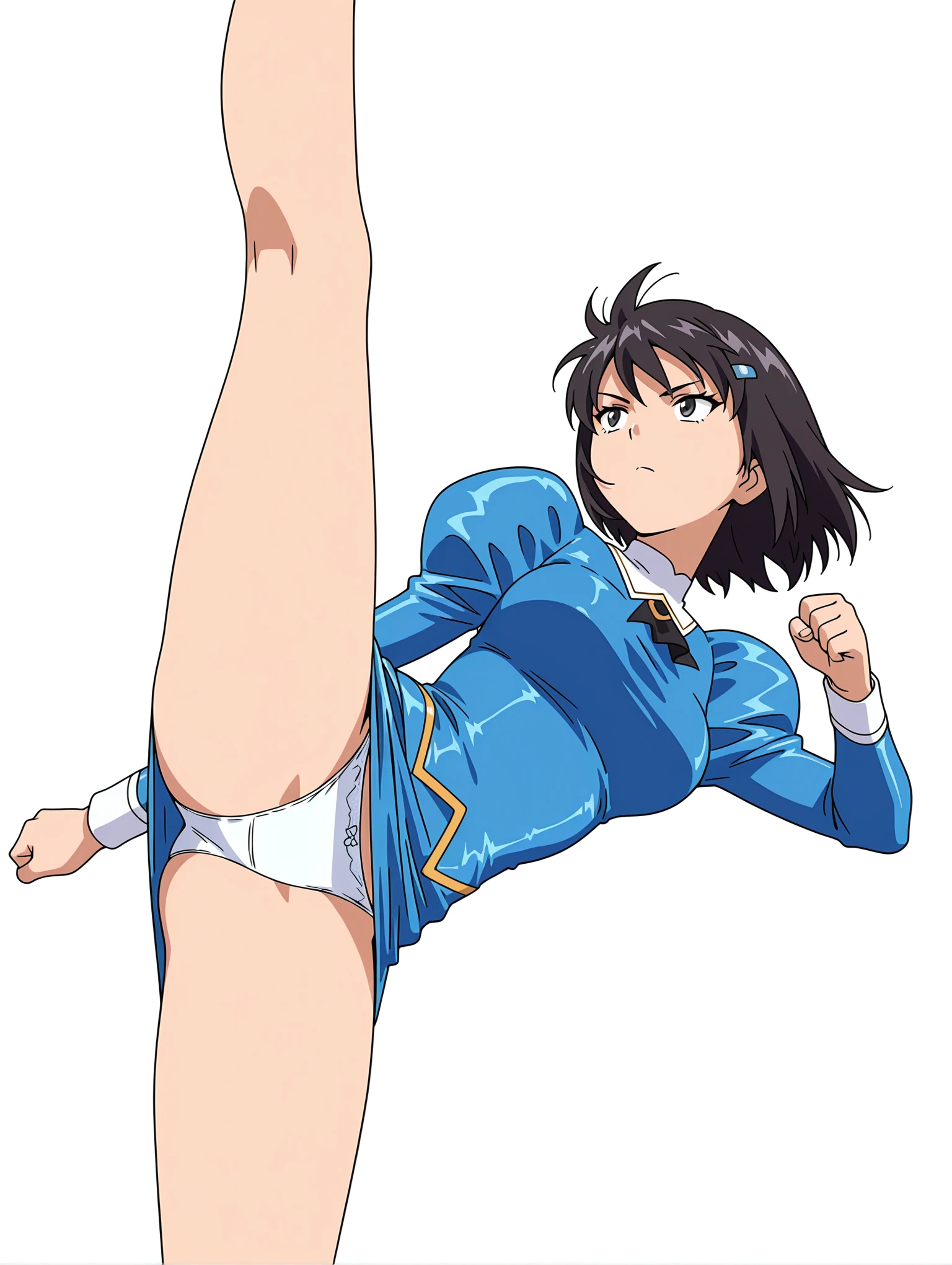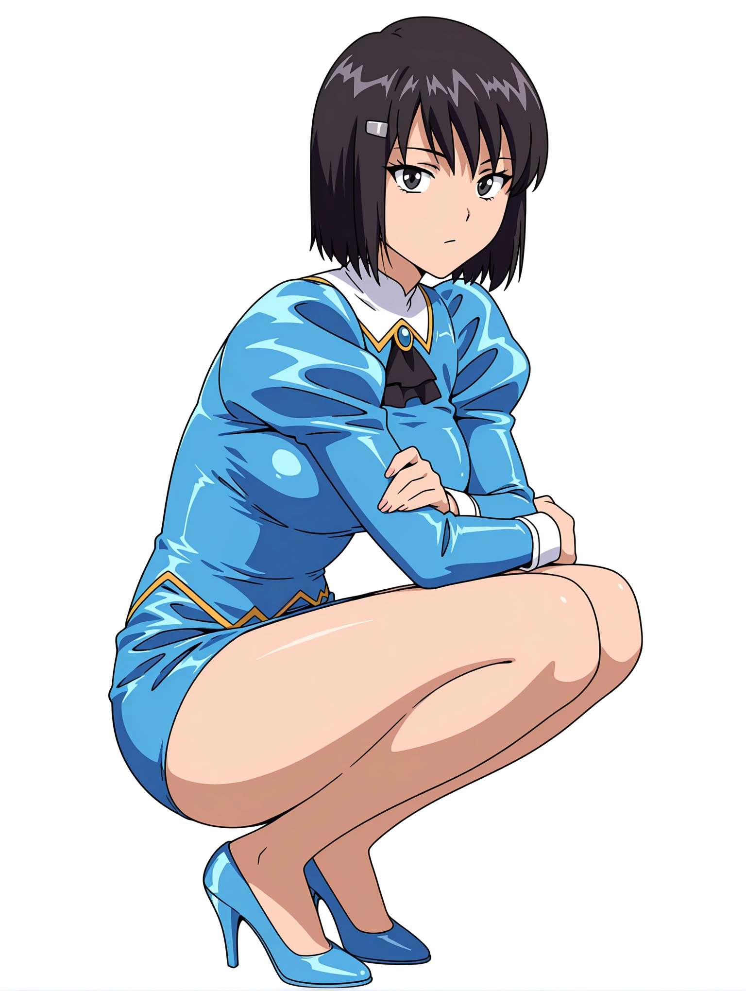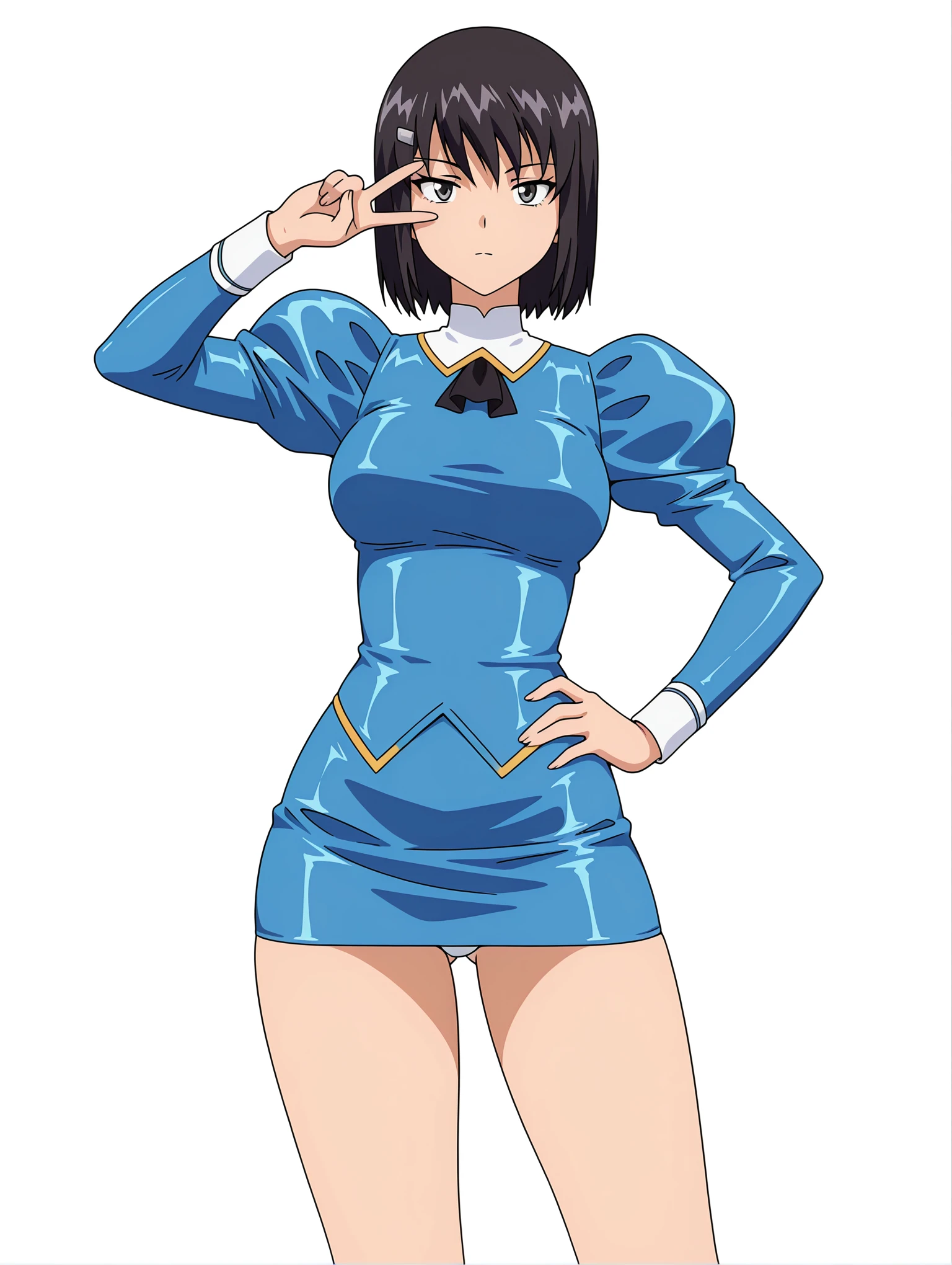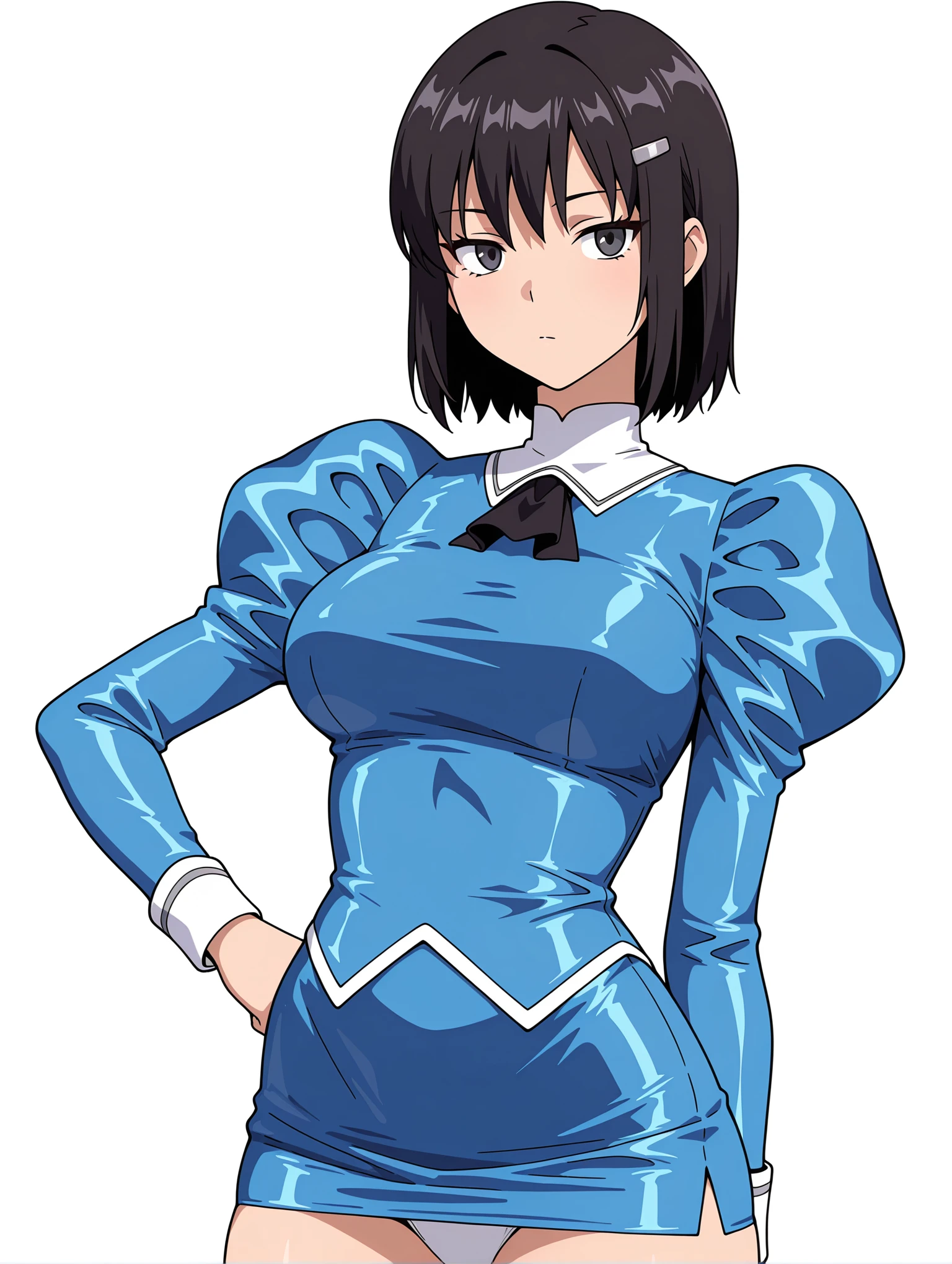 b_clothes,black ascot,blue dress,juliet sleeves,long sleeves,blue pencil_skirt,white panties,no socks,blue high heels,