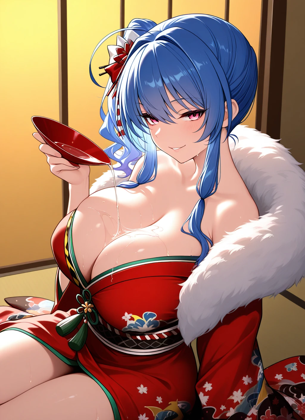 雪下之饮(spirits_in_the_snow):st._louis_\(azur_lane\),kimono, sash, wide sleeves, obi, off shoulder, hair flower, fur trim,