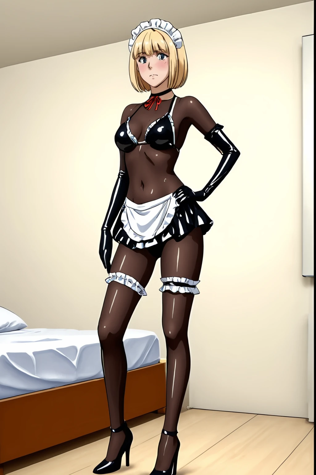 MaidNicole,bodystocking, frilled bikini, latex bikini, elbow gloves, latex gloves, bridal garter, choker, neck ribbon, maid headdress, apron,miniskirt, high heels,