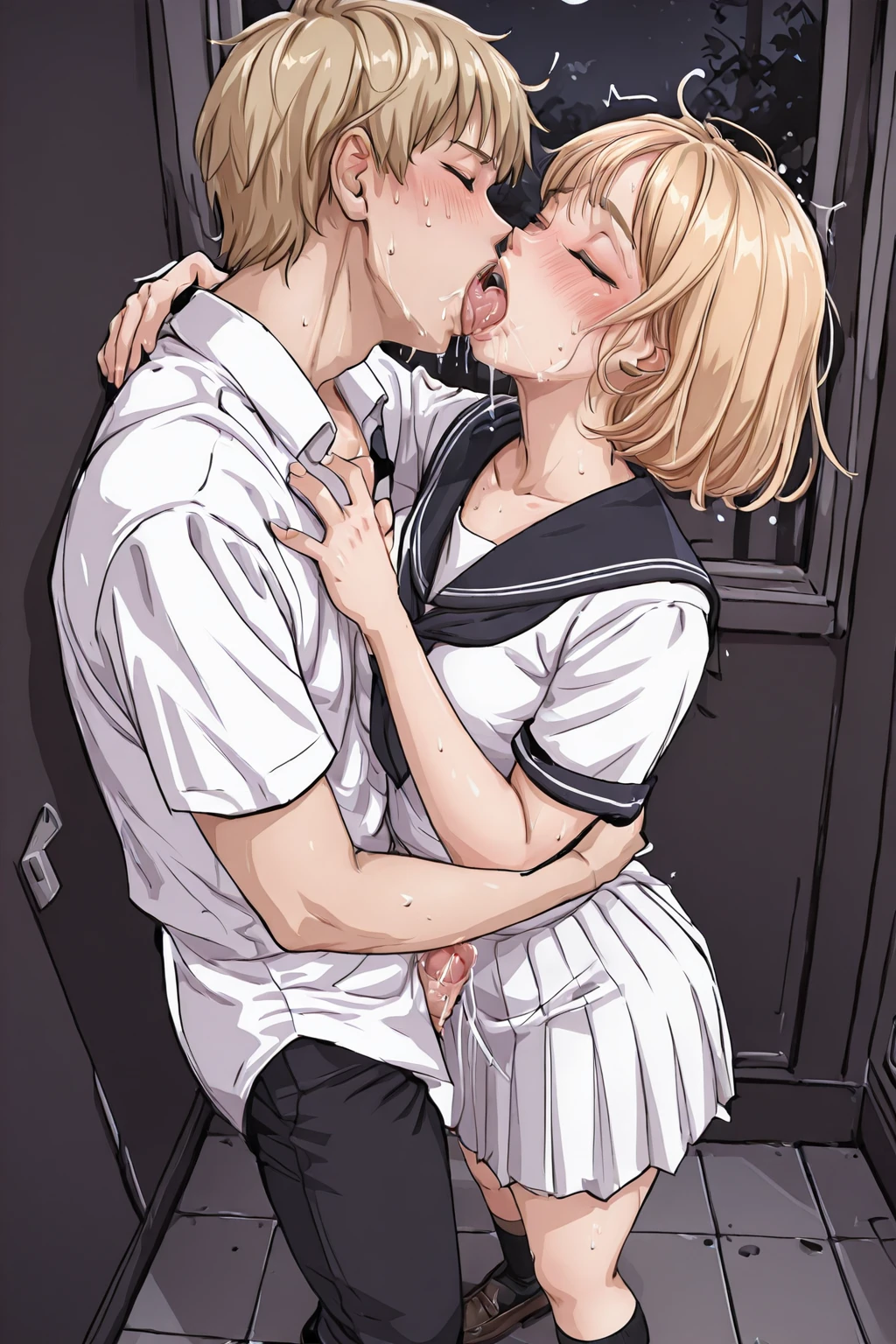 nicoleninagawa, short hair, bangs, blonde hair,school uniform, white shirt, short sleeves, pleated skirt, serafuku, socks,sailor collar, black socks, loafers,white skirt,
