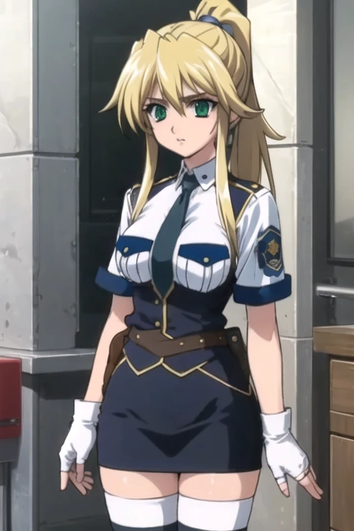RioKinezono, 1girl, solo, long hair, ponytail, miniskirt, blonde hair, white thighhighs, green eyes, necktie, belt, fingerless gloves, police uniform, white thighhighs, pencil skirt, police uniform,