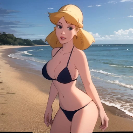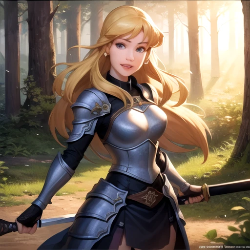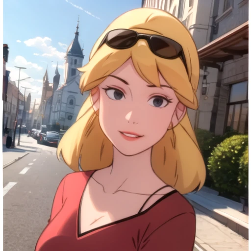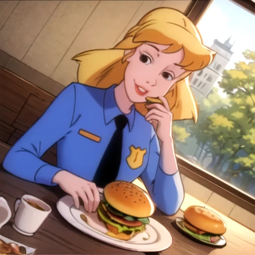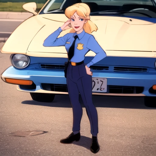 General prompt: Miranda Wright, 1girl, long hair, smile, blonde hair, shirt, necktie, collared shirt, belt, pants, uniform, black eyes, blue shirt, black necktie, blue pants, police, police uniform, policewoman