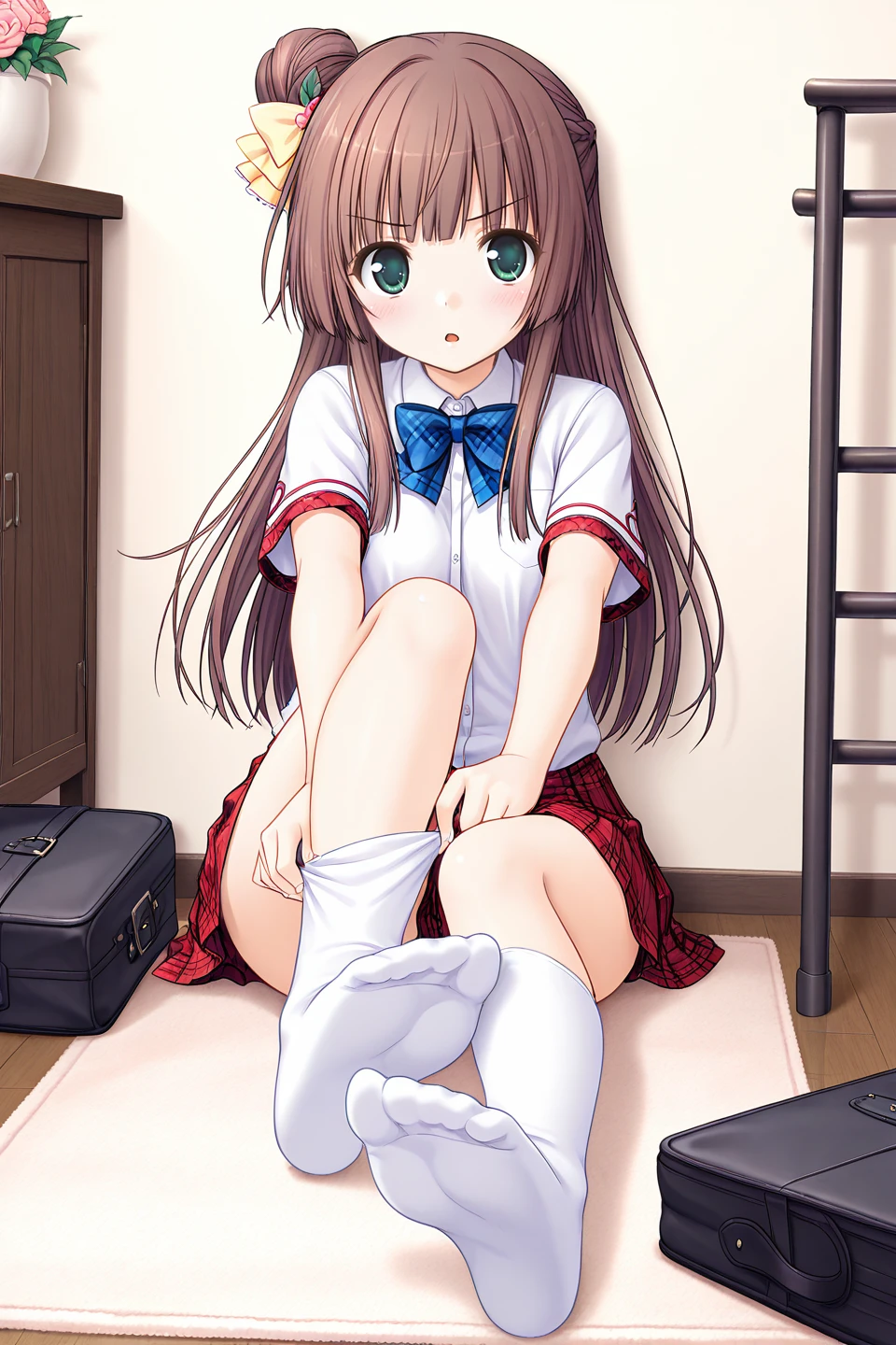 summer uniform,school uniform,white shirt,collared shirt,blue bowtie,plaid bowtie,short sleeves,untucked shirt,red skirt,miniskirt,plaid skirt,pleated skirt,kneehighs,white socks,loafers,brown footwear,