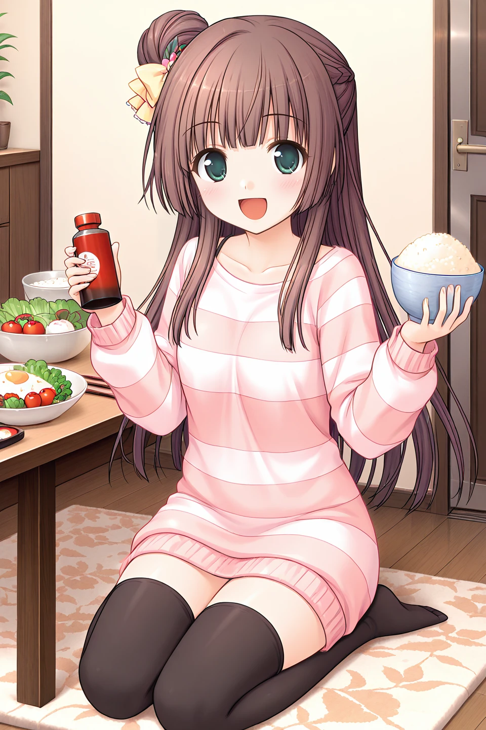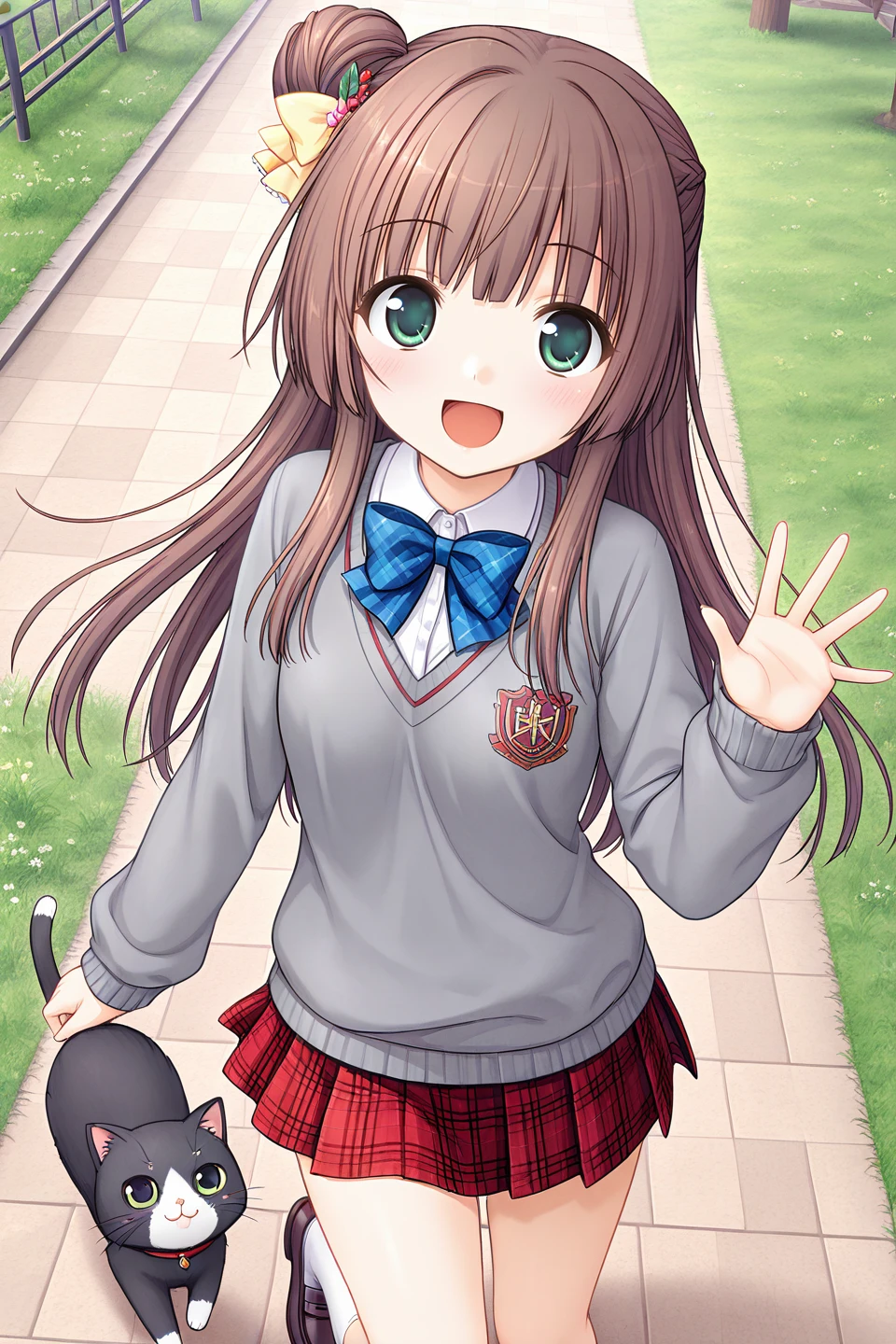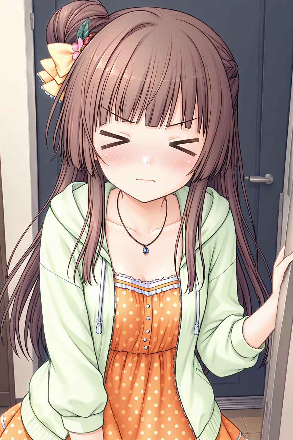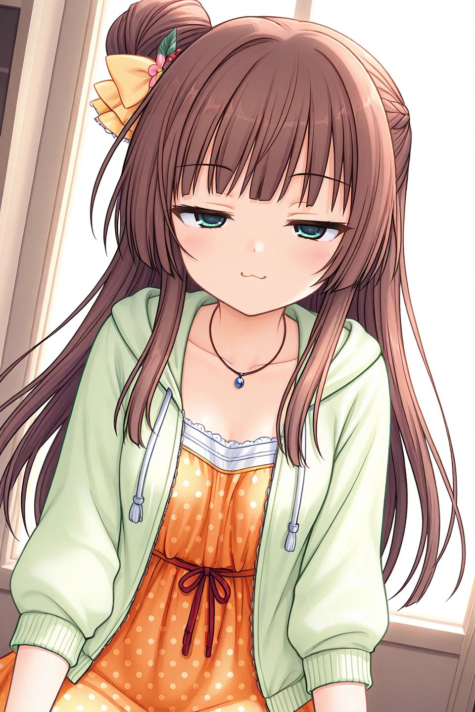 fujimiyasakuya-shippodays,1girl,solo,green eyes,brown hair,blunt bangs,sidelocks,hair intakes,very long hair,single hair bun,single side bun,hair bow,yellow bow,hair flower,leaf hair ornament,maple leaf,petite,