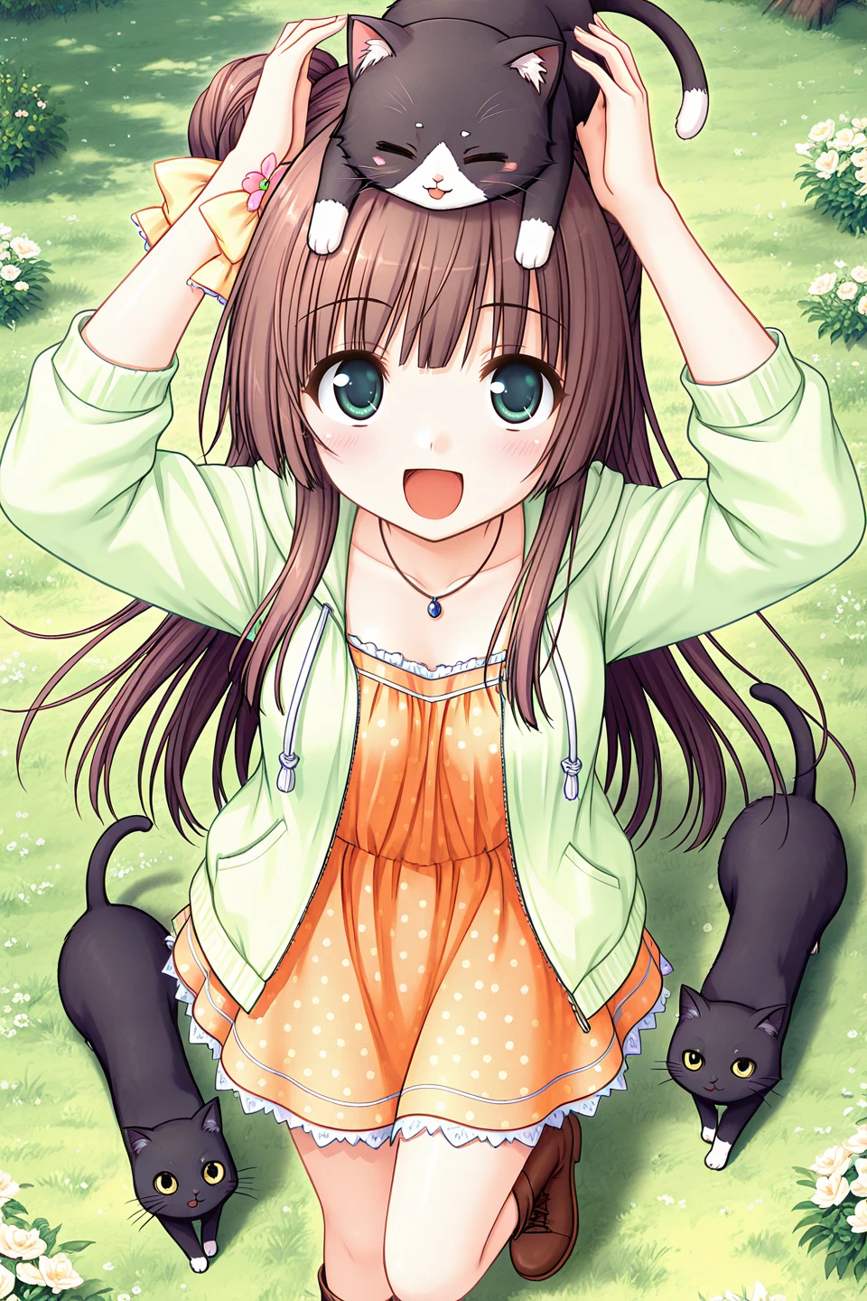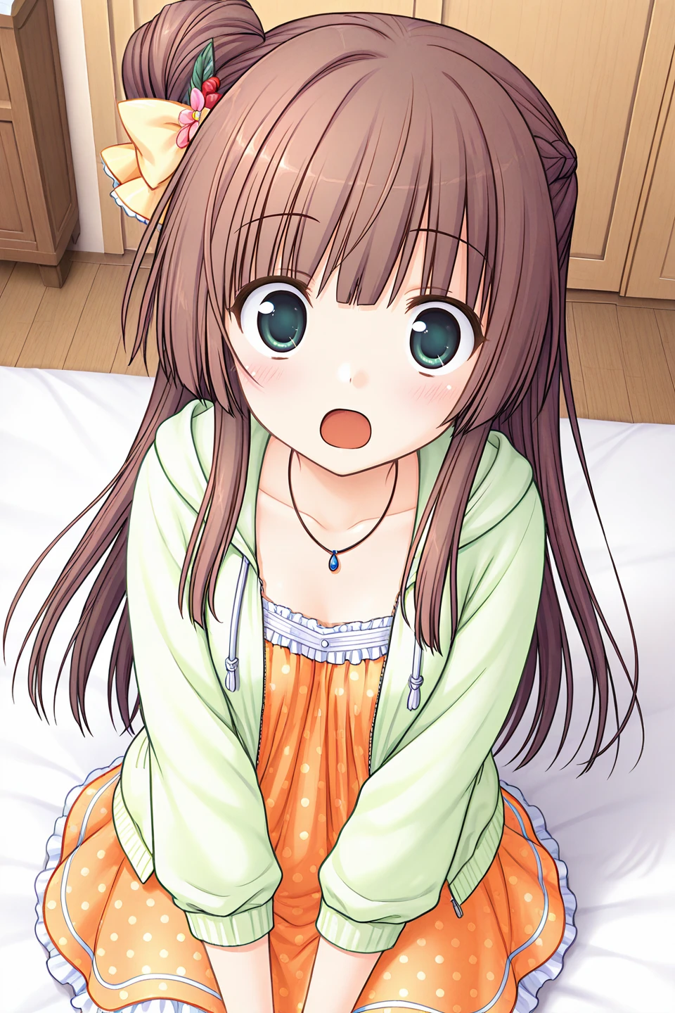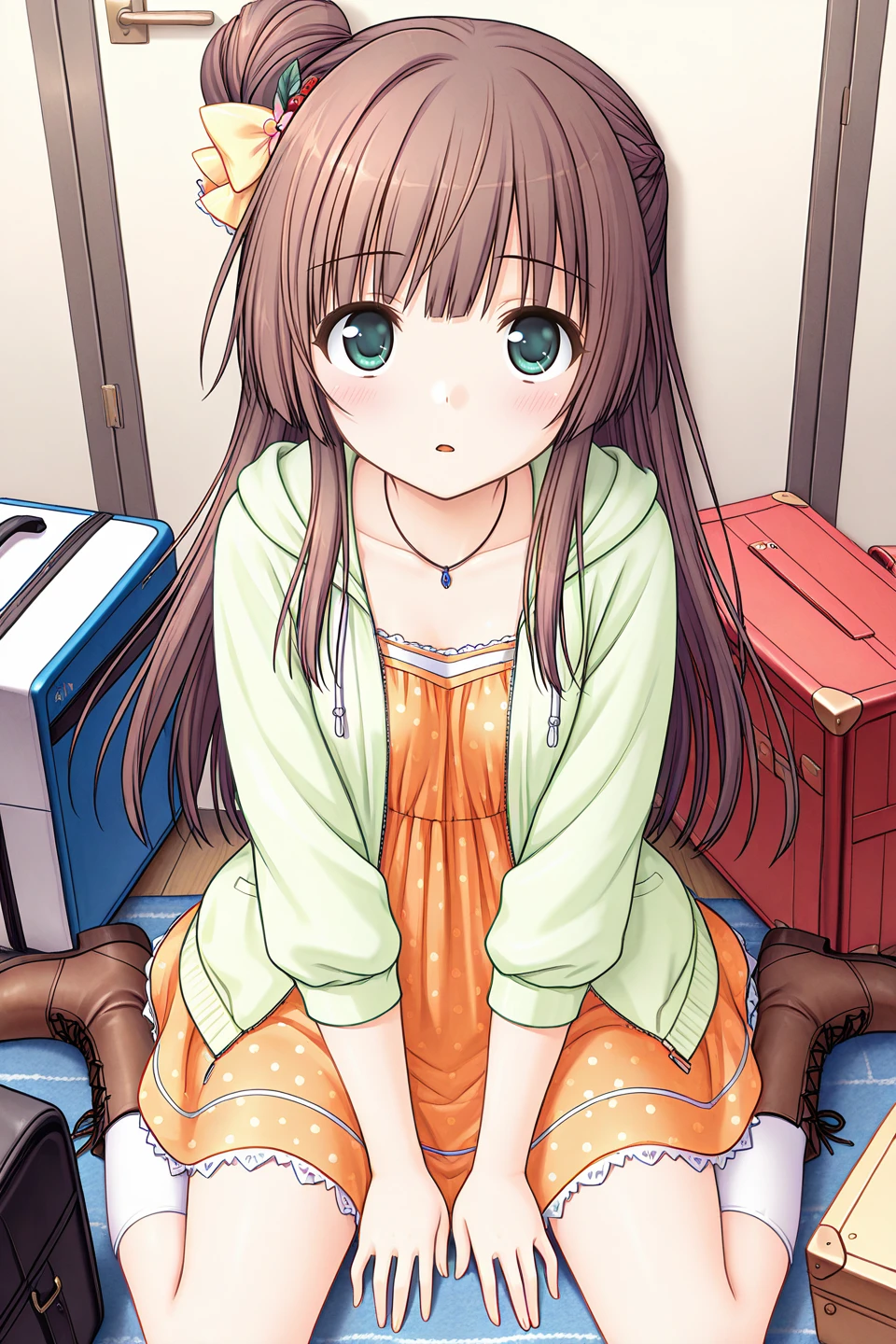 casual,hooded jacket,light green jacket,light green hood,hood down,open jacket,necklace,collarbone,cleavage,long sleeves,sleeves past elbows,sleeves pushed up,zipper,drawstring,unzipped,orange dress,strapless dress,polka dot dress,frilled dress,short dress,floral print,circle skirt,kneehighs,pink socks,knee boots,cross-laced footwear,brown footwear,a