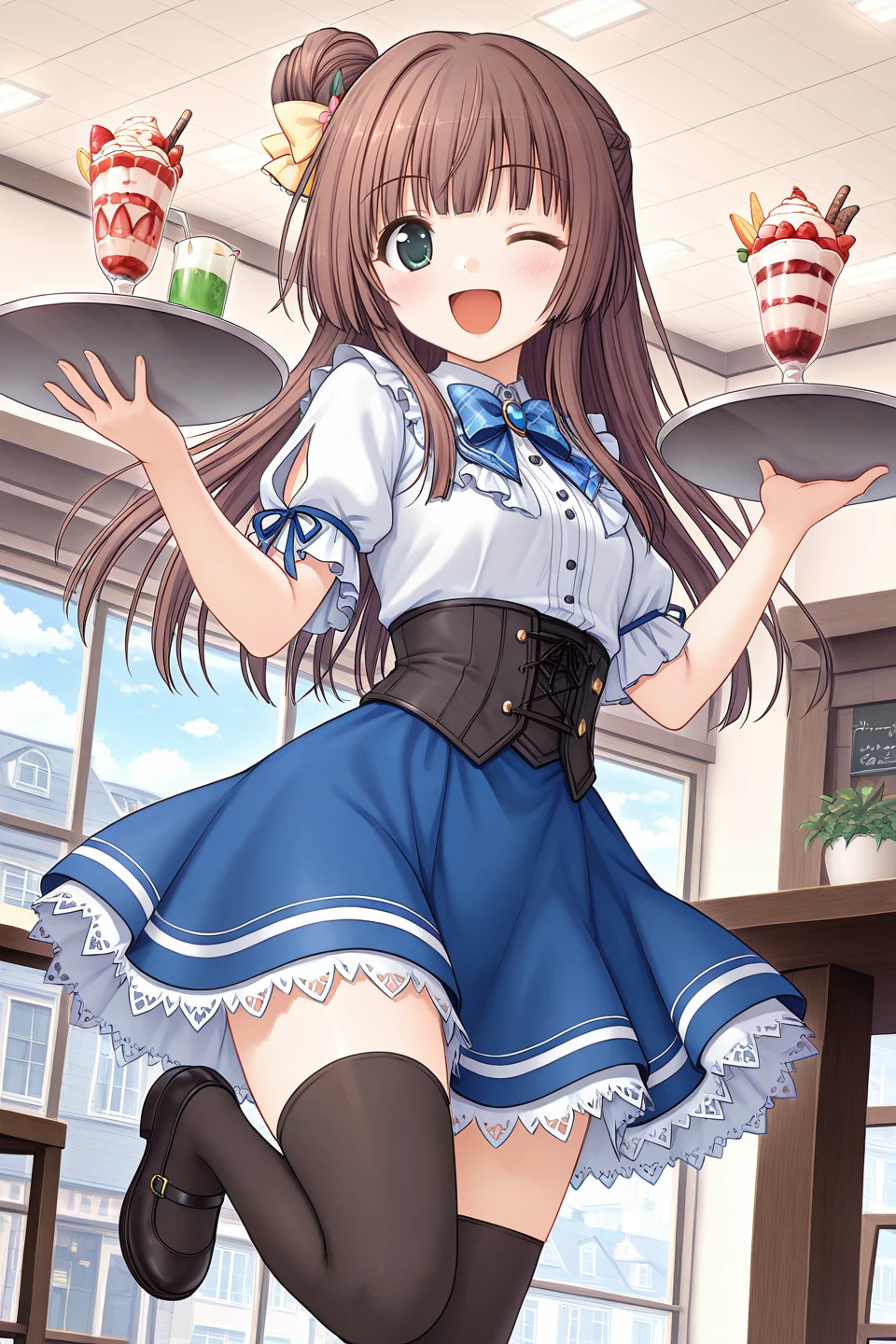 no headwear,white dress,dress shirt,blue bowtie,plaid bowtie,frilled shirt collar,buttons,puffy short sleeves,arm ribbon,blue ribbon,black corset,cross-laced clothes,name tag,blue skirt,lace-trimmed skirt,pleated skirt,striped skirt,white line,petticoat,black thighhighs,mary janes,black footwear,