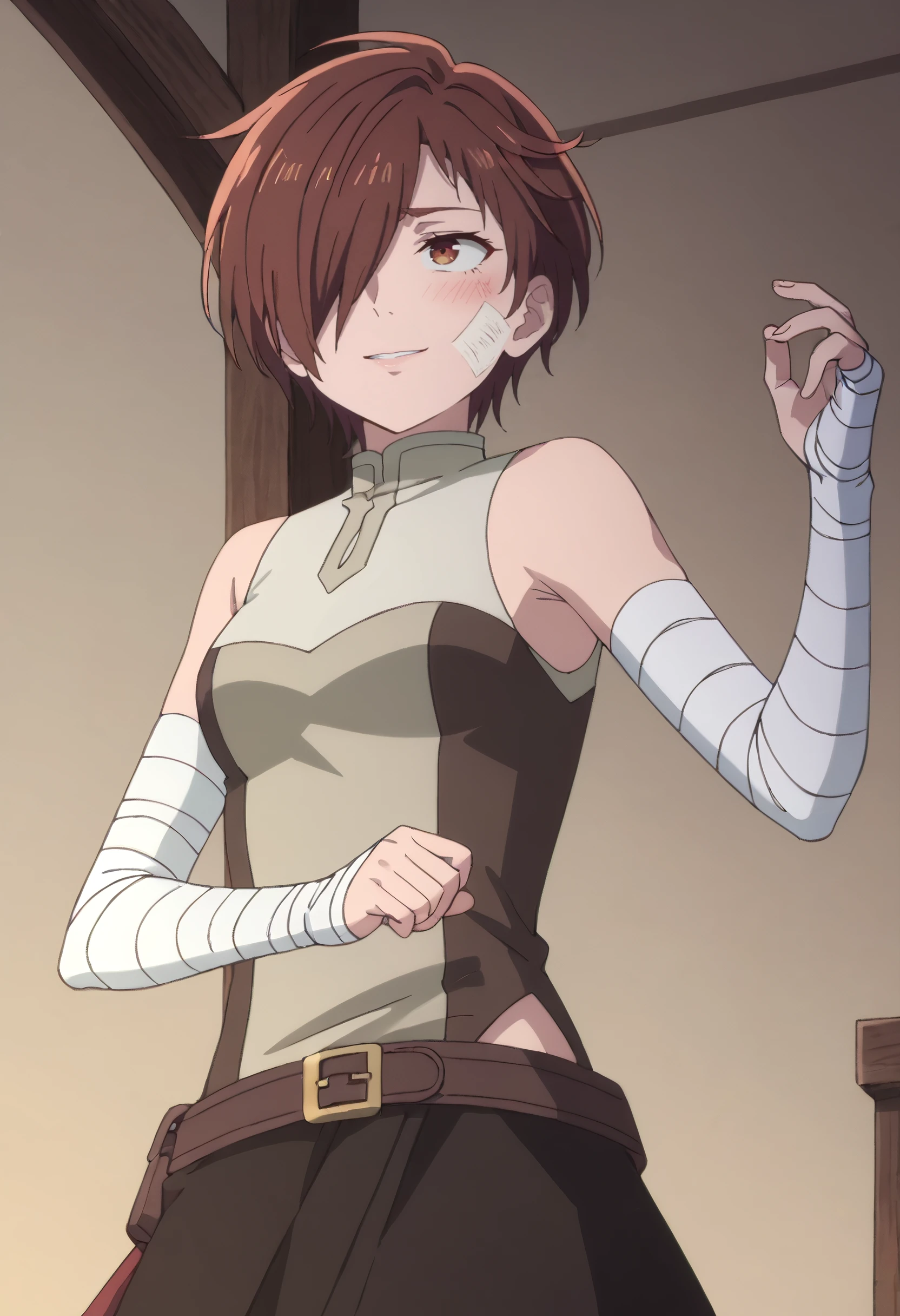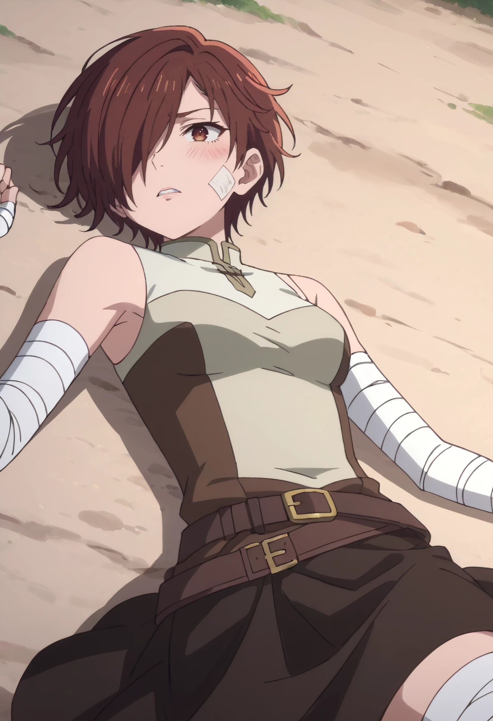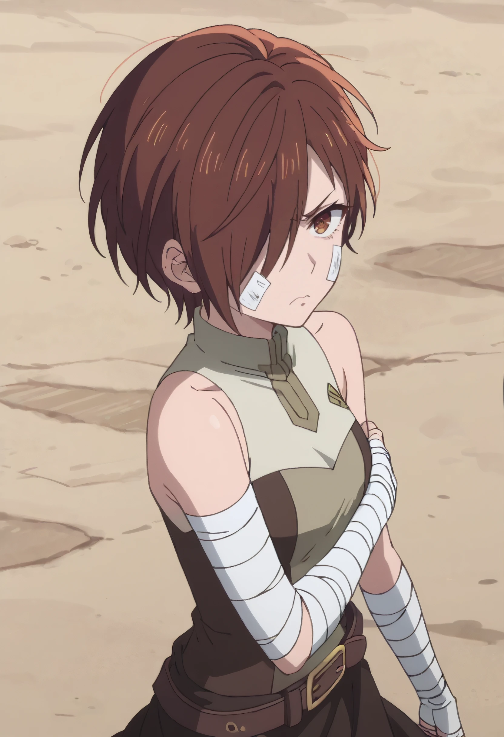 bandages, bandaged arm, bandaged hand, bandaid, arm wrap, bandaid on face, cast, sleeveless, bare shoulders, wrist wrap, shirt, skirt, sleeveless shirt, turtleneck, belt, brown belt, black skirt, bandaged leg, leg wrap,