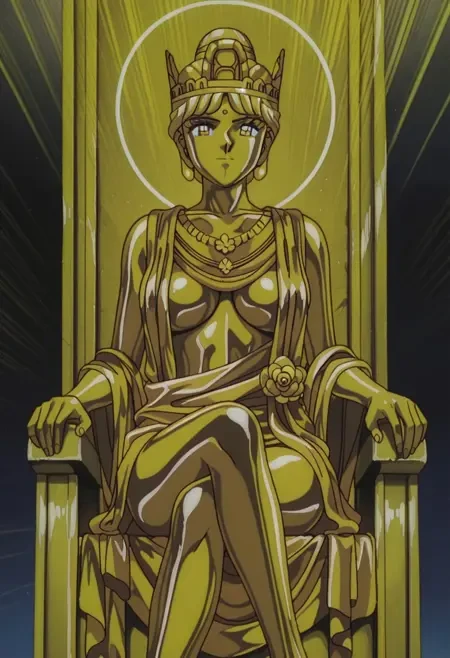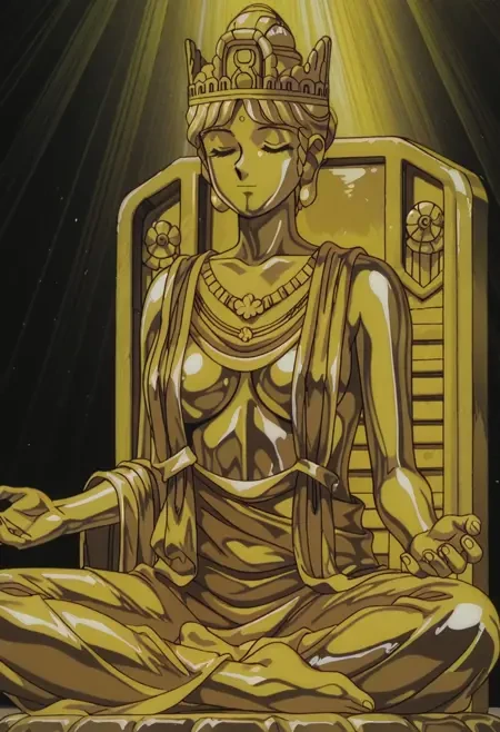 GoldenBuddahHoney, 1girl, solo, retro artstyle, 1990s \(style\), golden hair, hair bun, short hair, golden eyes, white sclera, eyelashes, forehead mark, large breasts, colored skin, yellow skin, golden skin, golden crown, golden jewelry, glowing, golden robe, underboob, halo, golden necklace, barefoot, golden statue,