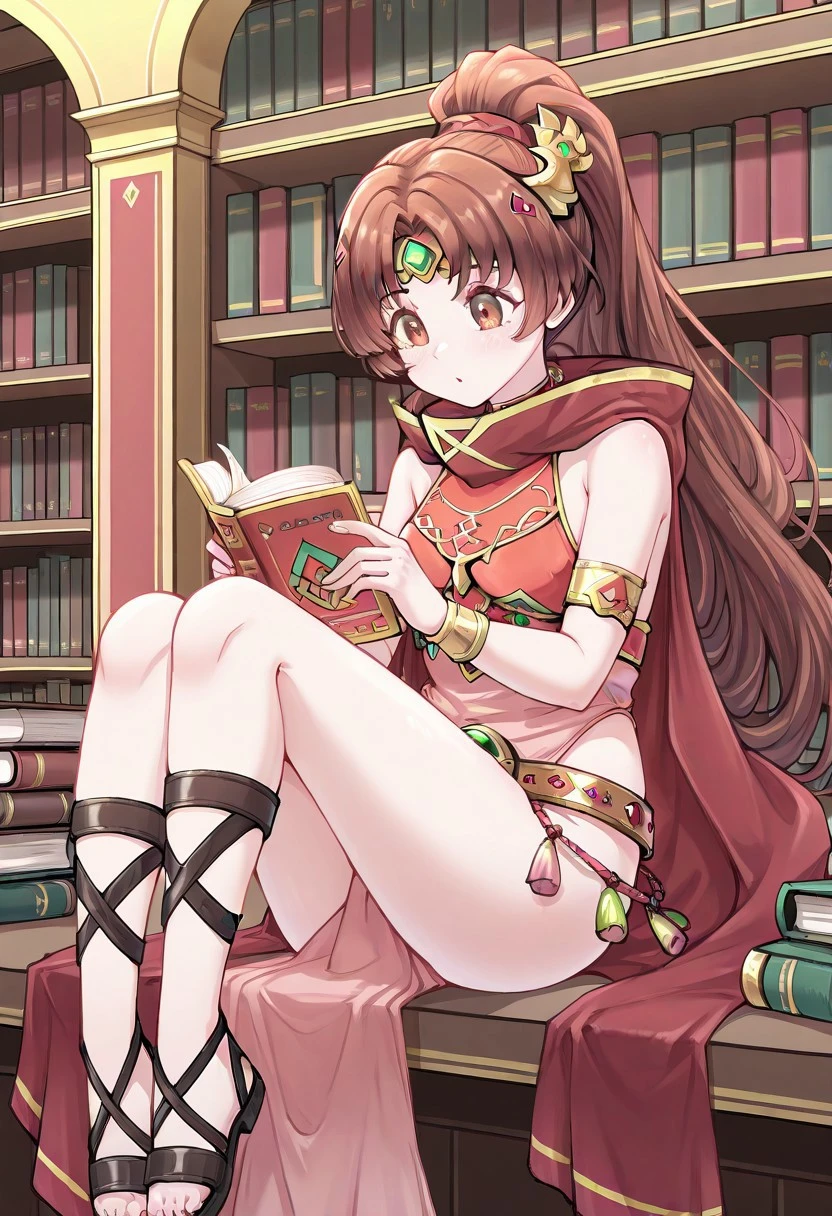 LindeFE, LindeKhadein, brown hair, brown eyes, ponytail, red and pink dress, gold accessories, red gem belt, black sandals, red capeResplendent