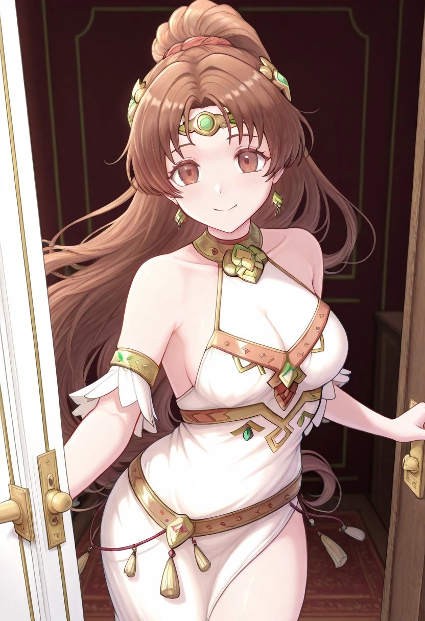 LindeFE, LindeResp, brown hair, brown eyes, ponytail, white and gold dress, gold accessories, green gem on forehead