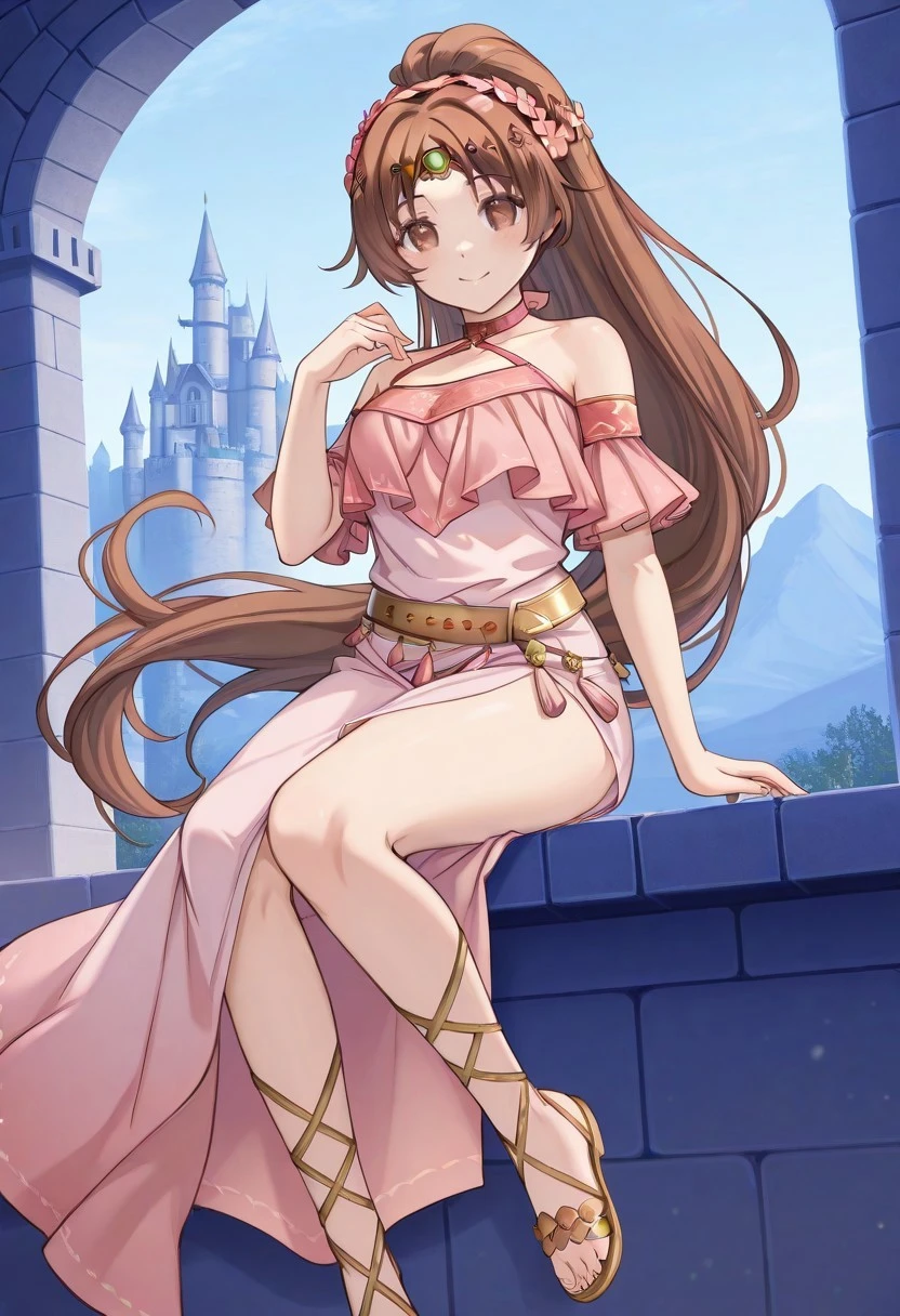 LindeFE, LindeFEH, brown hair, brown eyes, ponytail, pink off-shoulder dress, gold belt, sandals, floral headbandSummer