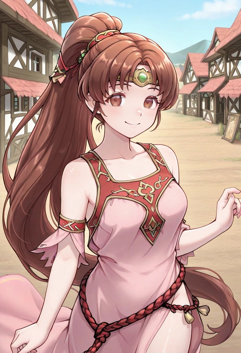 LindeFE, LindeDef, brown hair, brown eyes, ponytail, pink dress, gold-red trim, red rope belt, high slitsHeroes