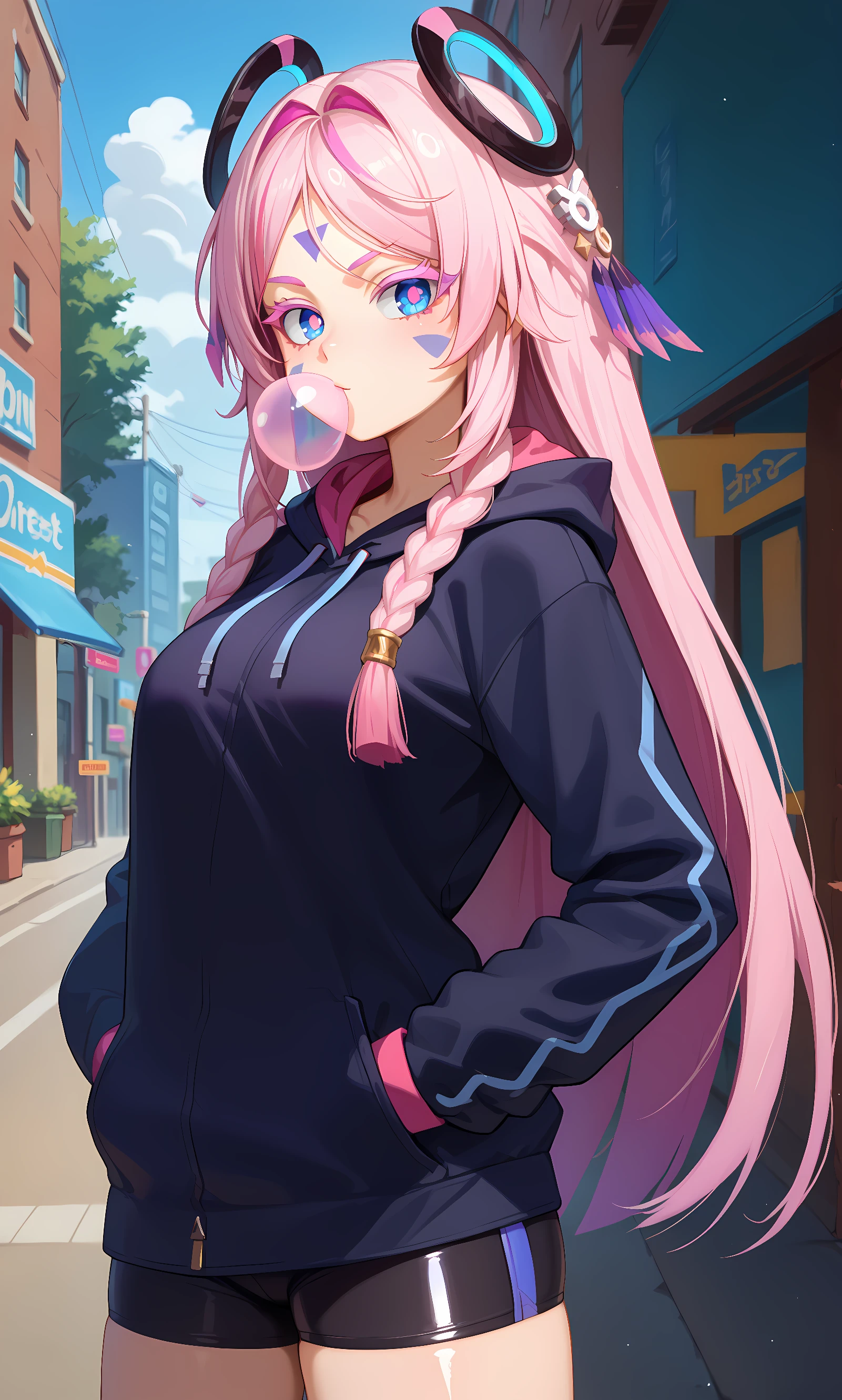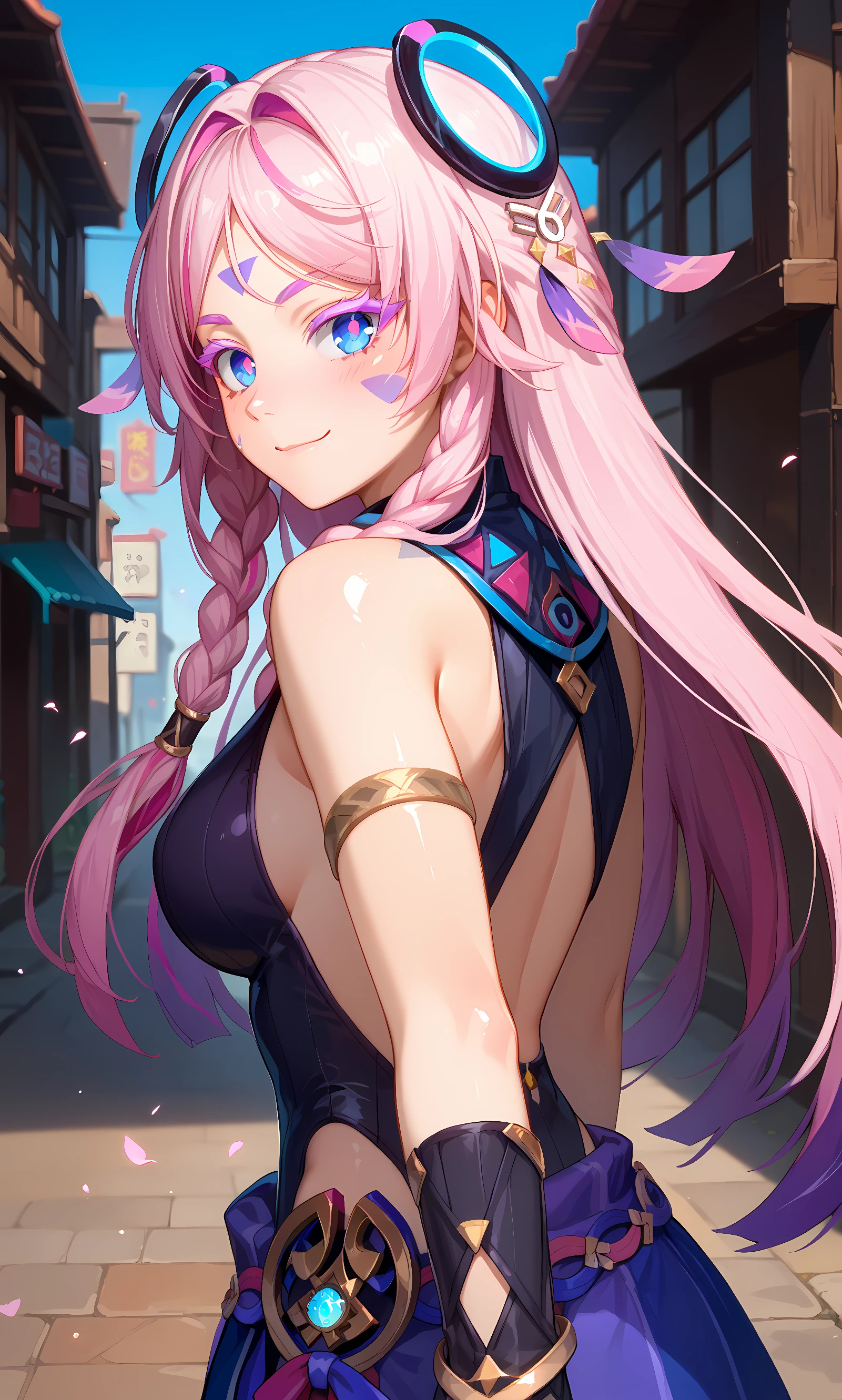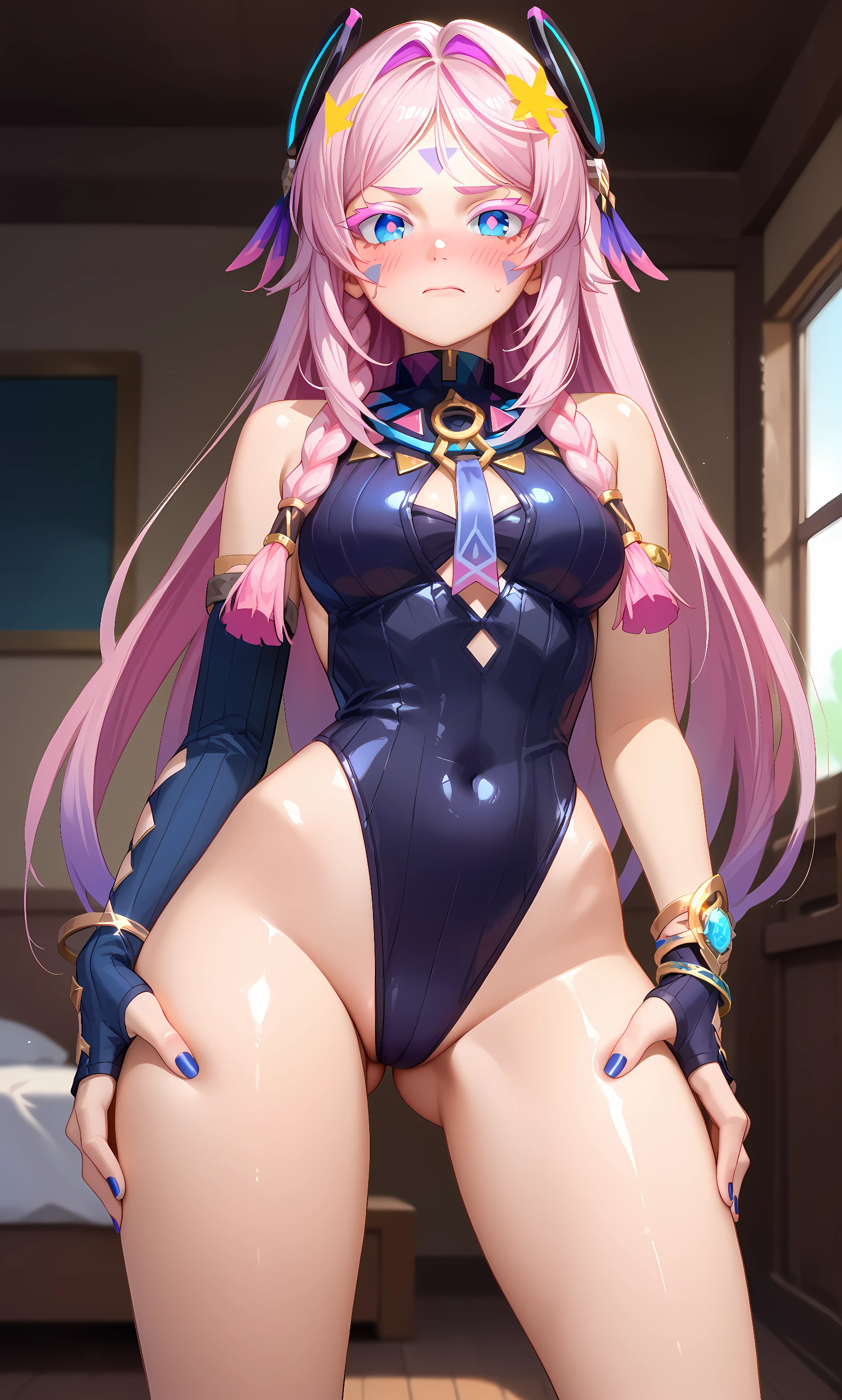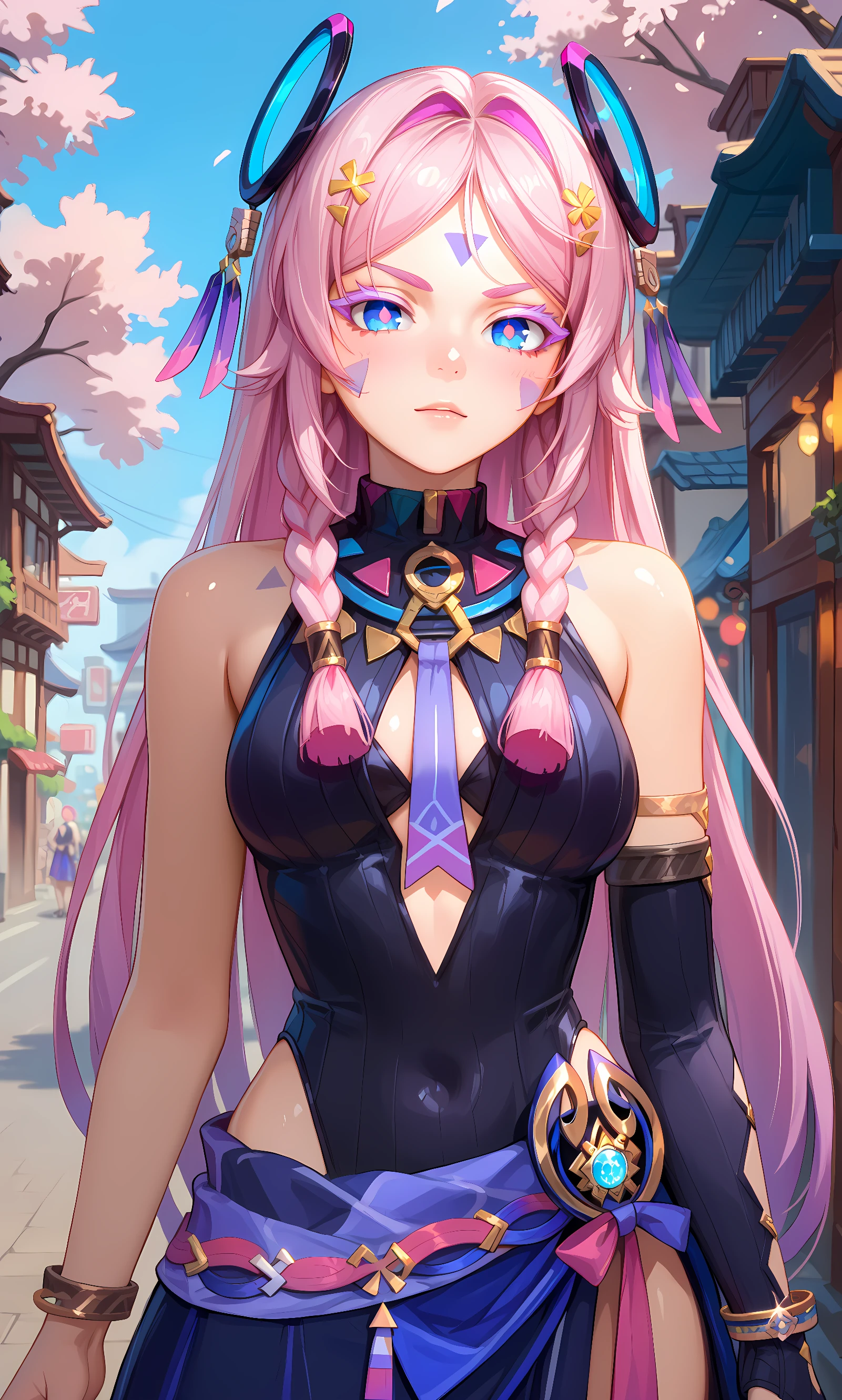 citlali, blue eyes, pink pupils, pink hair, very long hair, facial mark, forehead mark, ring hair ornament, leaf hair ornament, streaked hair, braid, colored eyelashes